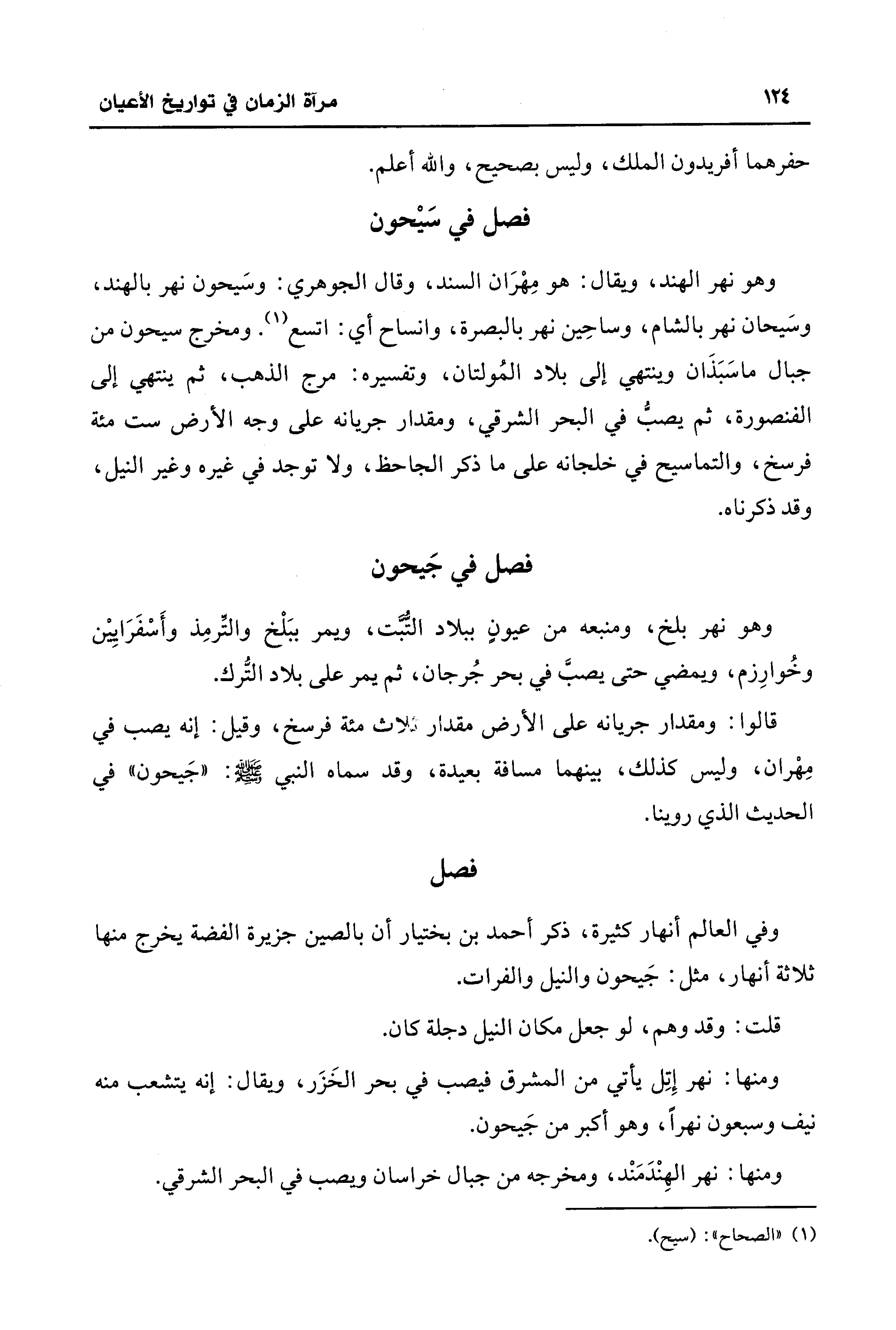 وهو نهر الهند، ويقال: هو مِهْرَان السند، وقال الجوهري: وسَيحون نهر بالهند، وسَيحان نهر بالشام، وساحِين نهر بالبصرة، وانساح أي: اتسع (¬1). ومخرج سيحون من جبال ماسَبَذَان وينتهي إلى بلاد المُولتان، وتفسيره: مرج الذهب، ثم ينتهي إلى الفنصورة، ثم يصبُّ في البحر الشرقي، ومقدار جريانه على وجه الأرض ست مئة فرسخ، والتماسيح في خلجانه على ما ذكر الجاحظ، ولا توجد في غيره وغير النيل، وقد ذكرناه.