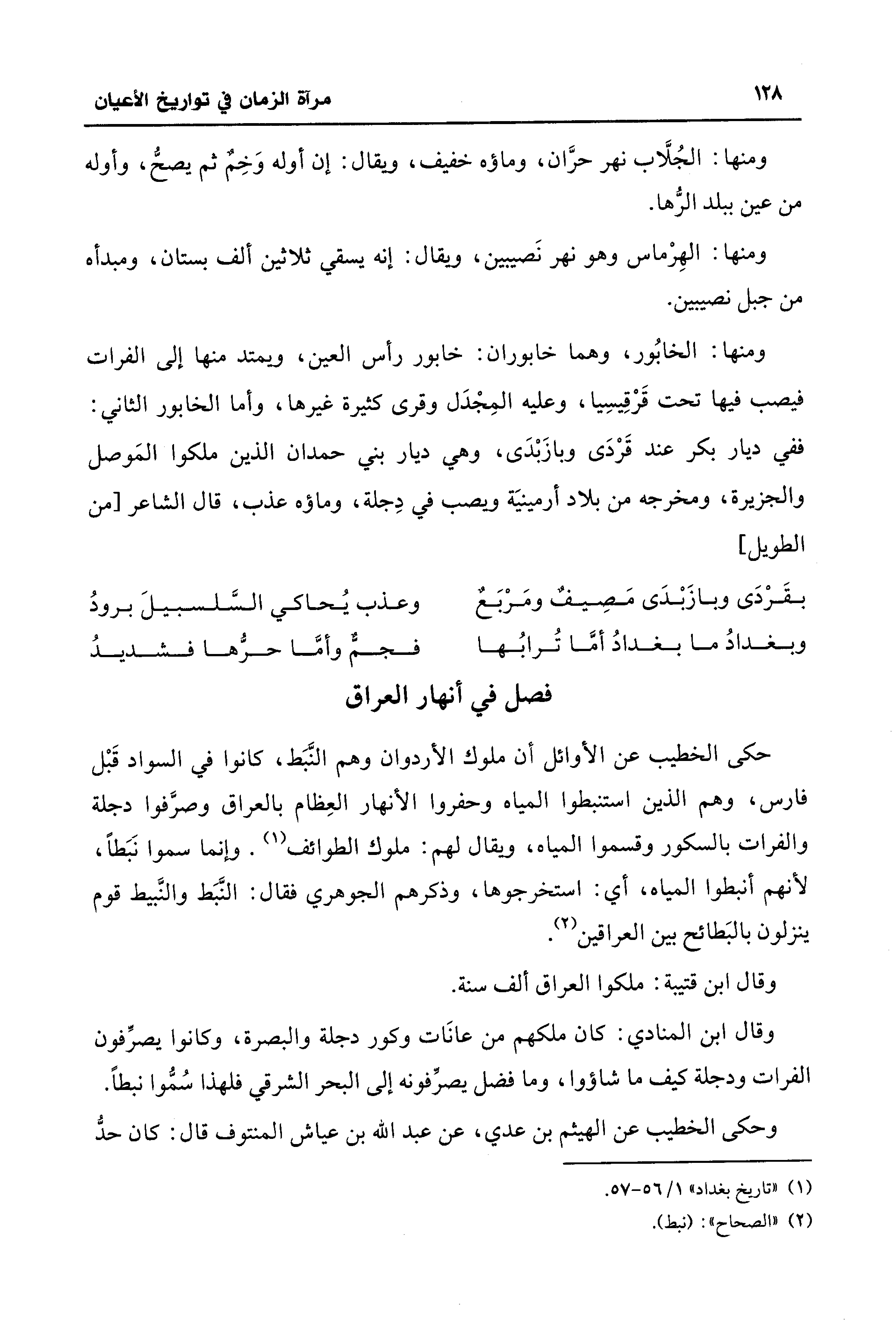 وقال ابن المنادي: كان ملكهم من عانَات وكور دجلة والبصرة، وكانوا يصرِّفون الفرات ودجلة كيف ما شاؤوا، وما فضل يصرِّفونه إلى البحر الشرقي فلهذا سُمُّوا نبطًا.