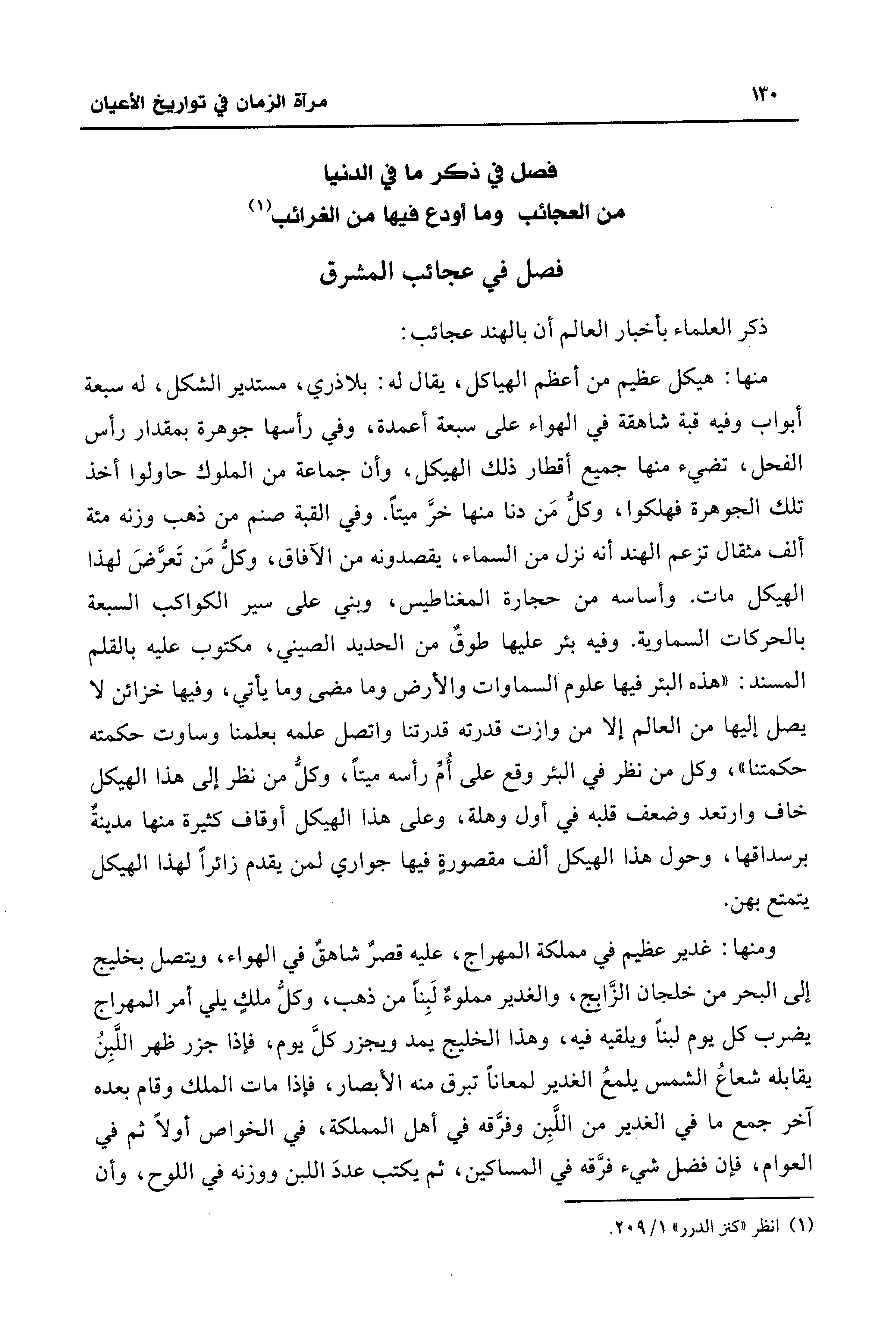 منها: هيكل عظيم من أعظم الهياكل، يقال له: بلاذري، مستدير الشكل، له سبعة أبواب وفيه قبة شاهقة في الهواء على سبعة أعمدة، وفي رأسها جوهرة بمقدار رأس الفحل، تضيء منها جميع أقطار ذلك الهيكل، وأن جماعة من الملوك حاولوا أخذ تلك الجوهرة فهلكوا، وكلُّ مَن دنا منها خرَّ ميتًا. وفي القبة صنم من ذهب وزنه مئة ألف مثقال تزعم الهند أنه نزل من السماء، يقصدونه من الآفاق، وكلُّ مَن تَعرَّضَ لهذا الهيكل مات. وأساسه من حجارة المغناطيس، وبني على سير الكواكب السبعة بالحركات السماوية. وفيه بئر عليها طوقٌ من الحديد الصيني، مكتوب عليه بالقلم المسند: "هذه البئر فيها علوم السماوات والأرض وما مضى وما يأتي، وفيها خزائن لا يصل إليها من العالم إلا من وازت قدرته قدرتنا واتصل علمه بعلمنا وساوت حكمته حكمتنا"، وكل من نظر في البئر وقع على أُمِّ رأسه ميتًا، وكلُّ من نظر إلى هذا الهيكل خاف وارتعد وضعف قلبه في أول وهلة، وعلى هذا الهيكل أوقاف كثيرة منها مدينةٌ برسداقها، وحول هذا الهيكل ألف مقصورةٍ فيها جواري لمن يقدم زائرًا لهذا الهيكل يتمتع بهن.