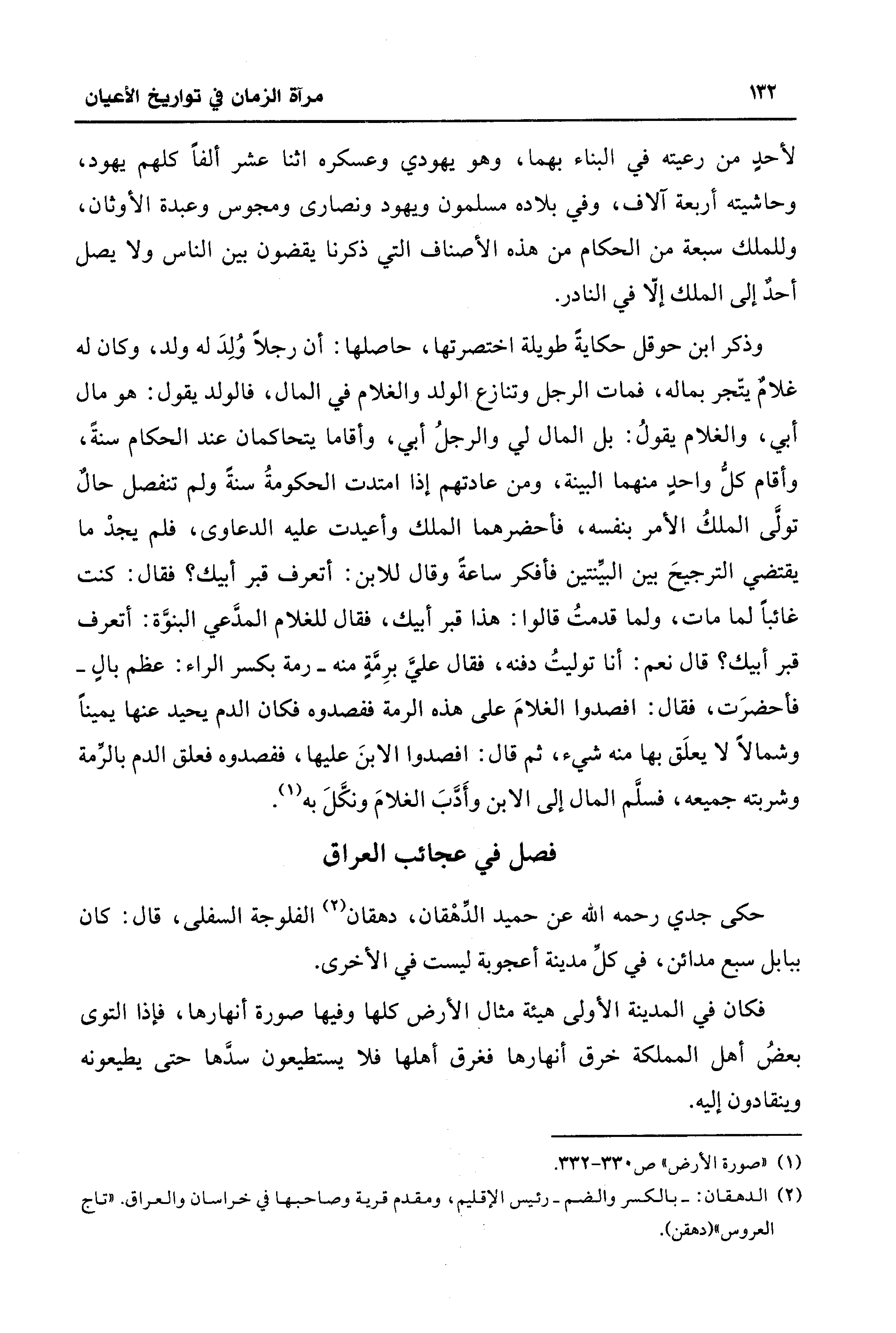 وذكر ابن حوقل حكايةً طويلة اختصرتها، حاصلها: أن رجلًا وُلدَ له ولد، وكان له غلامٌ يتّجر بماله، فمات الرجل وتنازع الولد والغلام في المال، فالولد يقول: هو مال أبي، والغلام يقولُ: بل المال لي والرجلُ أبي، وأقاما يتحاكمان عند الحكام سنة، وأقام كلُّ واحدٍ منهما البينة، ومن عادتهم إذا امتدت الحكومةُ سنةً ولم تنفصل حالٌ تولَّى الملكُ الأمر بنفسه، فأحضرهما الملك وأعيدت عليه الدعاوى، فلم يجدْ ما يقتضي الترجيحَ بين البيِّنتين فأفكر ساعة وقال للابن: أتعرف قبر أبيك؟ فقال: كنت غائبًا لما مات، ولما قدمتُ قالوا: هذا قبر أبيك، فقال للغلام المدَّعي البنوَّة: أتعرف قبر أبيك؟ قال نعم: أنا توليتُ دفنه، فقال عليَّ برِمَّةٍ منه -رمة بكسر الراء: عظم بالٍ- فأحضرَت، فقال: افصدوا الغلامَ على هذه الرمة ففصدوه فكان الدم يحيد عنها يمينًا وشمالًا لا يعلَق بها منه شيء، ثم قال: افصدوا الابنَ عليها، ففصدوه فعلق الدم بالرَّمة وشربته جميعه، فسلَّم المال إلى الابن وأَدَّبَ الغلامَ ونكَّلَ به (¬1).