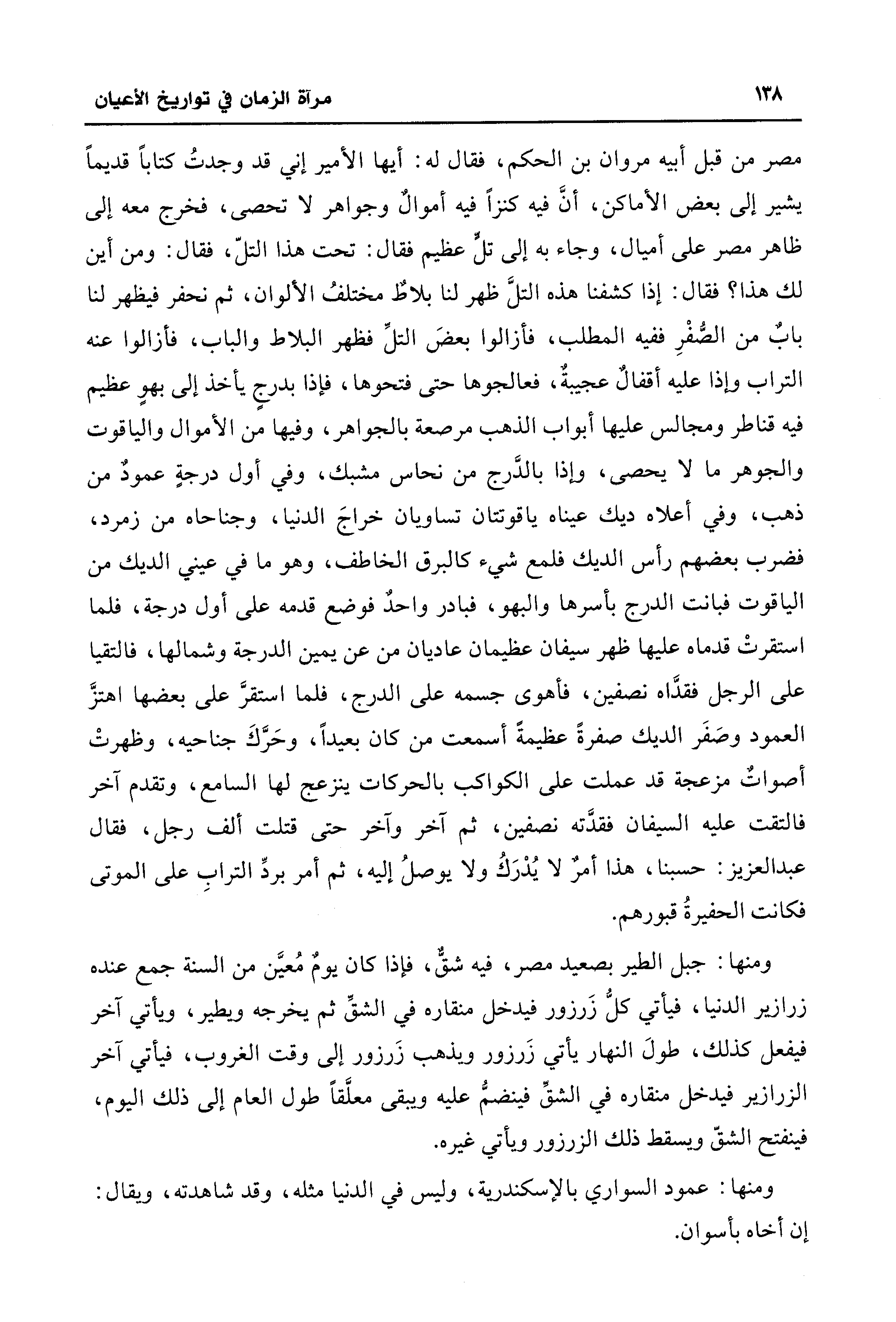 مصر من قبل أبيه مروان بن الحكم، فقال له: أيها الأمير إني قد وجدتُ كتابًا قديمًا يشير إلى بعض الأماكن، أنَّ فيه كنزًا فيه أموالٌ وجواهر لا تحصى، فخرج معه إلى ظاهر مصر على أميال، وجاء به إلى تلٍّ عظيم فقال: تحت هذا التلّ، فقال: ومن أين لك هذا؟ فقال: إذا كشفنا هذه التلَّ ظهر لنا بلاطٌ مختلفُ الألوان، ثم نحفر فيظهر لنا بابٌ من الصُّفْرِ ففيه المطلب، فأزالوا بعضَ التل فظهر البلاط والباب، فأزالوا عنه التراب وإذا عليه أقفالٌ عجيبةٌ، فعالجوها حتى فتحوها، فإذا بدرجٍ يأخذ إلى بهوٍ عظيم فيه قناطر ومجالس عليها أبواب الذهب مرصعة بالجواهر، وفيها من الأموال والياقوت والجوهر ما لا يحصى، وإذا بالدَّرج من نحاس مشبك، وفي أول درجةٍ عمودٌ من ذهب، وفي أعلاه ديك عيناه ياقوتتان تساويان خراجَ الدنيا، وجناحاه من زمرد، فضرب بعضهم رأس الديك فلمع شيء كالبرق الخاطف، وهو ما في عيني الديك من الياقوت فبانت الدرج بأسرها والبهو، فبادر واحدٌ فوضع قدمه على أول درجة، فلما استقرتْ قدماه عليها ظهر سيفان عظيمان عاديان من عن يمين الدرجة وشمالها، فالتقيا على الرجل فقدَّاه نصفين، فأهوى جسمه على الدرج، فلما استقرَّ على بعضها اهتزَّ العمود وصَفَر الديك صفرةً عظيمةً أسمعت من كان بعيدًا، وحَرَّكَ جناحيه، وظهرتْ أصواتٌ مزعجة قد عملت على الكواكب بالحركات ينزعج لها السامع، وتقدم آخر فالتقت عليه السيفان فقدَّته نصفين، ثم آخر وآخر حتى قتلت ألف رجل، فقال عبد العزيز: حسبنا، هذا أمرٌ لا يُدْرَكُ ولا يوصلُ إليه، ثم أمر بردِّ الترابِ على الموتى فكانت الحفيرةُ قبورهم.