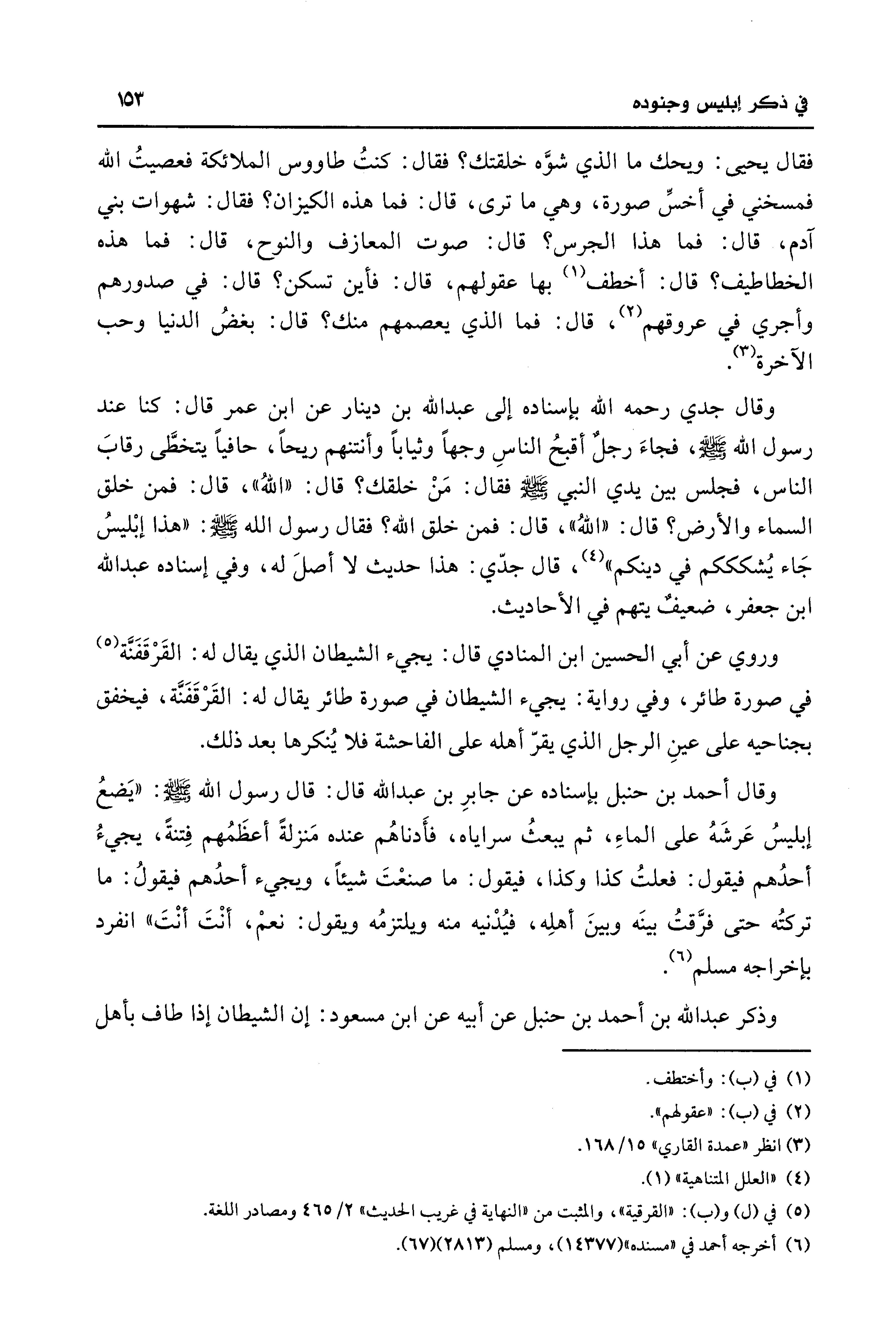 وذكر عبد الله بن أحمد بن حنبل عن أبيه عن ابن مسعود: إن الشيطان إذا طاف بأهل