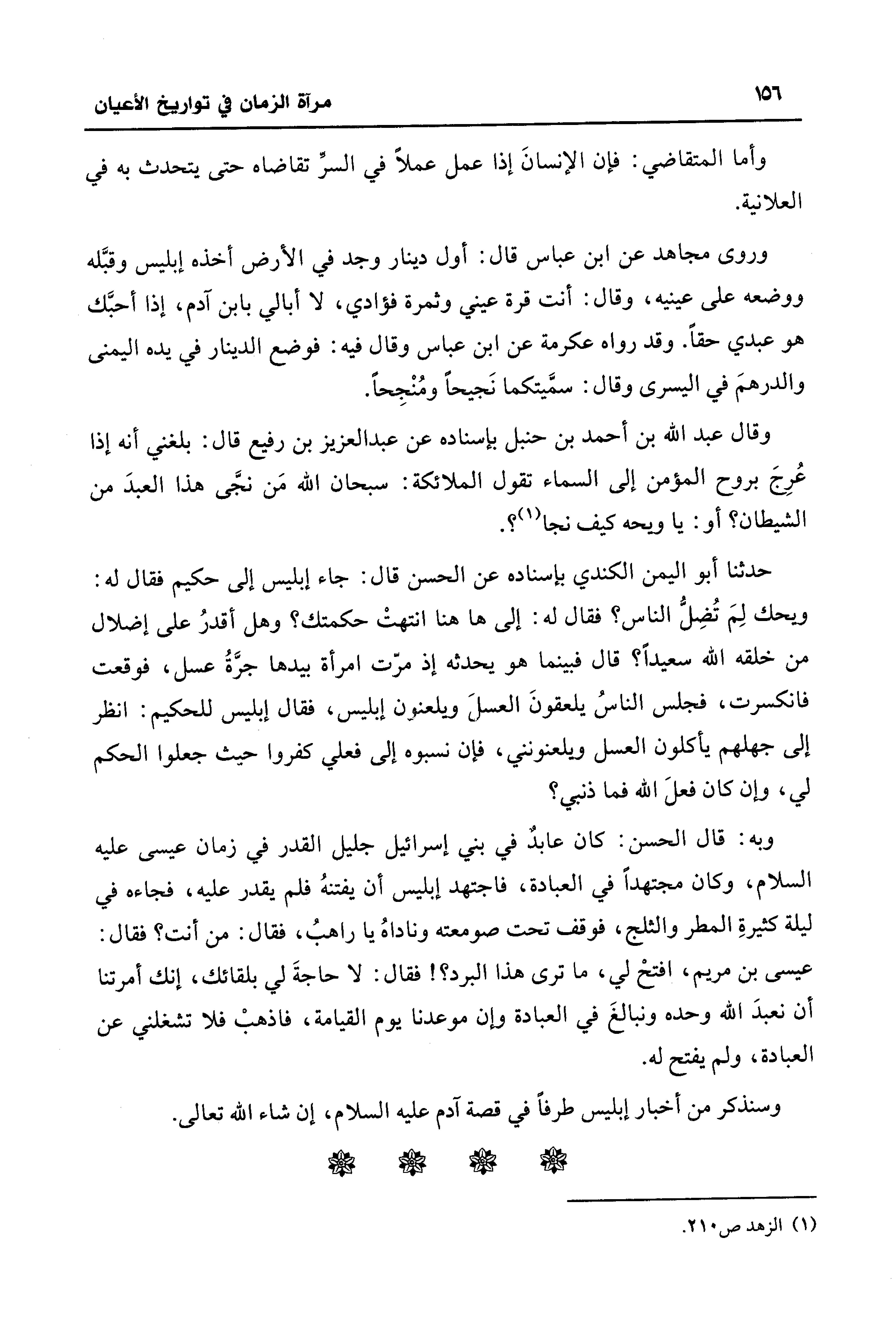 وبه: قال الحسن: كان عابدٌ في بني إسرائيل جليل القدر في زمان عيسى عليه السلام، وكان مجتهدًا في العبادة، فاجتهد إبليس أن يفتنهُ فلم يقدر عليه، فجاءه في ليلة كثيرةِ المطر والثلج، فوقف تحت صومعته وناداهُ يا راهبُ، فقال: من أنت؟ فقال: عيسى بن مريم، افتحْ لي، ما ترى هذا البرد؟ ! فقال: لا حاجةَ لي بلقائك، إنك أمرتنا أن نعبدَ الله وحده ونبالغَ في العبادة وإن موعدنا يوم القيامة، فاذهبْ فلا تشغلني عن العبادة، ولم يفتح له.