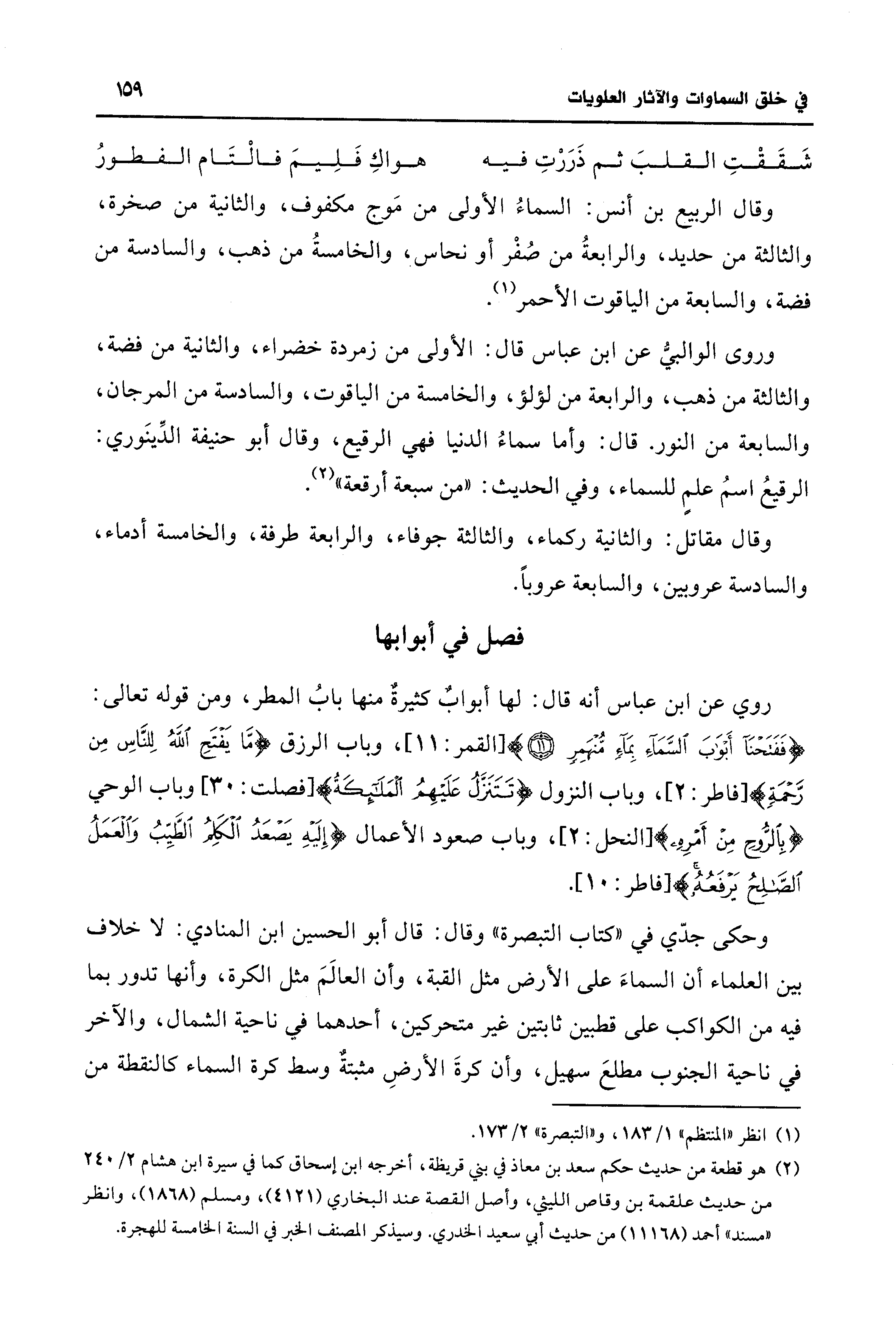 وروى الوالبيُّ عن ابن عباس قال: الأولى من زمردة خضراء، والثانية من فضة، والثالثة من ذهب، والرابعة من لؤلؤ، والخامسة من الياقوت، والسادسة من المرجان، والسابعة من النور. قال: وأما سماءُ الدنيا فهي الرقيع، وقال أبو حنيفة الدِّينَوري: الرقيعُ اسمُ علمِ للسماء، وفي الحديث: "من سبعة أرقعة" (¬2).