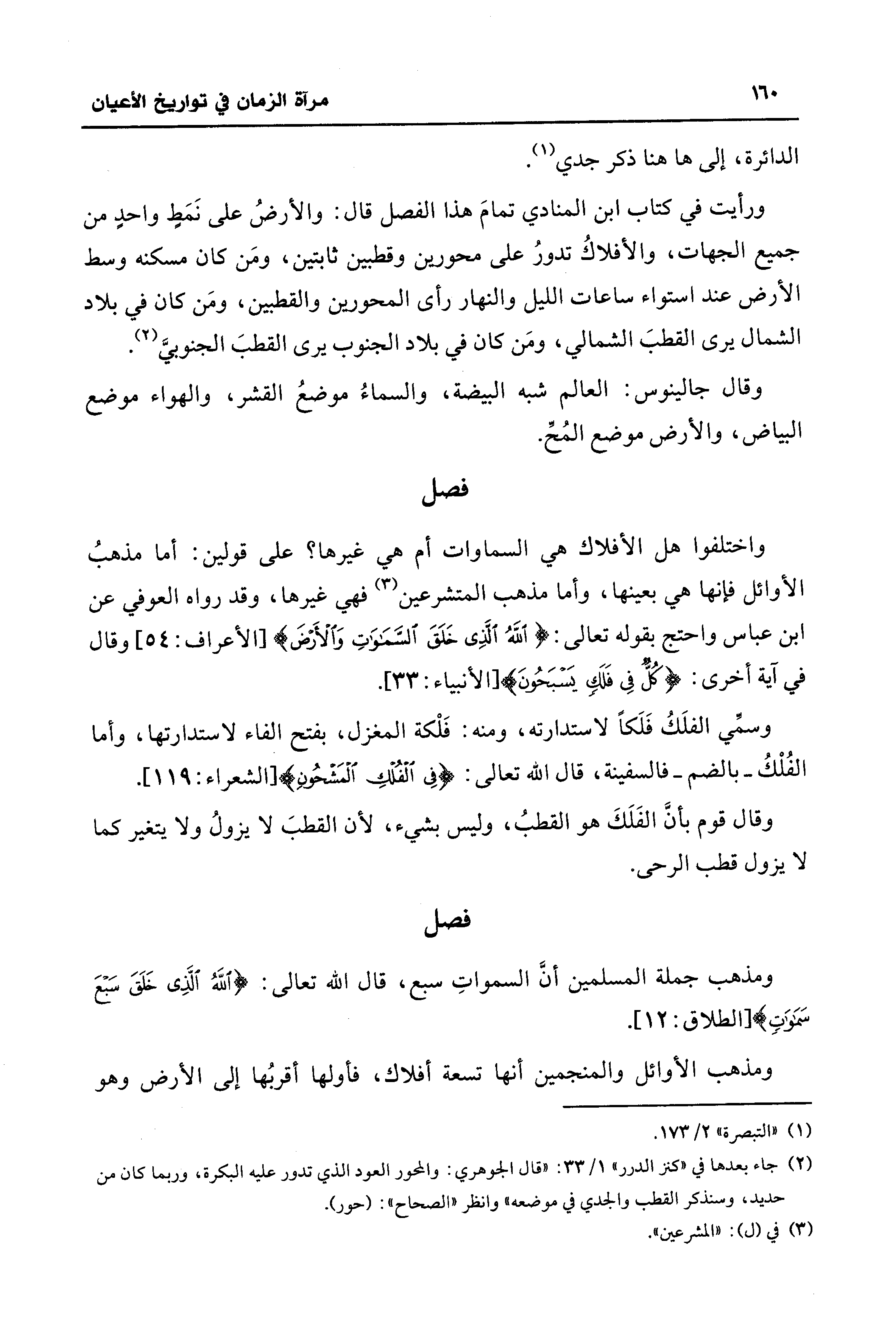 ورأيت في كتاب ابن المنادي تمامَ هذا الفصل قال: والأرضُ على نَمَطٍ واحدٍ من جميع الجهات، والأفلاكُ تدورُ على محورين وقطبين ثابتين، ومَن كان مسكنه وسط الأرض عند استواء ساعات الليل والنهار رأى المحورين والقطبين، ومَن كان في بلاد الشمال يرى القطبَ الشمالي، ومَن كان في بلاد الجنوب يرى القطبَ الجنوبيَّ (¬2).