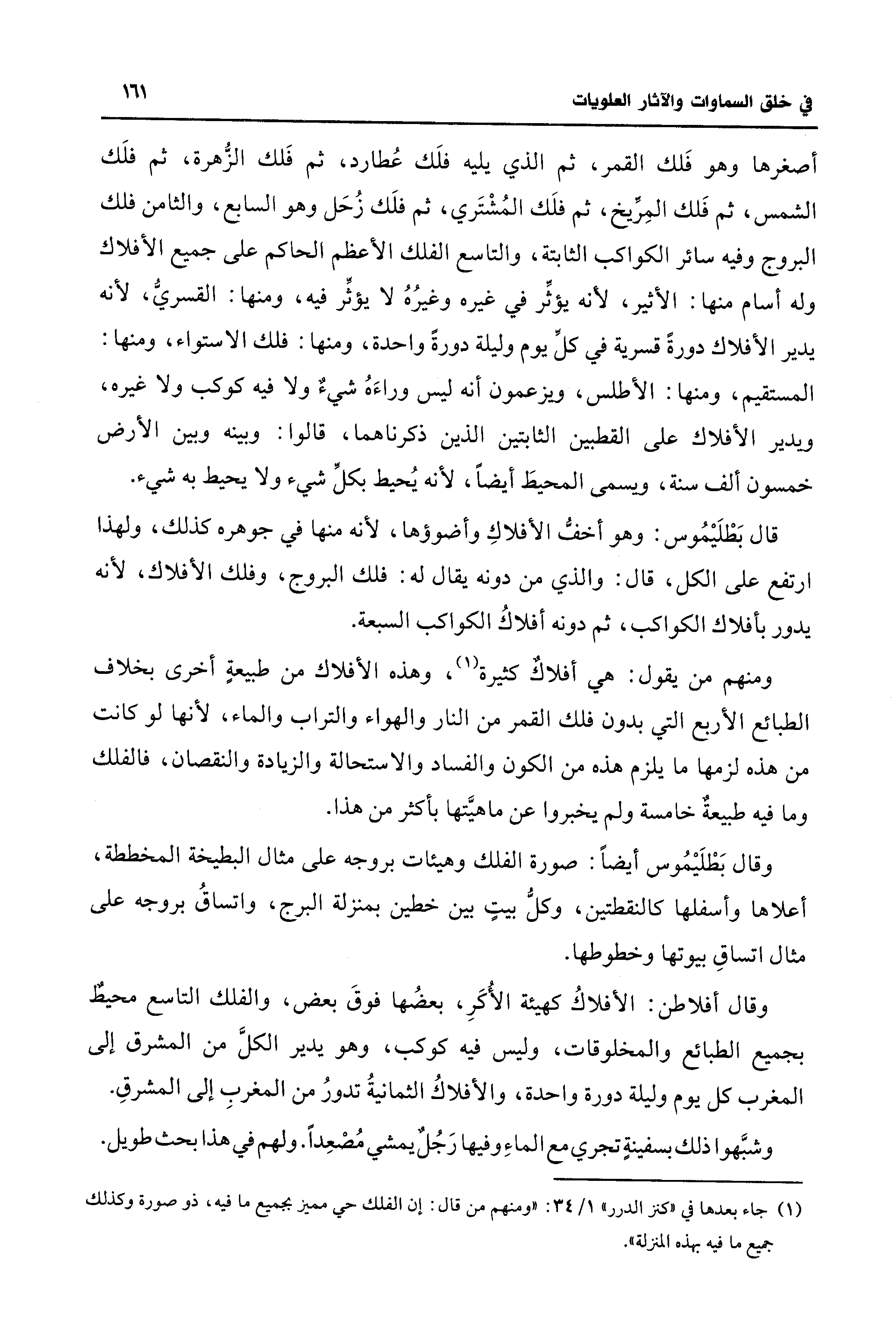 (¬1) جاء بعدها في "كنز الدرر" 1/ 34: "ومنهم من قال: إن الفلك حي مميز بجميع ما فيه، ذو صورة وكذلك جميع ما فيه بهذه المنزلة".