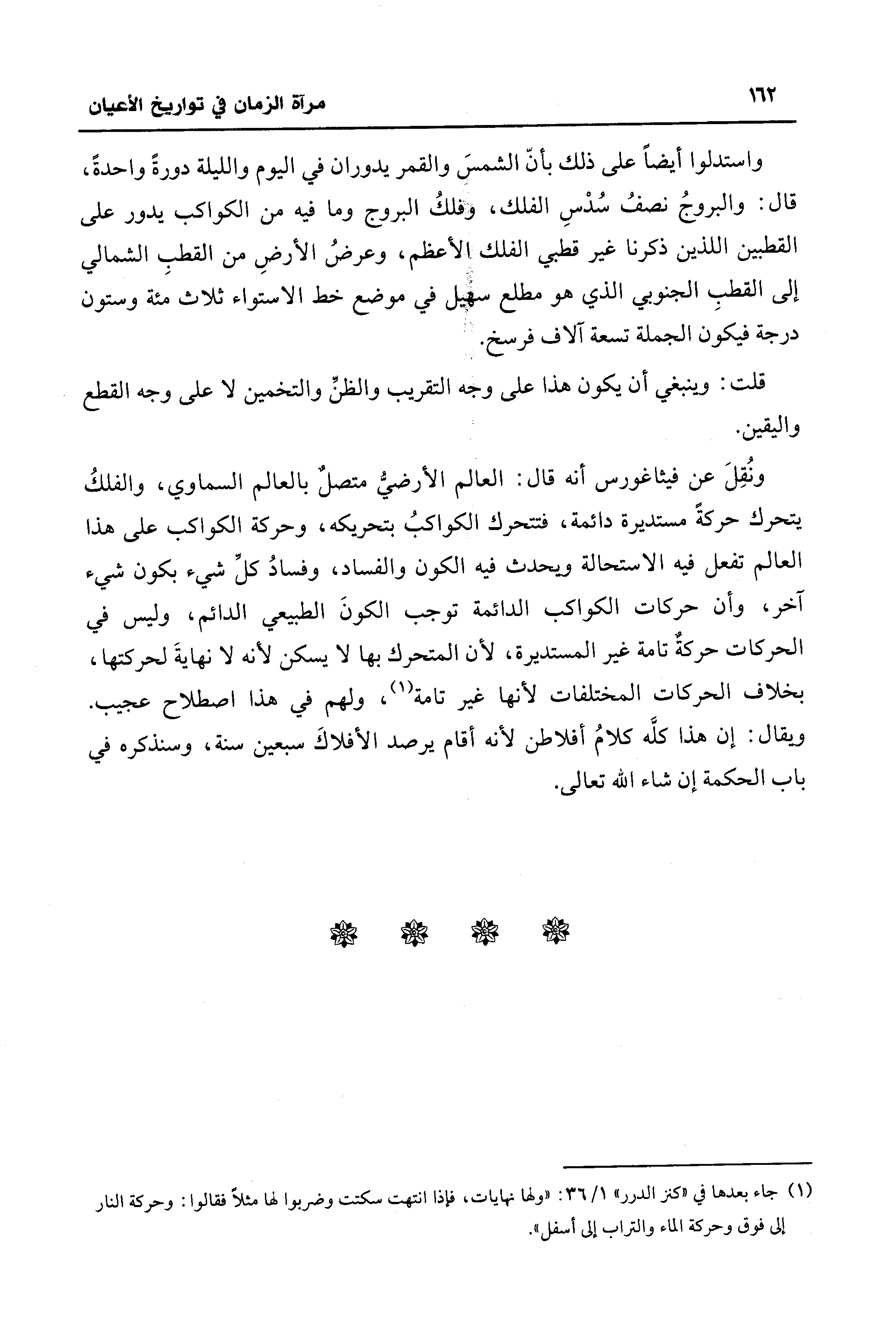 ونُقِلَ عن فيثاغورس أنه قال: العالم الأرضيُّ متصلٌ بالعالم السماوي، والفلكُ يتحرك حركةً مستديرة دائمة، فتتحرك الكواكبُ بتحريكه، وحركة الكواكب على هذا العالم تفعل فيه الاستحالة ويحدث فيه الكون والفساد، وفسادُ كلِّ شيء بكون شيء آخر، وأن حركات الكواكب الدائمة توجب الكونَ الطبيعي الدائم، وليس في الحركات حركةٌ تامة غير المستديرة، لأن المتحرك بها لا يسكن لأنه لا نهايةَ لحركتها، بخلاف الحركات المختلفات لأنها غير تامة (¬1)، ولهم في هذا اصطلاح عجيب. ويقال: إن هذا كلَّه كلامُ أفلاطن لأنه أقام يرصد الأفلاكَ سبعين سنة، وسنذكره في باب الحكمة إن شاء الله تعالى.