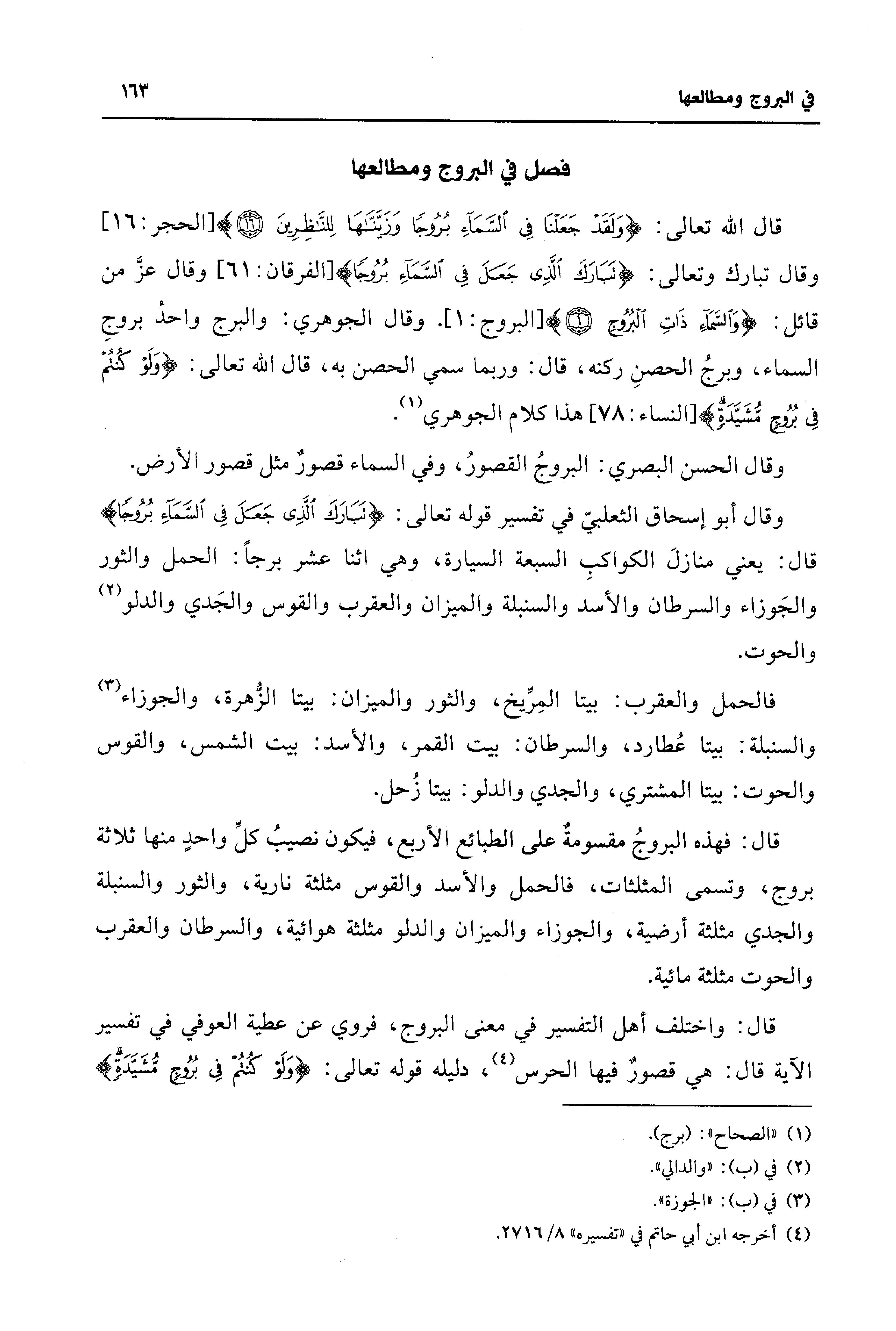 وقال أبو إسحاق الثعلبيّ في تفسير قوله تعالى: {تَبَارَكَ الَّذِي جَعَلَ فِي السَّمَاءِ بُرُوجًا} قال: يعني منازلَ الكواكبِ السبعة السيارة، وهي اثنا عشر برجًا: الحمل والثور والجَوزاء والسرطان والأسد والسنبلة والميزان والعقرب والقوس والجَدي والدلو (¬2) والحوت.