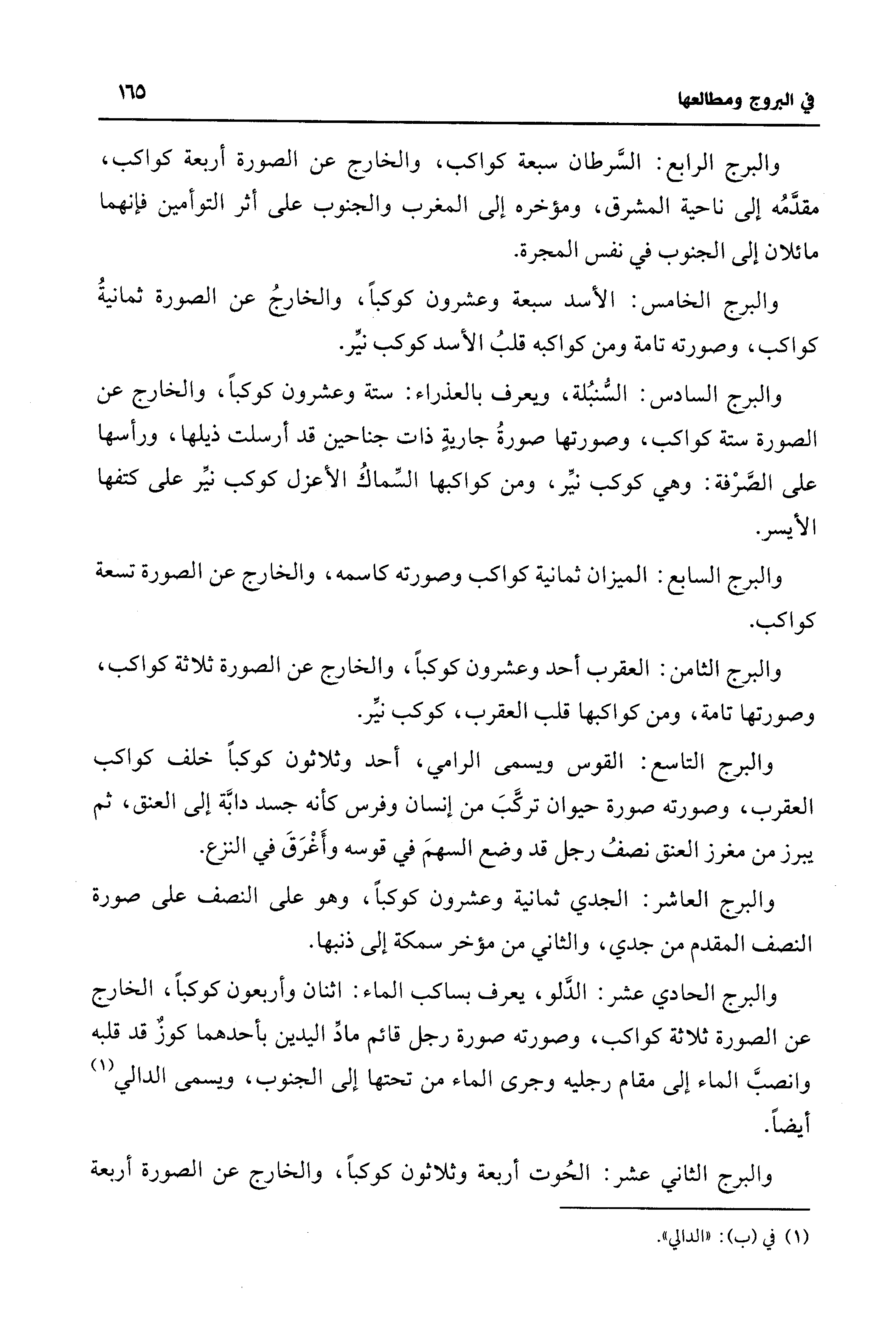 والبرج الخامس: الأسد سبعة وعشرون كوكبًا، والخارجُ عن الصورة ثمانيةُ كواكب، وصورته تامة ومن كواكبه قلبُ الأسد كوكب نيِّر.