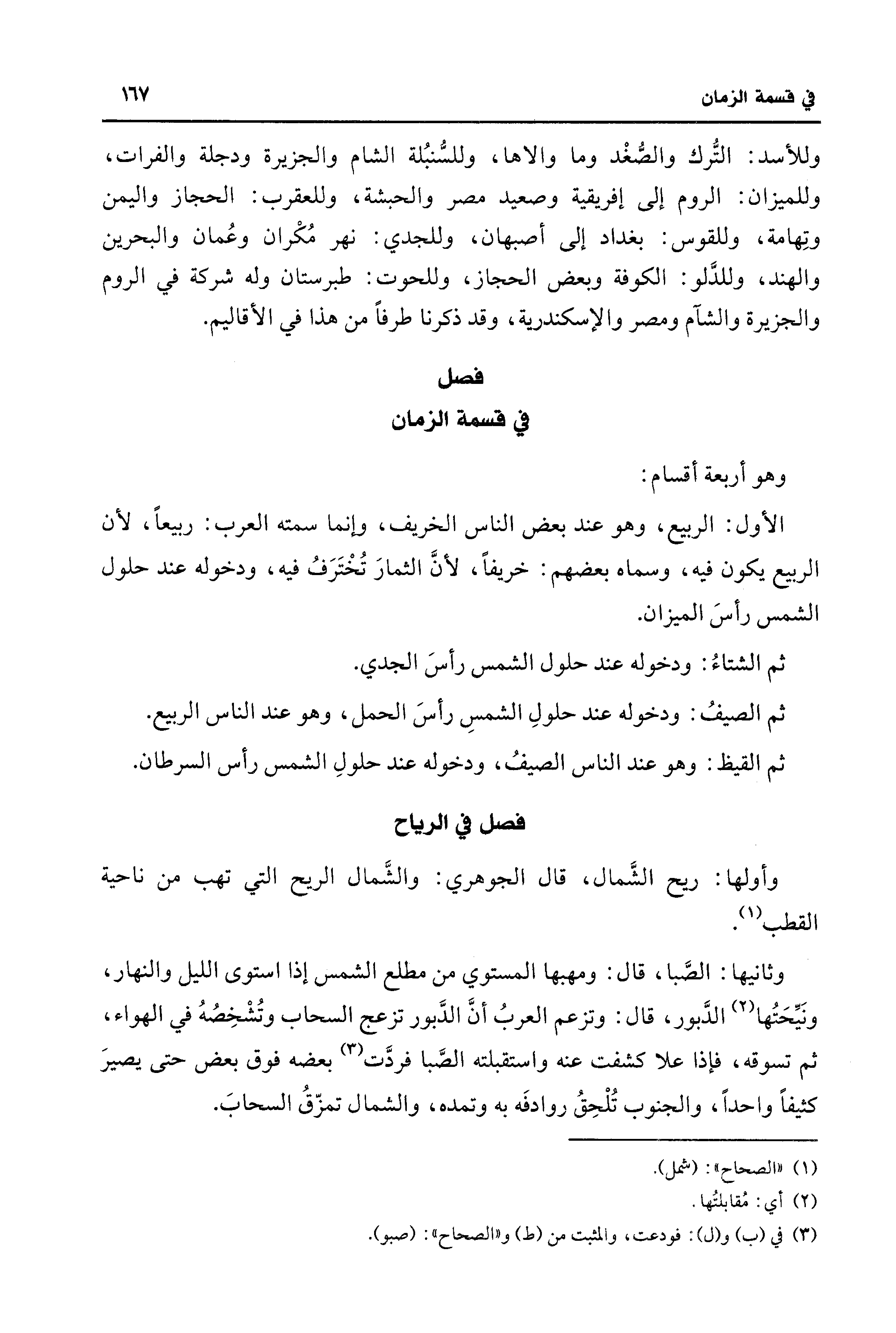 وثانيها: الصَّبا، قال: ومهبها المستوي من مطلع الشمس إذا استوى الليل والنهار، ونَيِّحَتُها (¬2) الدَّبور، قال: وتزعم العربُ أنَّ الدَّبور تزعج السحاب وتُشْخِصُهُ في الهواء، ثم تسوقه، فإذا علا كشفت عنه واستقبلته الصَّبا فردَّت (¬3) يعضه فوق بعض حتى يصيرَ كثيفًا واحدًا، والجنوب تلْحِقُ روادفَه به وتمده، والشمال تمزّقُ السحابَ.