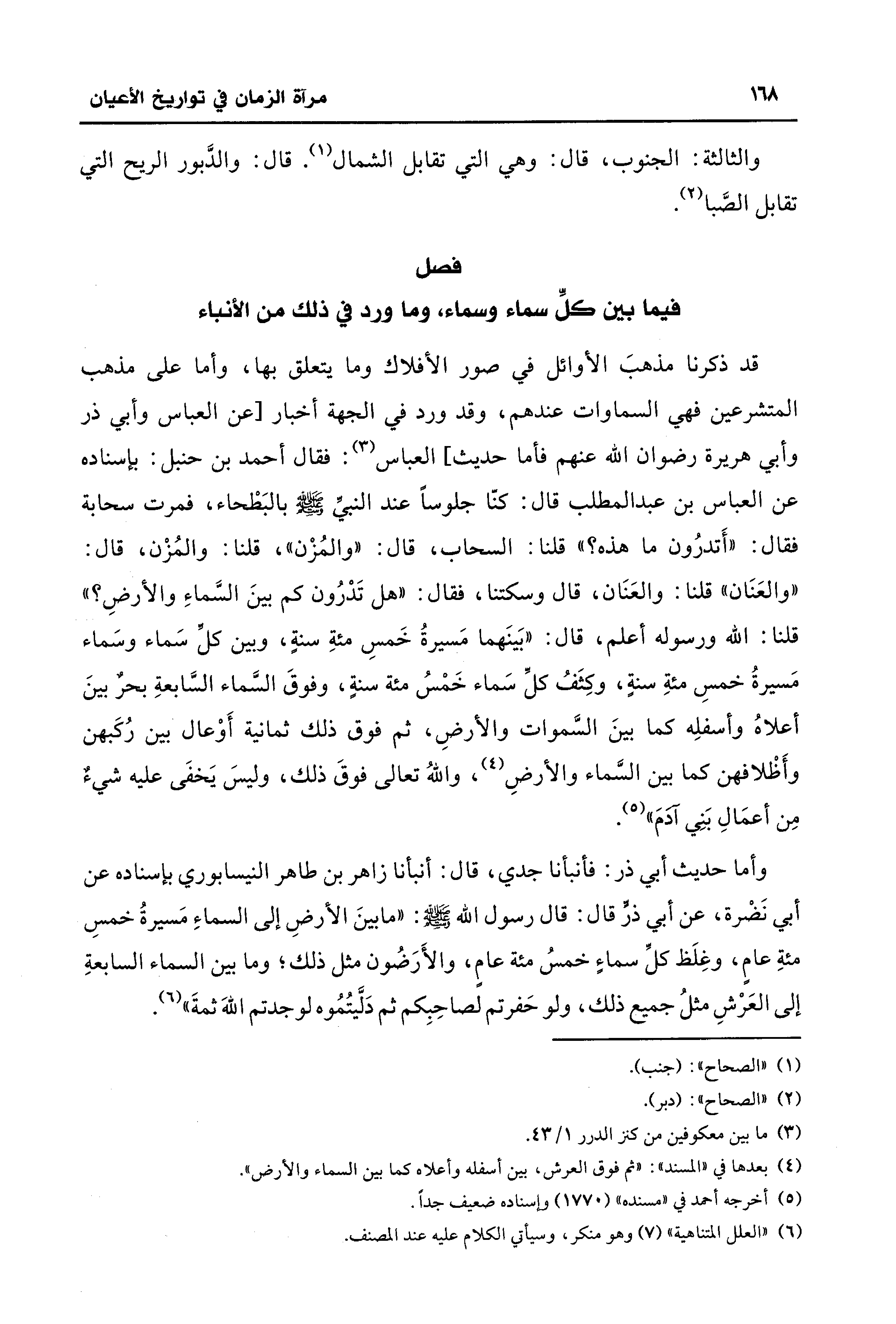قد ذكرنا مذهبَ الأوائل في صور الأفلاك وما يتعلق بها، وأما على مذهب المتشرعين فهي السماوات عندهم، وقد ورد في الجهة أخبار [عن العباس وأبي ذر وأبي هريرة رضوان الله عنهم فأما حديث] العباس (¬3): فقال أحمد بن حنبل: بإسناده عن العباس بن عبد المطلب قال: كنّا جلوسًا عند النبيِّ - صلى الله عليه وسلم - بالبَطْحاء، فمرت سحابة فقال: "أَتدرُون ما هذه؟ " قلنا: السحاب، قال: "والمُزْن"، قلنا: والمُزْن، قال: "والعَنَان" قلنا: والعَنَان، قال وسكتنا، فقال: "هل تَدْرُون كم بينَ السَّماءِ والأرضِ؟ " قلنا: الله ورسوله أعلم، قال: "بَينَهما مَسيرةُ خَمسِ مئةِ سنةٍ، وبين كلِّ سَماء وسَماء مَسيرةُ خمسِ مئةِ سنةٍ، وكِثَفُ كلِّ سَماء خَمْسُ مئة سنةٍ، وفوقَ السَّماء السَّابعةِ بحرٌ بينَ أعلاهُ وأسفلِه كما بينَ السَّموات والأرضِ، ثم فوق ذلك ثمانية أَوْعال بين رُكَبهن وأَظْلافهن كما بين السَّماء والأرضِ (¬4)، واللهُ تعالى فوقَ ذلك، وليسَ يَخفَى عليه شيءٌ مِن أعمَالِ بَنِي آدمَ" (¬5).