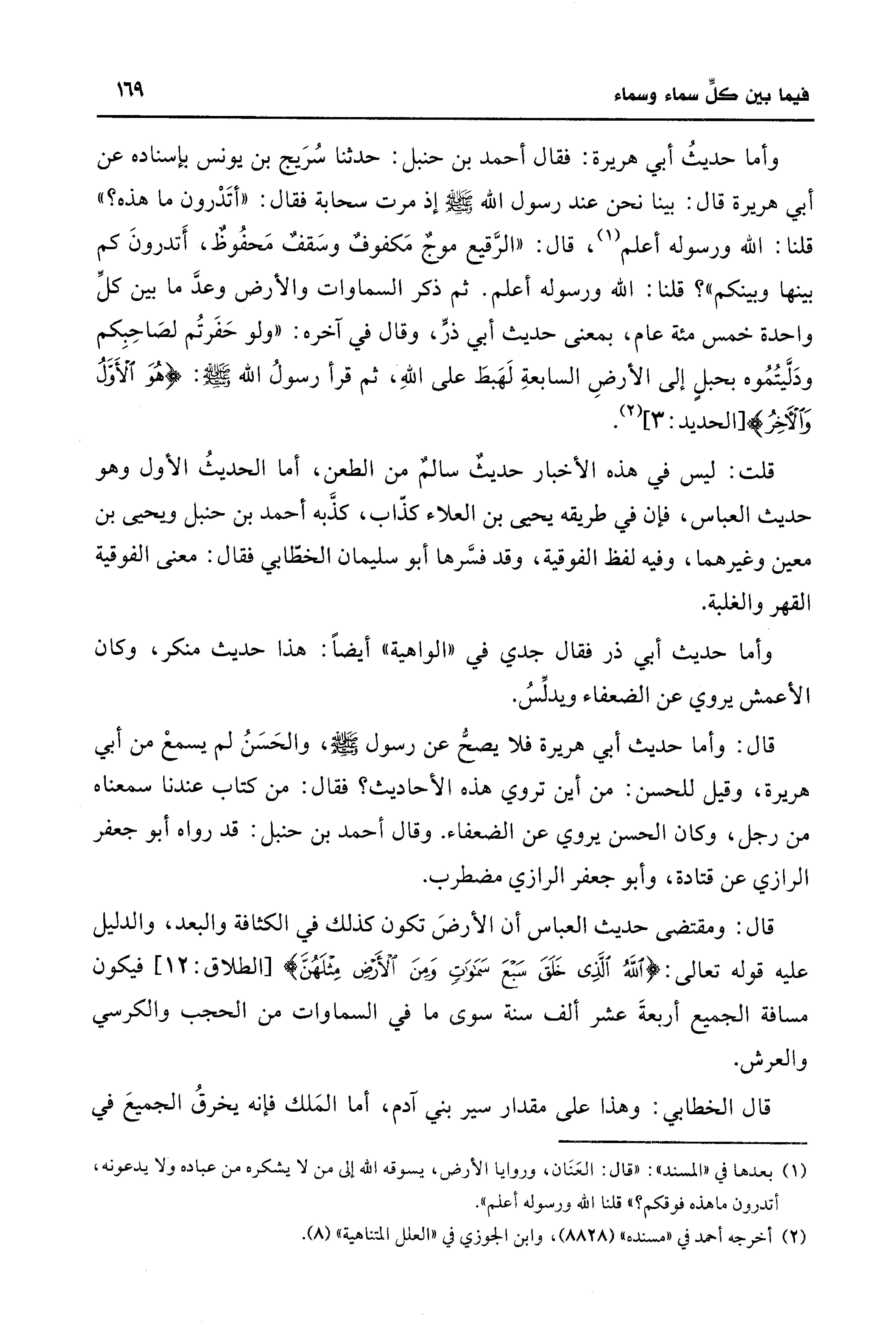 وأما حديثُ أبي هريرة: فقال أحمد بن حنبل: حدثنا سُريج بن يونس بإسناده عن أبي هريرة قال: بينا نحن عند رسول الله - صلى الله عليه وسلم - إذ مرت سحابة فقال: "أتَدْرون ما هذه؟ " قلنا: الله ورسوله أعلم (¬1)، قال: "الرَّقيع موج مَكفوفٌ وسَقفٌ مَحفُوظٌ، أَتدرونَ كم بينها وبينكم"؟ قلنا: الله ورسوله أعلم. ثم ذكر السماوات والأرض وعدَّ ما بين كلِّ واحدة خمس مئة عام، بمعنى حديث أبي ذرٍّ، وقال في آخره: "ولو حَفَرتُم لصَاحِبِكم ودَلَّيتُمُوه بحبلٍ إلى الأرض السابعةِ لَهَبطَ على اللهِ، ثم قرأ رسولُ الله - صلى الله عليه وسلم -: {هُوَ الْأَوَّلُ وَالْآخِرُ} [الحديد: 3] (¬2).