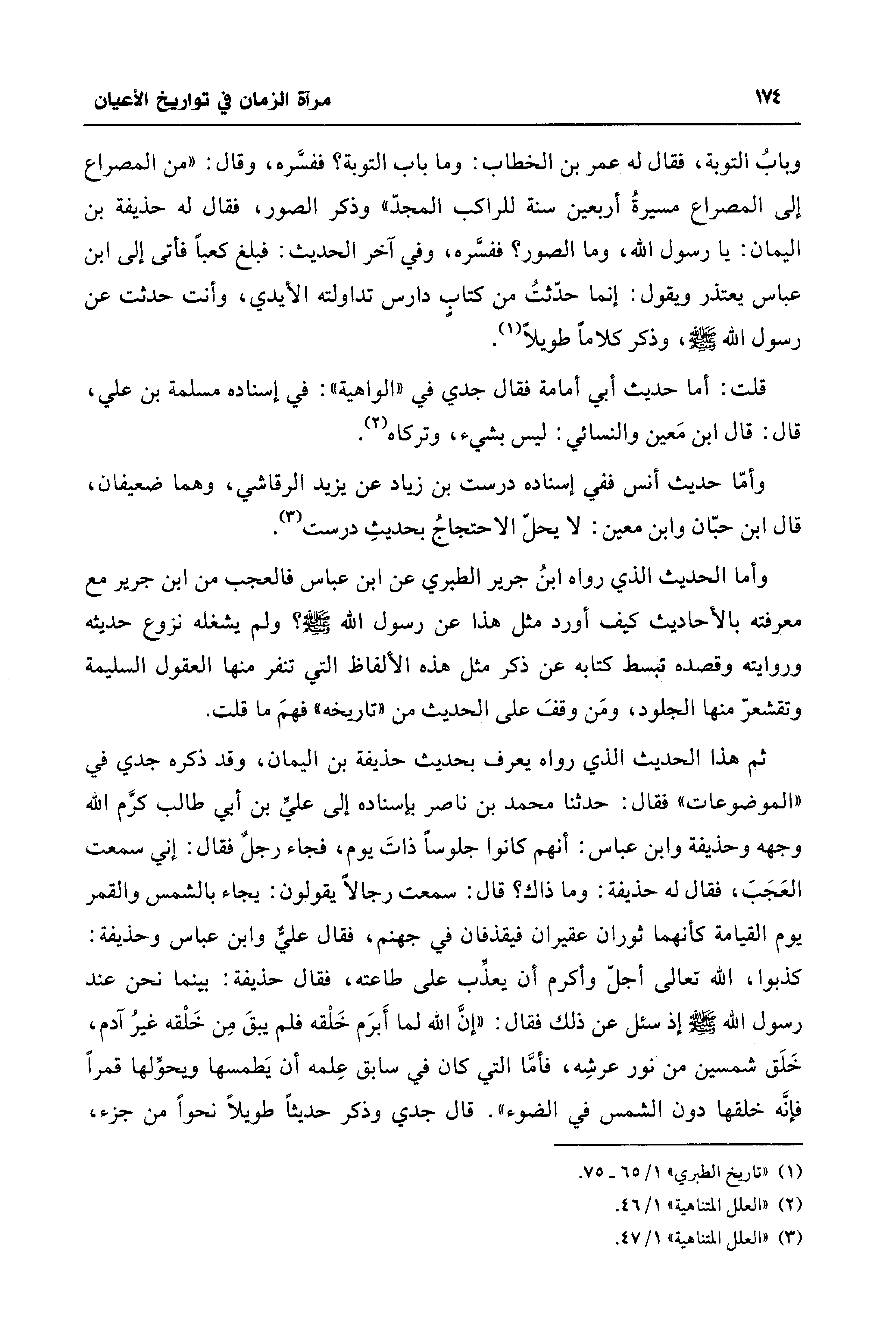 ثم هذا الحديث الذي رواه يعرف بحديث حذيفة بن اليمان، وقد ذكره جدي في "الموضوعات" فقال: حدثنا محمد بن ناصر بإسناده إلى علي بن أبي طالب كرم الله وجهه وحذيفة وابن عباس: أنهم كانوا جلوسًا ذاتَ يوم، فجاء رجلٌ فقال: إني سمعت العَجَبَ، فقال له حذيفة: وما ذاك؟ قال: سمعت رجالًا يقولون: يجاء بالشمس والقمر يوم القيامة كأنهما ثوران عقيران فيقذفان في جهنم، فقال عليّ وابن عباس وحذيفة: كذبوا، الله تعالى أجلّ وأكرم أن يعذب على طاعته، فقال حذيفة: بينما نحن عند رسول الله - صلى الله عليه وسلم - إذ سئل عن ذلك فقال: "إنَّ الله لما أَبرَم خَلْقه فلم يبقَ مِن خَلْقه غيرُ آدم، خَلَق شمسين من نور عرشِه، فأمَّا التي كان في سابق عِلمه أن يَطمسها ويحوِّلها قمرًا فإنَّه خلقها دون الشمس في الضوء". قال جدي وذكر حديثًا طويلًا نحوًا من جزء،