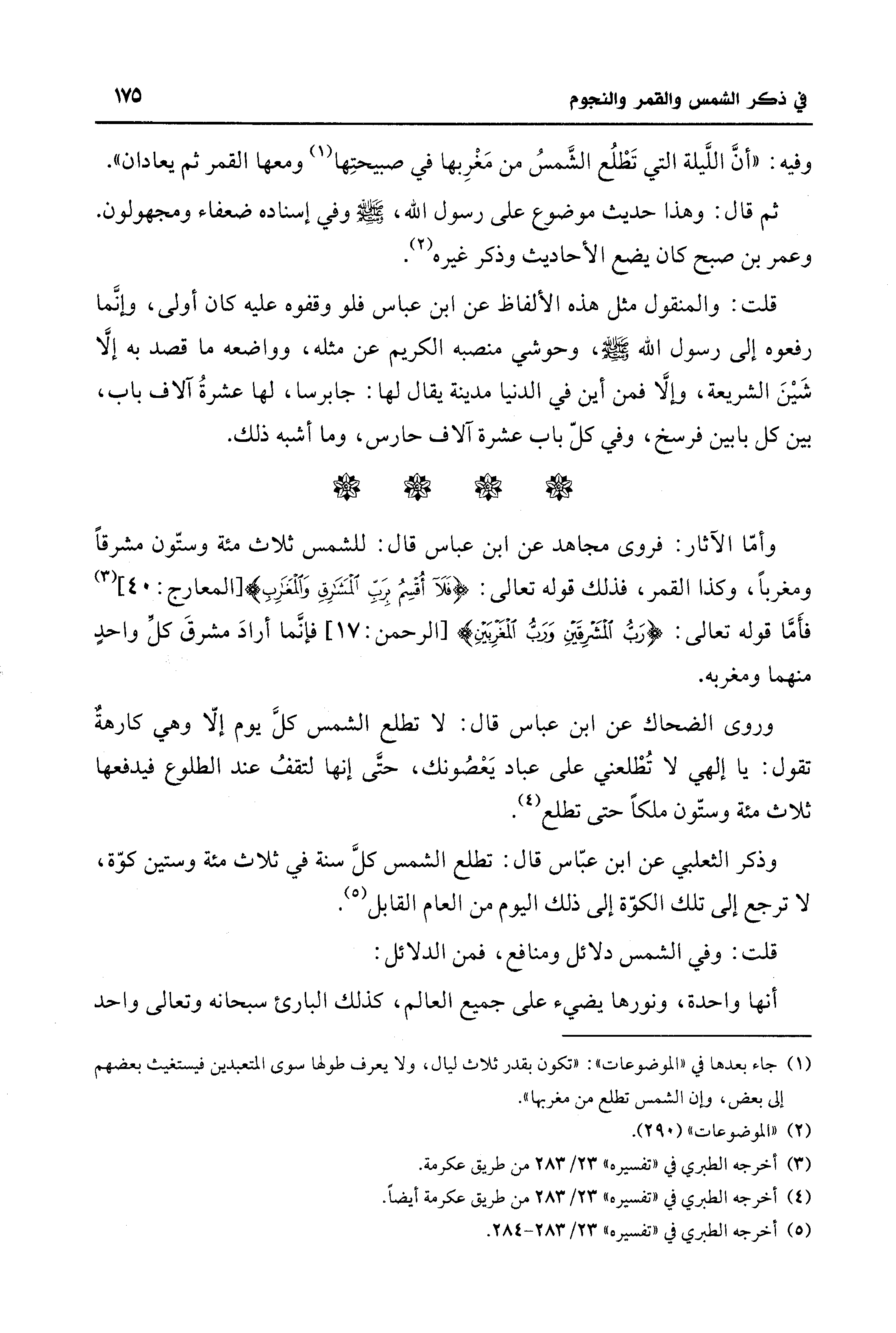 وذكر الثعلبي عن ابن عبّاس قال: تطلع الشمس كلَّ سنة في ثلاث مئة وستين كوّة، لا ترجع إلى تلك الكوّة إلى ذلك اليوم من العام القابل (¬5).