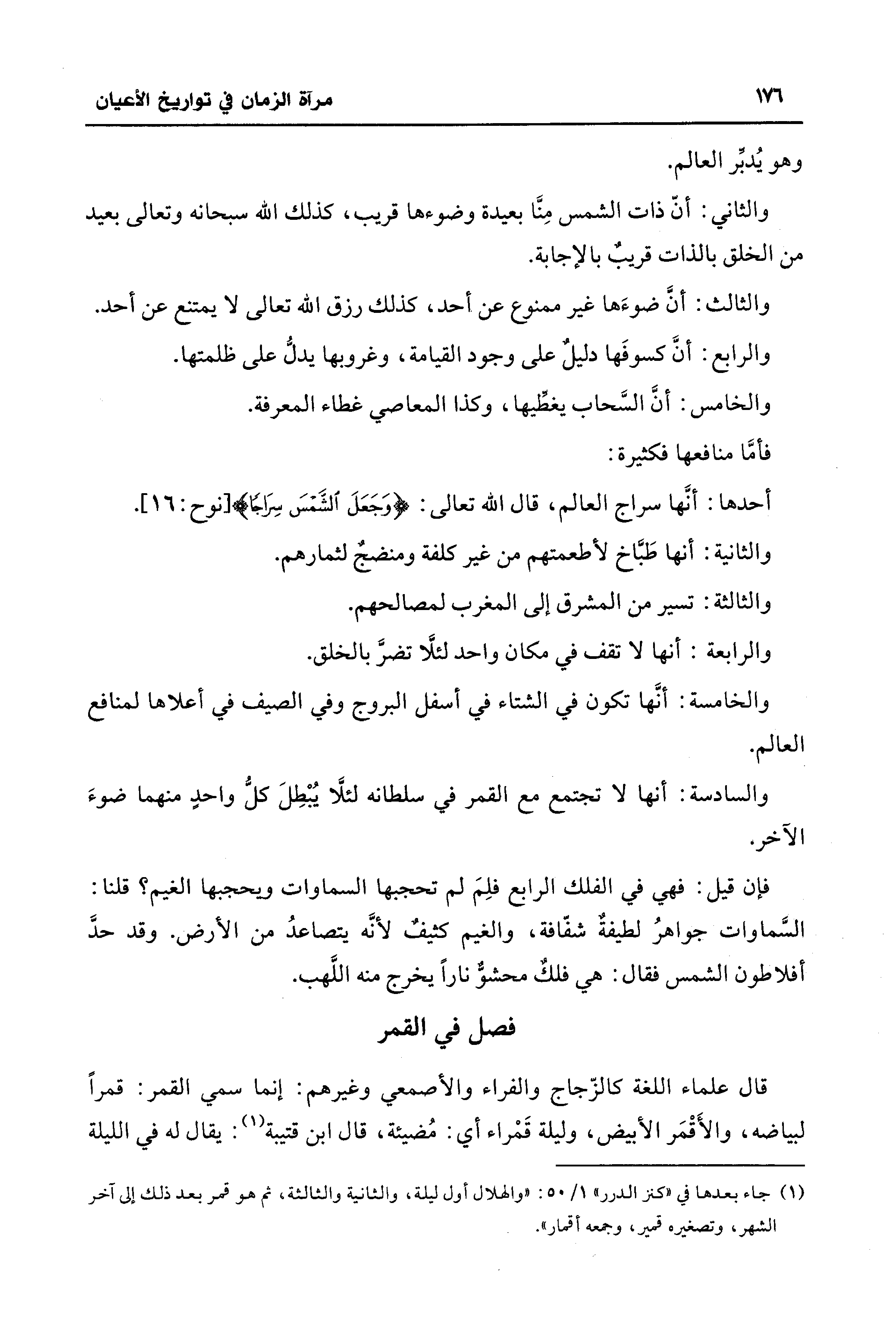 فإن قيل: فهي في الفلك الرابع فلِمَ لم تحجبها السماوات ويحجبها الغيم؟ قلنا: السَّماوات جواهرُ لطيفةٌ شفّافة، والغيم كثيفٌ لأنَّه يتصاعدُ من الأرض. وقد حدَّ أفلاطون الشمس فقال: هي فلكٌ محشوٌّ نارًا يخرج منه اللَّهب.