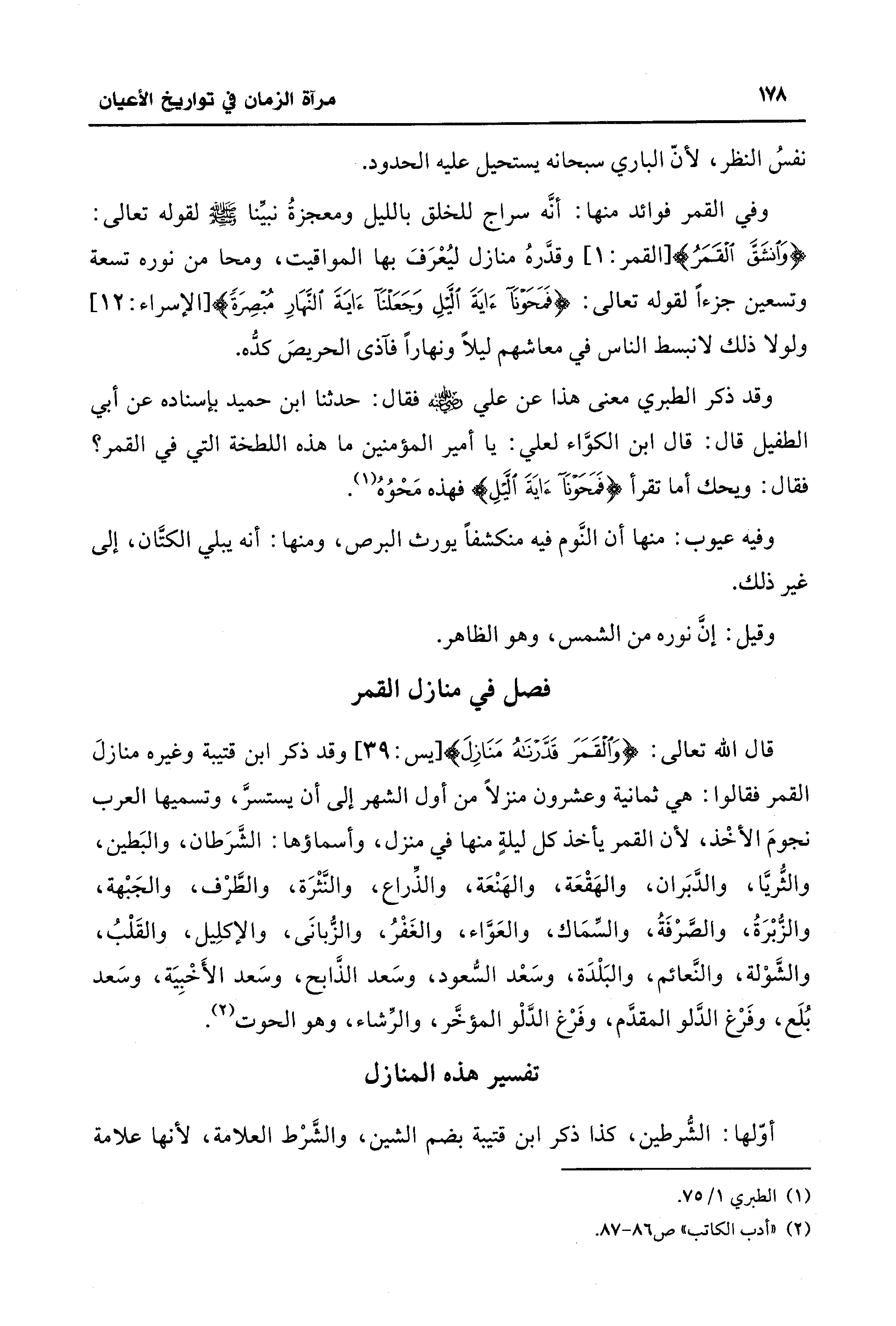 قال الله تعالى: {وَالْقَمَرَ قَدَّرْنَاهُ مَنَازِلَ} [يس: 39] وقد ذكر ابن قتيبة وغيره منازلَ القمر فقالوا: هي ثمانية وعشرون منزلًا من أول الشهر إلى أن يستسرَّ، وتسميها العرب نجومَ الأخْذ، لأن القمر يأخذ كل ليلةٍ منها في منزل، وأسماؤها: الشَّرَطان، والبَطين، والثُّريَّا، والدَّبَران، والهَقْعَة، والهَنْعَة، والذِّراع، والنَّثْرَة، والطَّرْف، والجَبْهة، والزُّبْرَةُ، والصَّرْفَةُ، والسِّمَاك، والعَوَّاء، والغَفْرُ، والزُّبانَى، والإكلِيل، والقَلْبُ، والشَّوْلة، والنَّعائم، والبَلْدَة، وسَعْد السُّعود، وسَعد الذَّابح، وسَعد الأَخْبِيَة، وسَعد بُلَع، وفَرْغ الدَّلو المقدَّم، وفَرْغ الدَّلْو المؤخَّر، والرِّشاء، وهو الحوت (¬2).