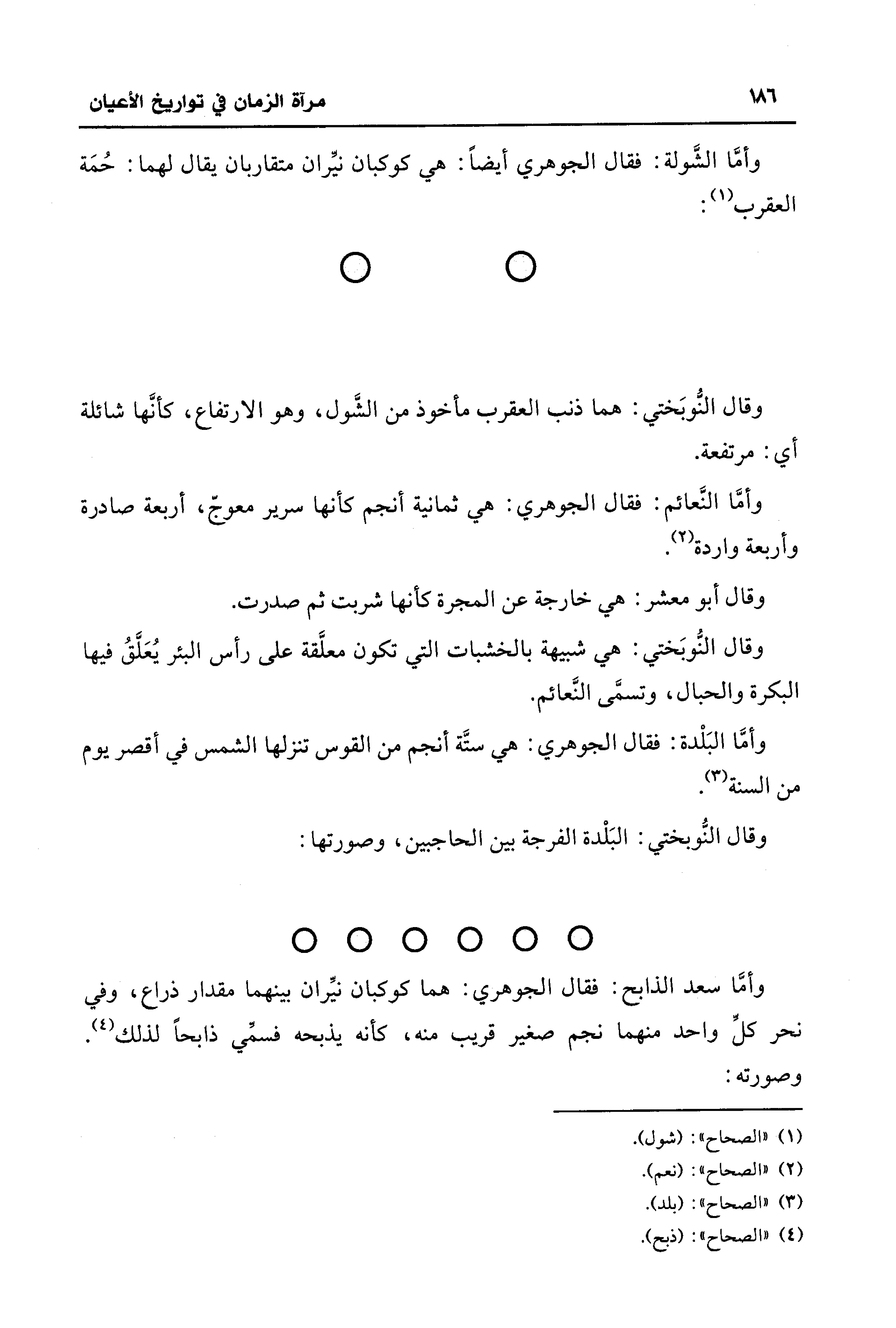 وأمَّا سعد الذابح: فقال الجوهري: هما كوكبان نيِّران بينهما مقدار ذراع، وفي نحر كلِّ واحد منهما نجم صغير قريب منه، كأنه يذبحه فسمّي ذابحًا لذلك (¬4).
