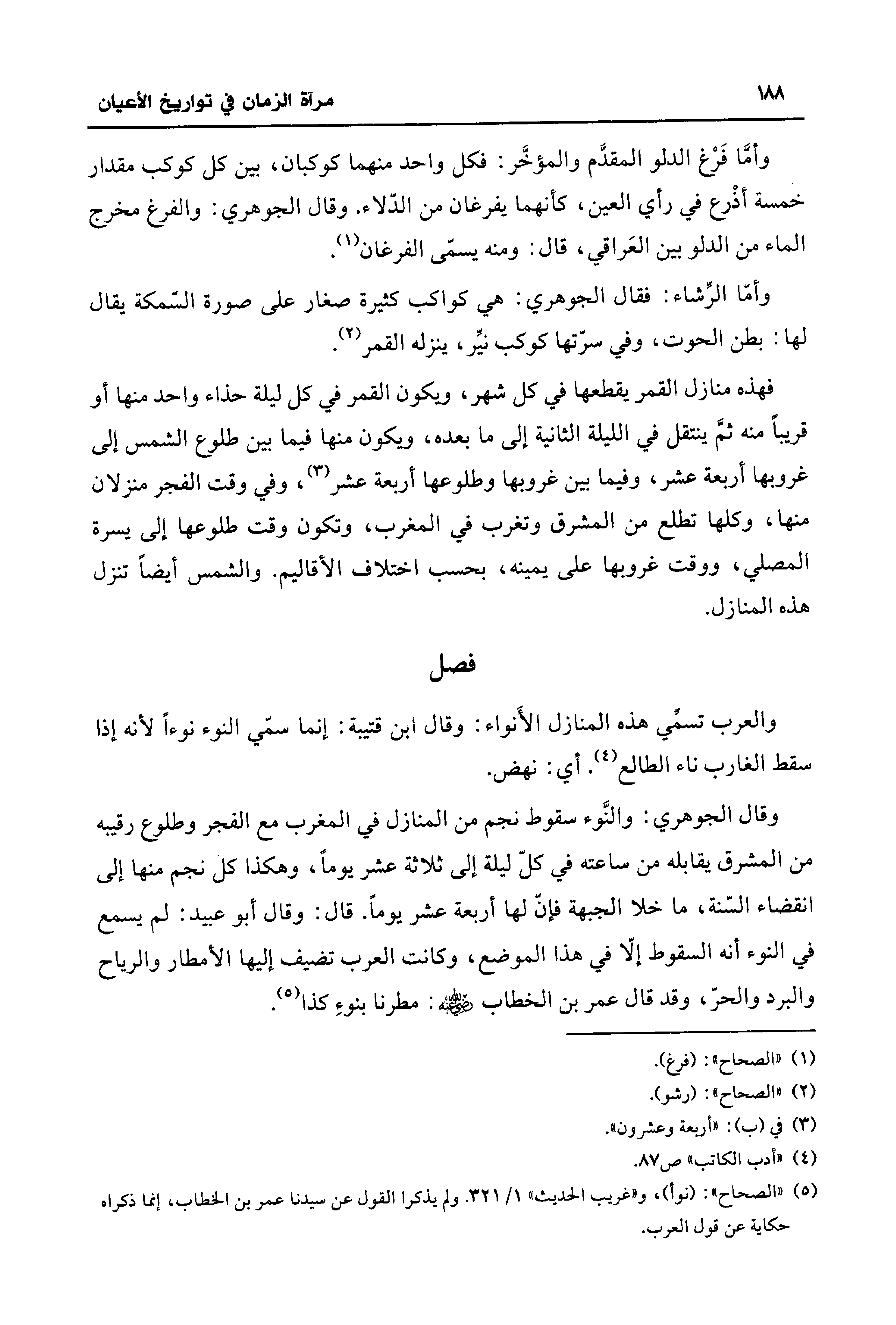 وقال الجوهري: والنَّوء سقوط نجم من المنازل في المغرب مع الفجر وطلوع رقيبه من المشرق يقابله من ساعته في كلّ ليلة إلى ثلاثة عشر يومًا، وهكذا كل نجم منها إلى انقضاء السّنة، ما خلا الجبهة فإنّ لها أربعة عشر يومًا. قال: وقال أبو عبيد: لم يسمع في النوء أنه السقوط إلّا في هذا الموضع، وكانت العرب تضيف إليها الأمطار والرياح والبرد والحرّ، وقد قال عمر بن الخطاب - رضي الله عنه -: مطرنا بنوءِ كذا (¬5).