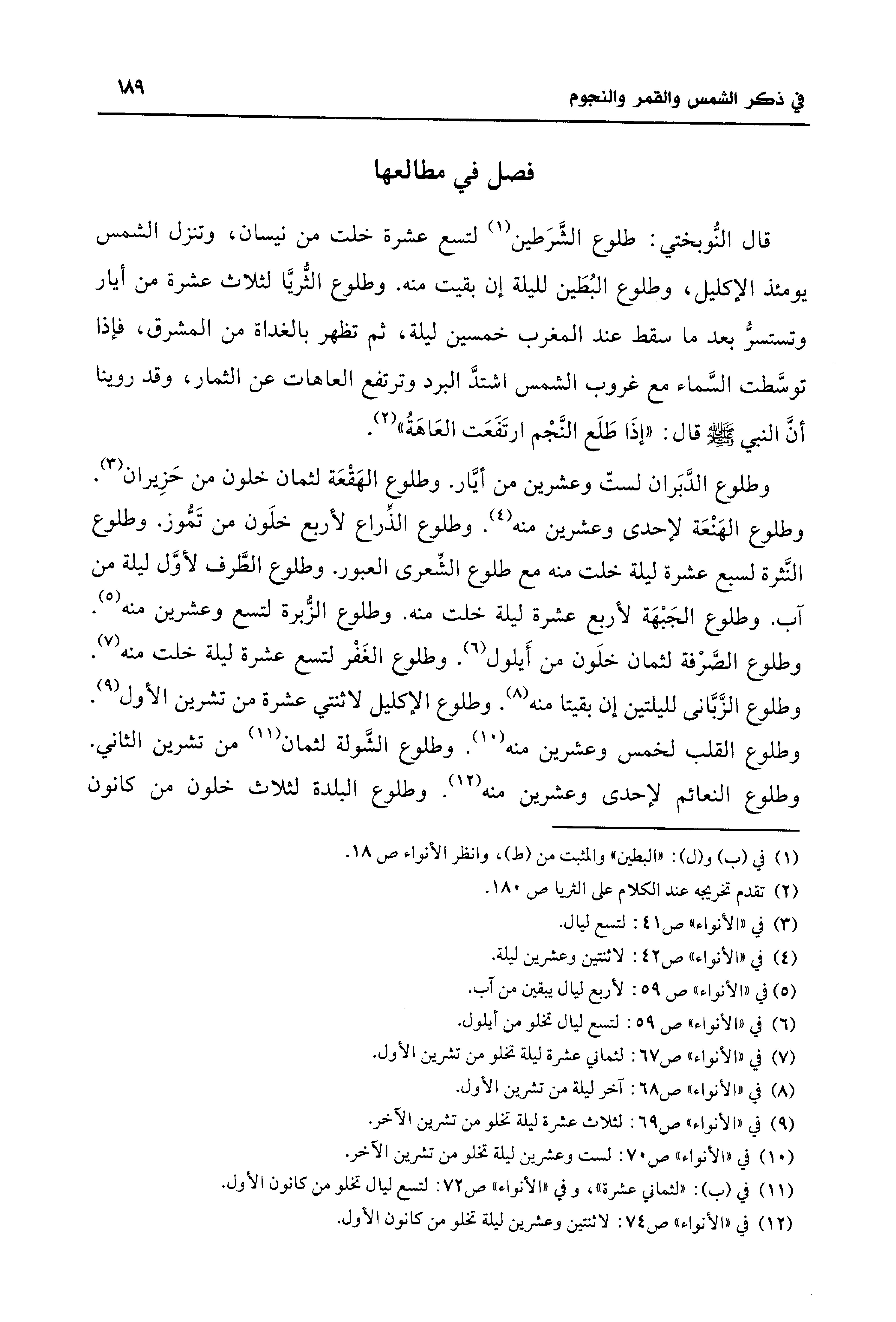 وطلوع الدَّبَران لستّ وعشرين من أيَّار. وطلوع الهَقْعَة لثمان خلون من حَزِيران (¬3). وطلوع الهَنْعَة لإحدى وعشرين منه (¬4). وطلوع الذراع لأربع خلَون من تَمُّوز. وطلوع النَّثرة لسبع عشرة ليلة خلت منه مع طلوع الشعرى العبور. وطلوع الطَّرف لأوَّل ليلة من آب. وطلوع الجَبْهَة لأربع عشرة ليلة خلت منه. وطلوع الزُّبرة لتسع وعشرين منه (¬5). وطلوع الصَّرْفة لثمان خلَون من أَيلول (¬6). وطلوع الغَفْر لتسع عشرة ليلة خلت منه (¬7). وطلوع الزَّبَّانى لليلتين إن بقيتا منه (¬8). وطلوع الإكليل لاثنتي عشرة من تشرين الأول (¬9). وطلوع القلب لخمس وعشرين منه (¬10). وطلوع الشَّولة لثمان (¬11) من تشرين الثاني. وطلوع النعائم لإحدى وعشرين منه (¬12). وطلوع البلدة لثلاث خلون من كانون