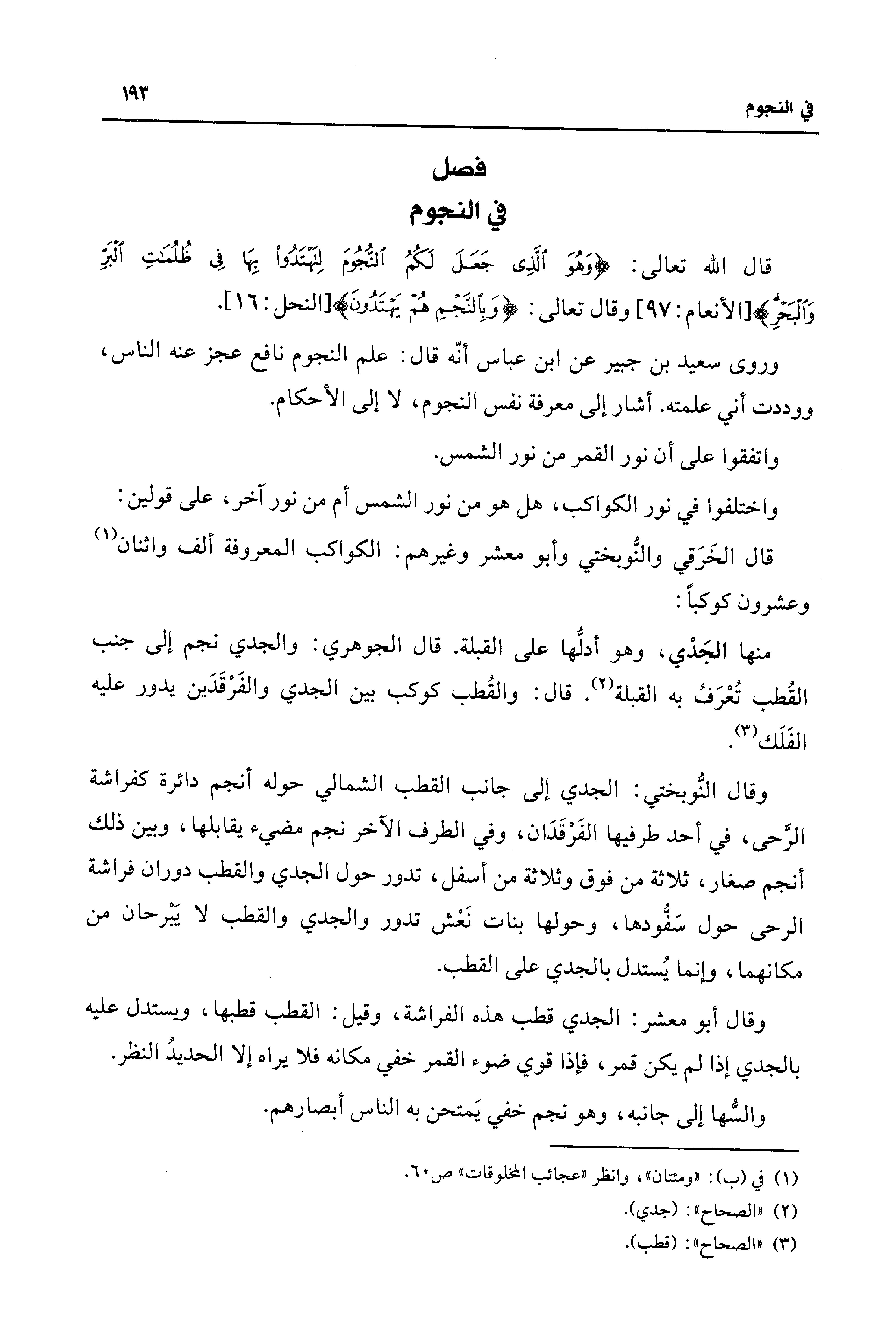 منها الجَدْي، وهو أدلُّها على القبلة. قال الجوهري: والجدي نجم إلى جنب القُطب تُعْرَفُ به القبلة (¬2). قال: والقُطب كوكب بين الجدي والفَرْقَدَين يدور عليه الفَلَك (¬3).