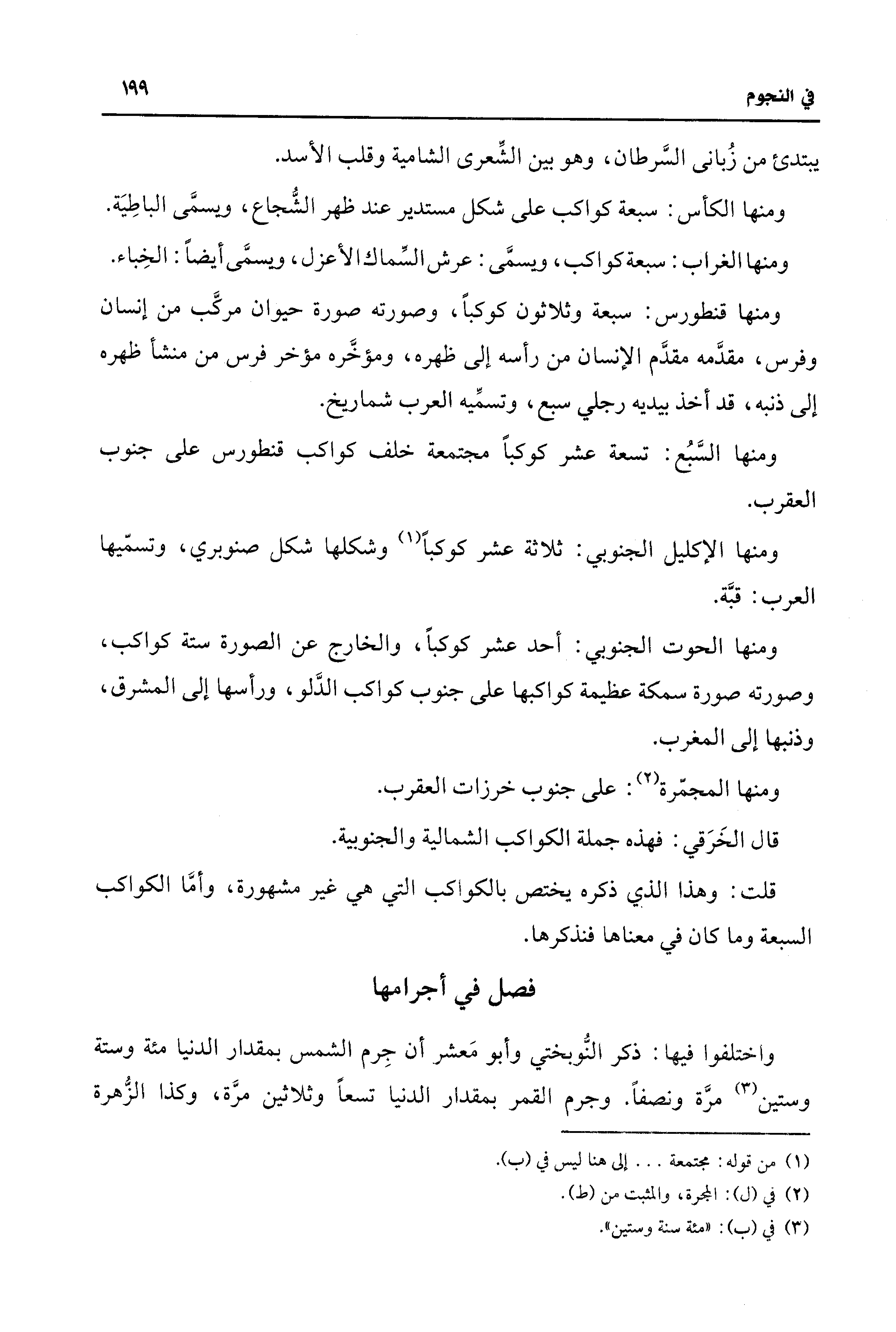واختلفوا فيها: ذكر النُّوبختي وأبو مَعشر أن جِرم الشمس بمقدار الدنيا مئة وستة وستين (¬3) مرَّة ونصفًا. وجرم القمر بمقدار الدنيا تسعًا وثلاثين مرَّة، وكذا الزُّهرة