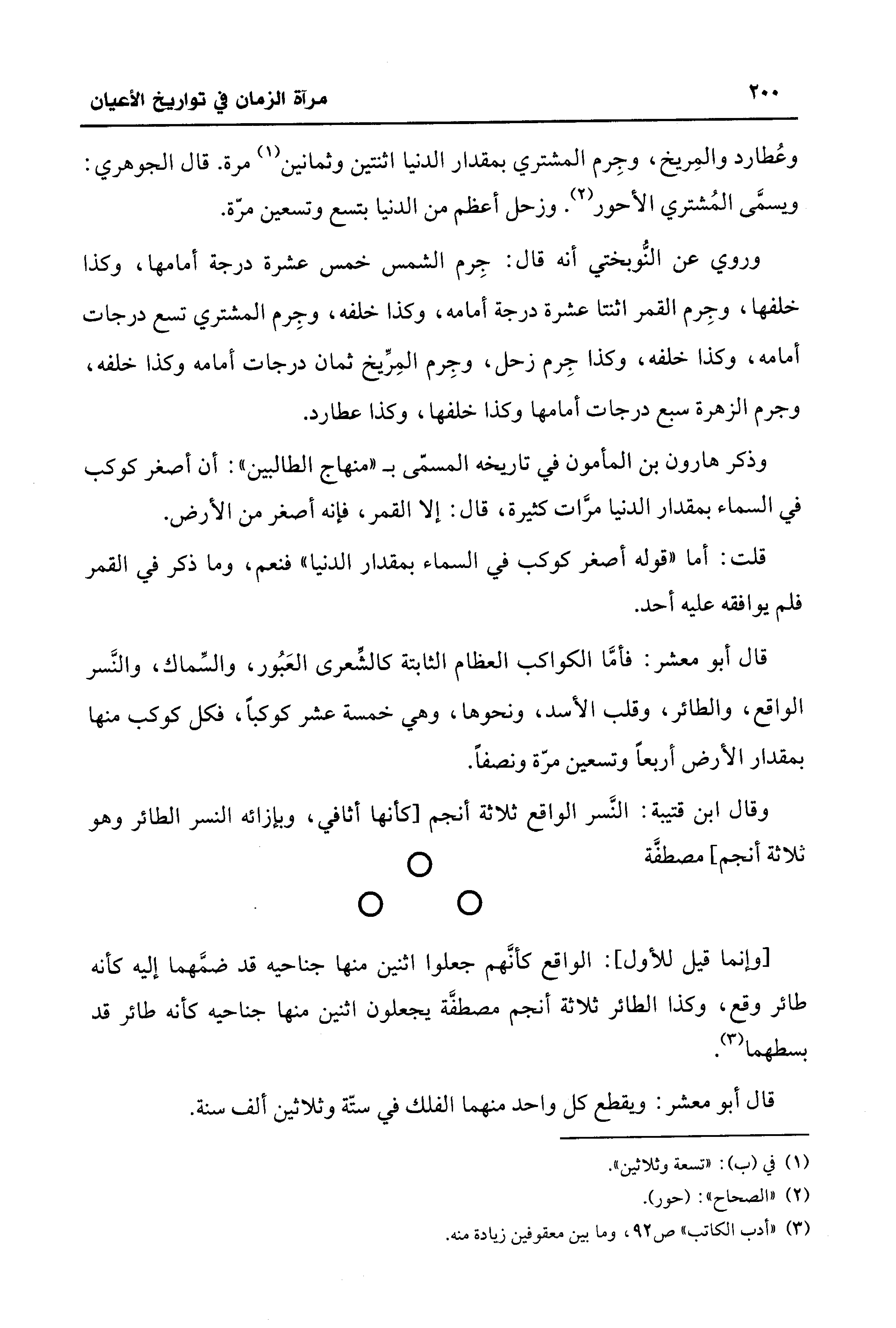 قال أبو معشر: فأمَّا الكواكب العظام الثابتة كالشِّعرى العَبُور، والسِّماك، والنَّسر الواقع، والطائر، وقلب الأسد، ونحوها، وهي خمسة عشر كوكبًا، فكل كوكب منها بمقدار الأرض أربعًا وتسعين مرّة ونصفًا.