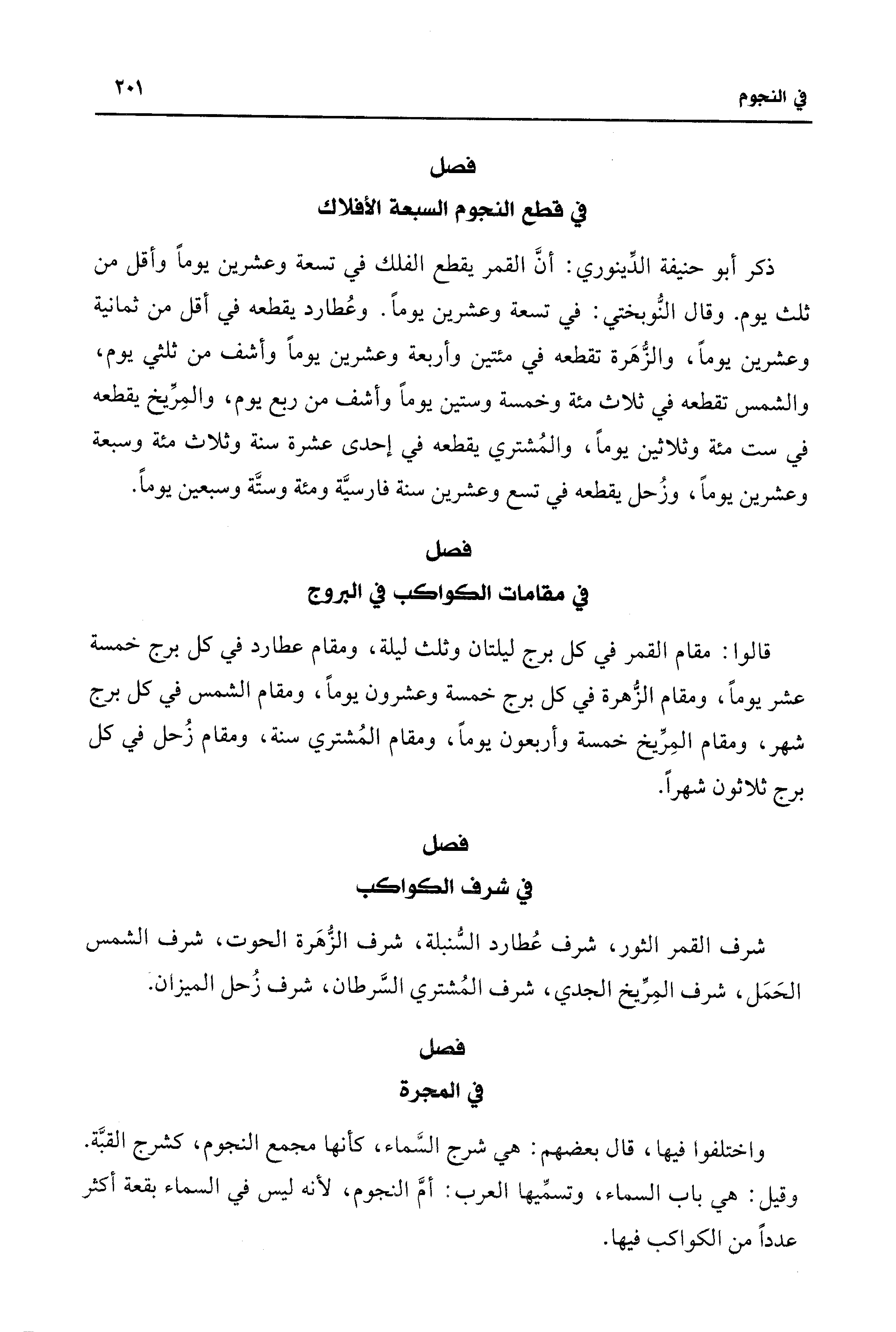 ذكر أبو حنيفة الدِّينوري: أنَّ القمر يقطع الفلك في تسعة وعشرين يومًا وأقل من ثلث يوم. وقال النُّوبختي: في تسعة وعشرين يومًا. وعُطارد يقطعه في أقل من ثمانية وعشرين يومًا، والزُّهَرة تقطعه في مئتين وأربعة وعشرين يومًا وأشف من ثلثي يوم، والشمس تقطعه في ثلاث مئة وخمسة وستين يومًا وأشف من ربع يوم، والمِرِّيخ يقطعه في ست مئة وثلاثين يومًا، والمُشتري يقطعه في إحدى عشرة سنة وثلاث مئة وسبعة وعشرين يومًا، وزُحل يقطعه في تسع وعشرين سنة فارسيَّة ومئة وستَّة وسبعين يومًا.