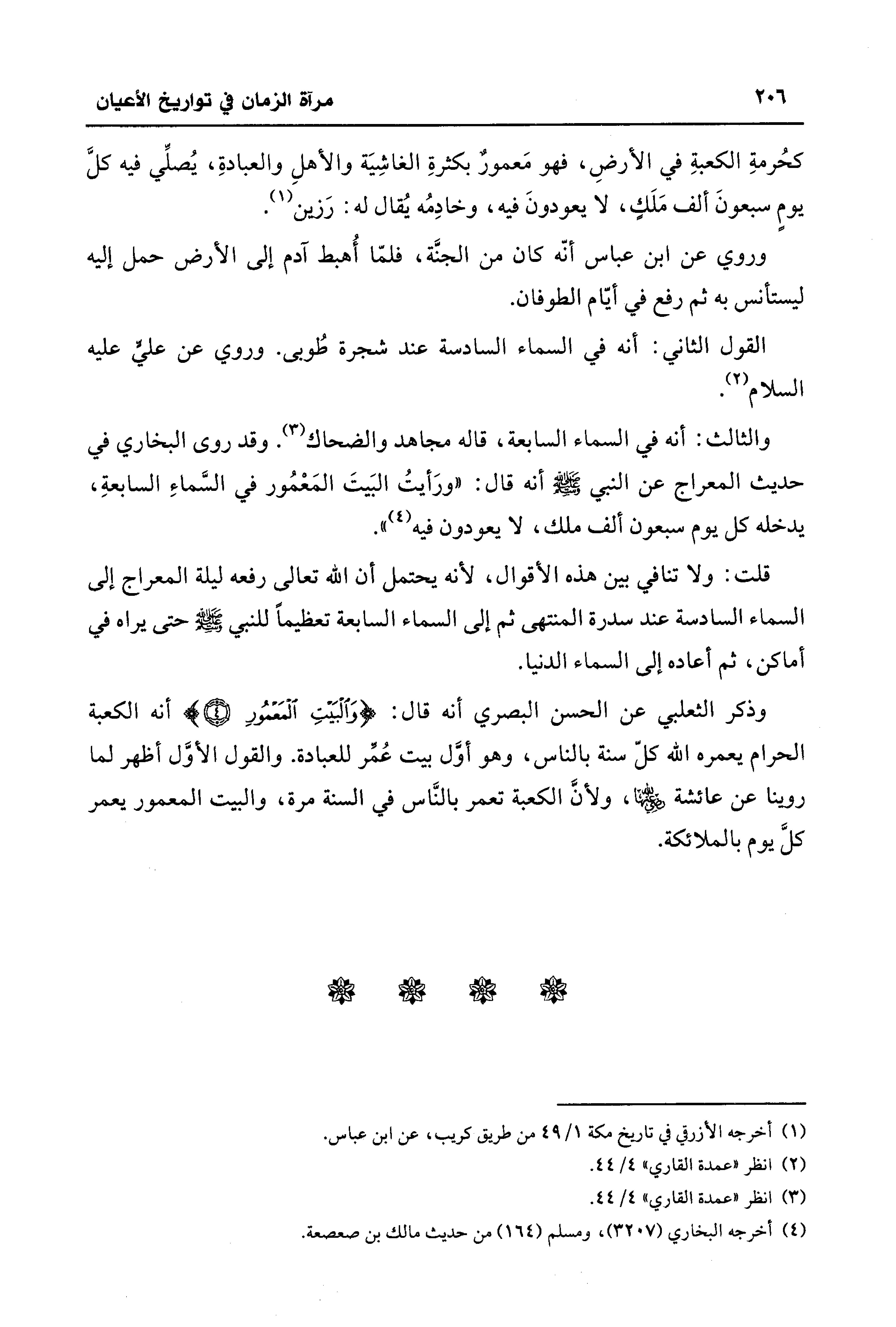 وذكر الثعلبي عن الحسن البصري أنه قال: {وَالْبَيتِ الْمَعْمُورِ (4)} أنه الكعبة الحرام يعمره الله كلّ سنة بالناس، وهو أوَّل بيت عُمِّر للعبادة. والقول الأوَّل أظهر لما روينا عن عائشة - رضي الله عنهما-، ولأنَّ الكعبة تعمر بالنَّاس في السنة مرة، والبيت المعمور يعمر كلَّ يوم بالملائكة.
