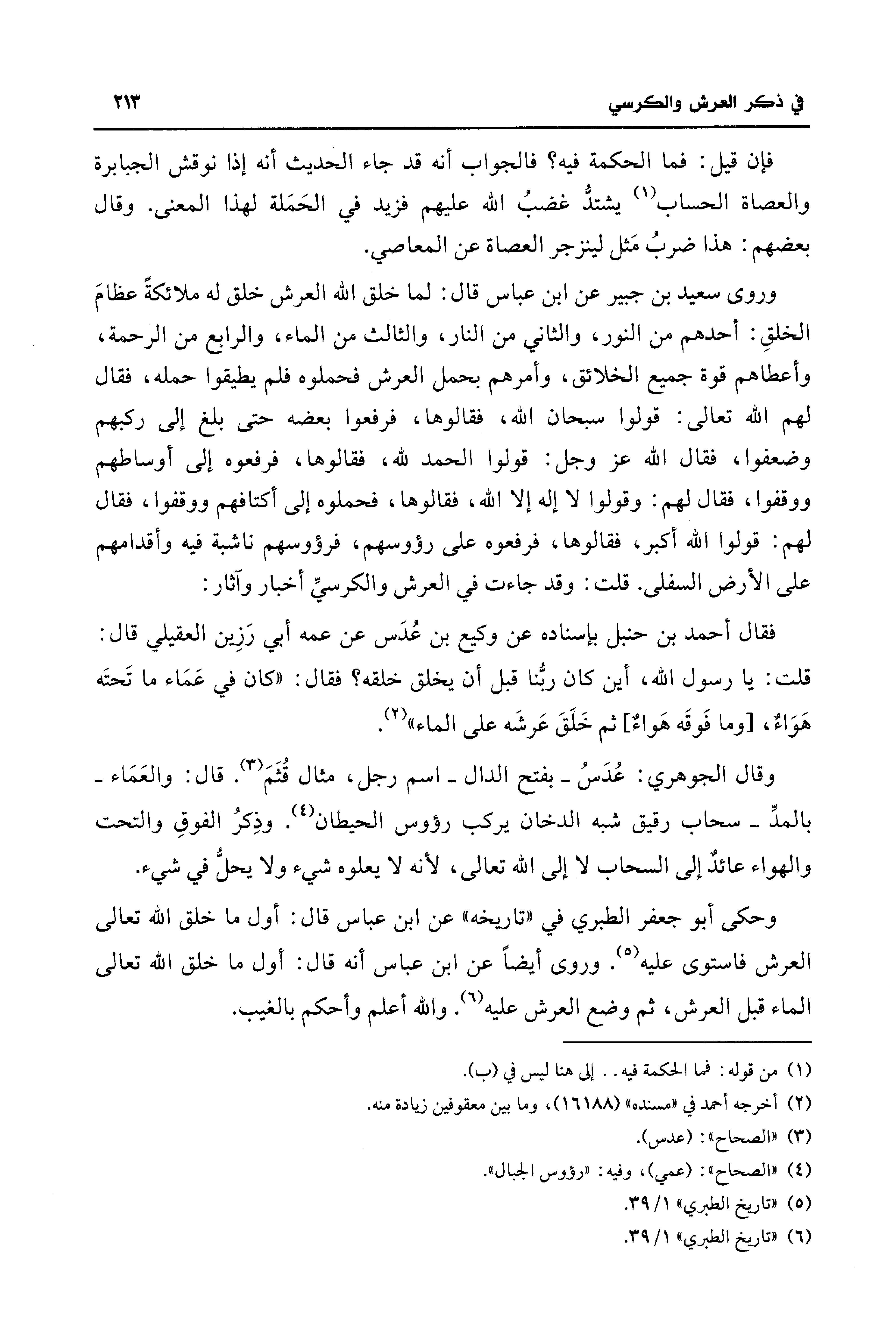وروى سعيد بن جبير عن ابن عباس قال: لما خلق الله العرش خلق له ملائكةً عظامَ الخلقِ: أحدهم من النور، والثاني من النار، والثالث من الماء، والرابع من الرحمة، وأعطاهم قوة جميع الخلائق، وأمرهم بحمل العرش فحملوه فلم يطيقوا حمله، فقال لهم الله تعالى: قولوا سبحان الله، فقالوها، فرفعوا بعضه حتى بلغ إلى ركبهم وضعفوا، فقال الله عزَّ وجلَّ: قولوا الحمد لله، فقالوها، فرفعوه إلى أوساطهم ووقفوا، فقال لهم: وقولوا لا إله إلا الله، فقالوها، فحملوه إلى أكتافهم ووقفوا، فقال لهم: قولوا الله أكبر، فقالوها، فرفعوه على رؤوسهم، فرؤوسهم ناشبة فيه وأقدامهم على الأرض السفلى. قلت: وقد جاءت في العرش والكرسيِّ أخبار وآثار:
