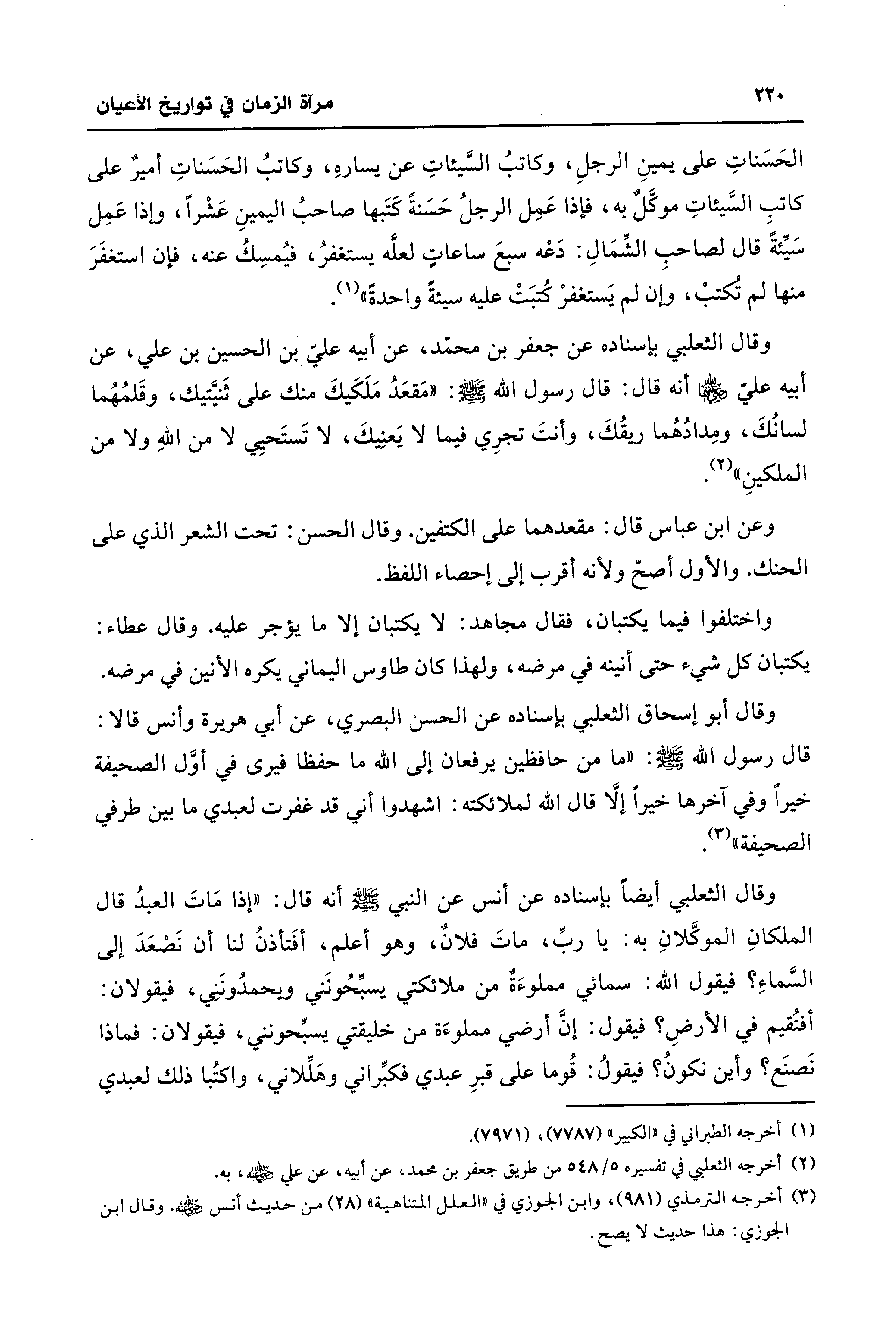 وقال الثعلبي باسناده عن جعفر بن محمّد، عن أبيه عليّ بن الحسين بن علي، عن أبيه عليّ - رضي الله عنهما - أنه قال: قال رسول الله - صلى الله عليه وسلم -: "مَقعَدُ مَلَكَيكَ منك على ثَنيَّتيك، وقَلمُهُما لسانُكَ، ومِدادُهُما ريقُكَ، وأنتَ تجرِي فيما لا يَعنِيكَ، لا تَستَحيي لا من اللهِ ولا من الملكينِ" (¬2).