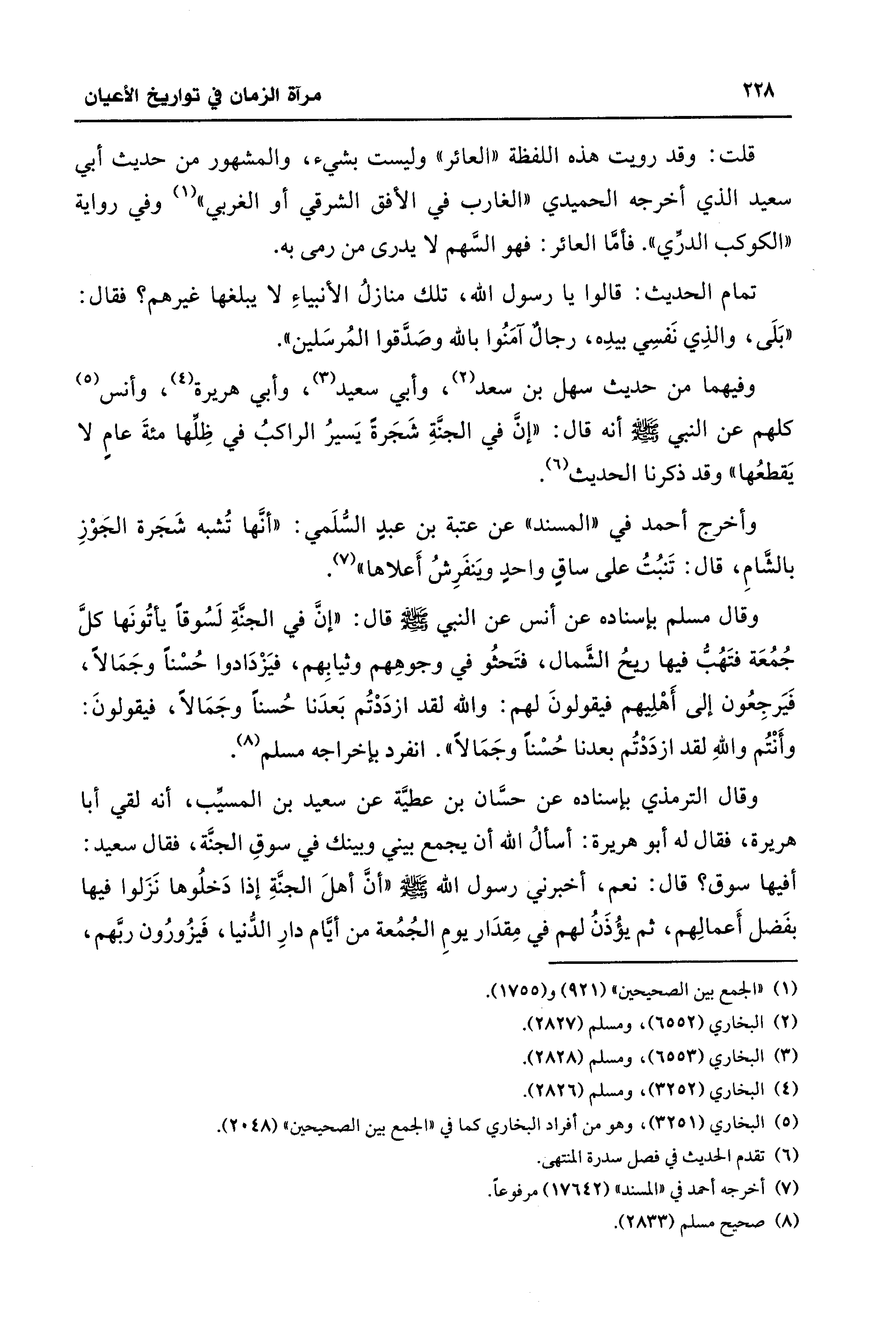 وفيهما من حديث سهل بن سعد (¬2)، وأبي سعيد (¬3)، وأبي هريرة (¬4)، وأنس (¬5) كلهم عن النبي - صلى الله عليه وسلم - أنه قال: "إنَّ في الجنَّةِ شَجَرةً يَسيرُ الراكبُ في ظِلِّها مئةَ عامٍ لا يَقطعُها" وقد ذكرنا الحديث (¬6).