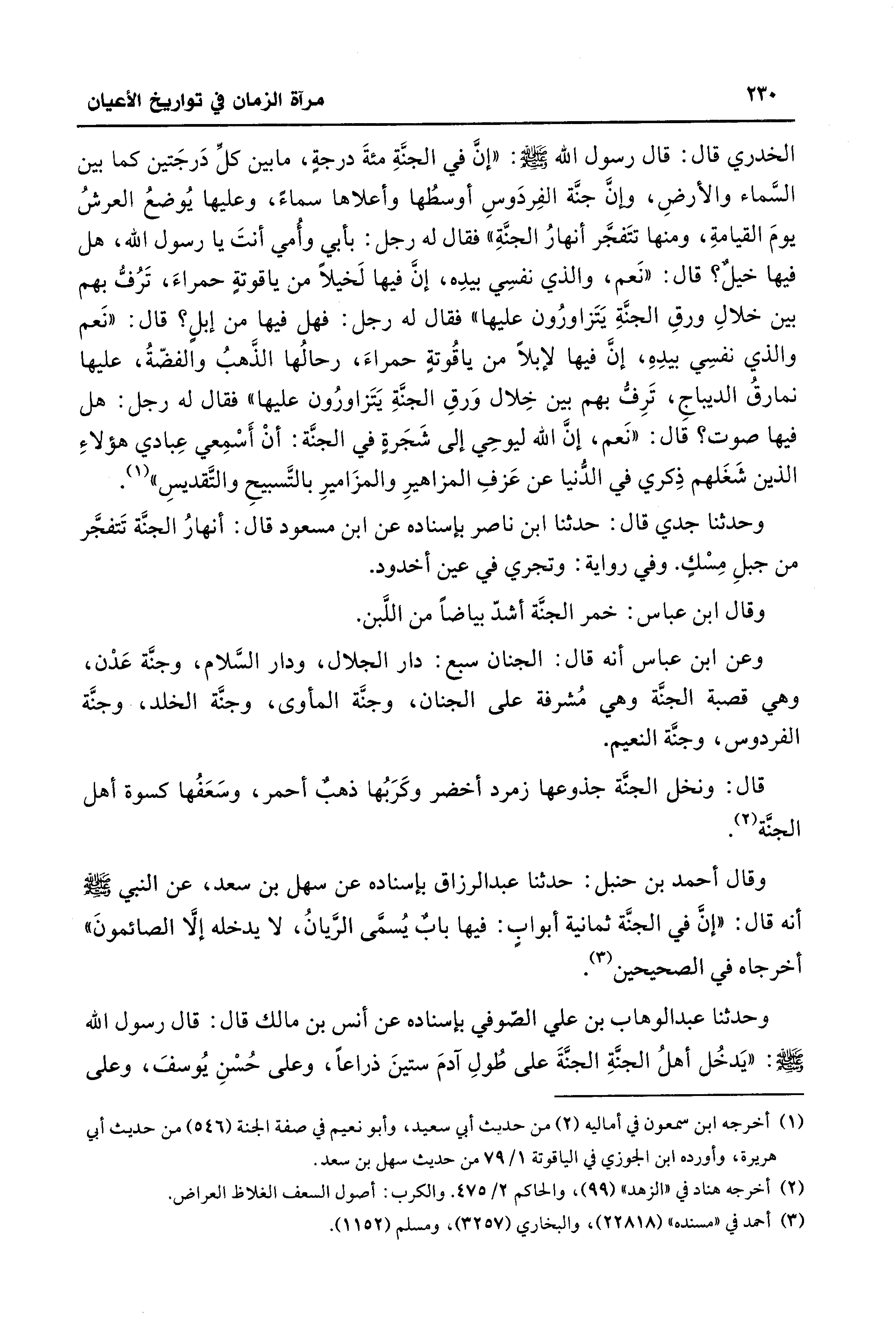 وحدثنا جدي قال: حدثنا ابن ناصر بإسناده عن ابن مسعود قال: أنهارُ الجنَّة تَتفجَّر من جبلِ مِسْكٍ. وفي رواية: وتجري في عين أخدود.