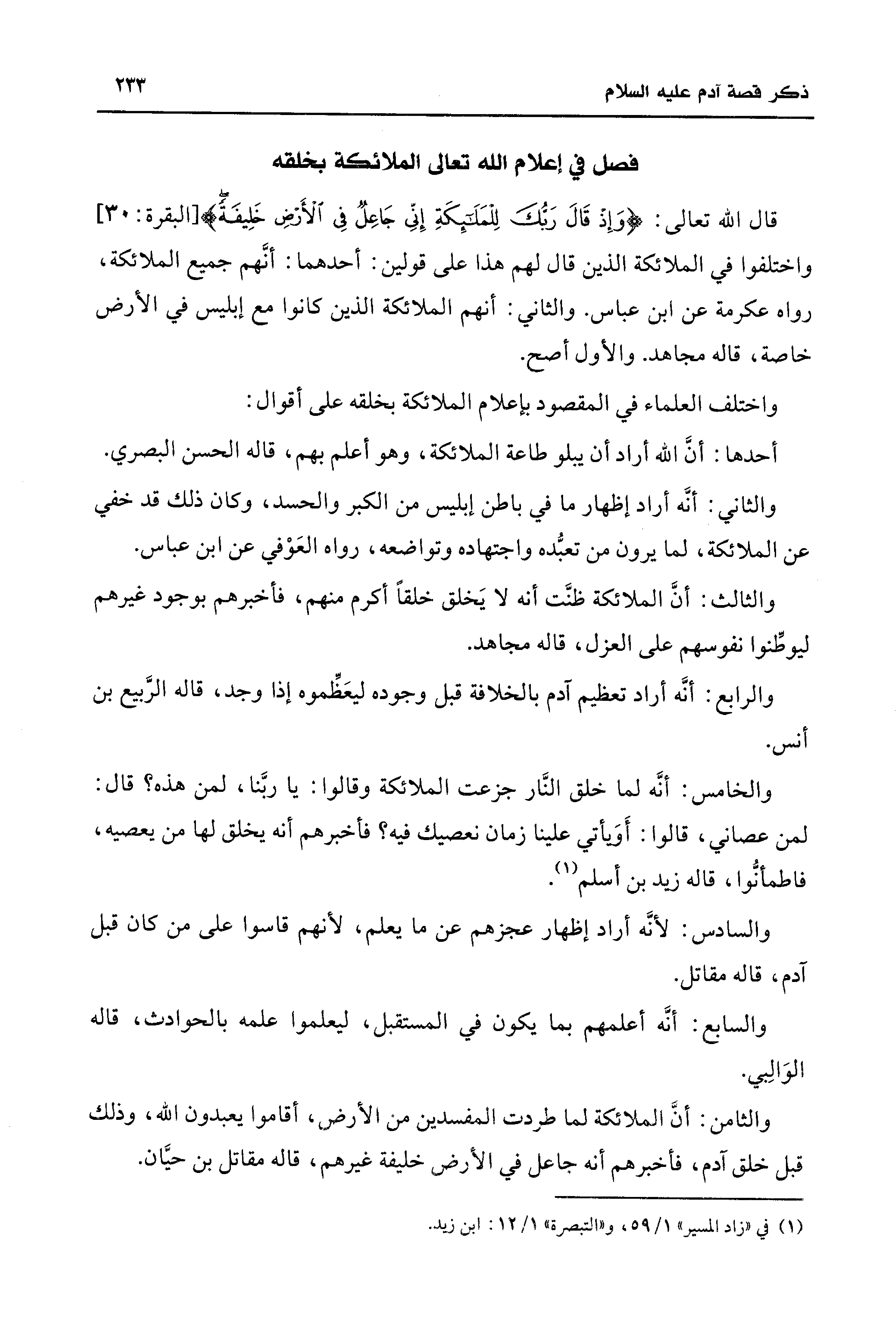 قال الله تعالى: {وَإِذْ قَال رَبُّكَ لِلْمَلَائِكَةِ إِنِّي جَاعِلٌ فِي الْأَرْضِ خَلِيفَةً (30)} [البقرة: 30] واختلفوا في الملائكة الذين قال لهم هذا على قولين: أحدهما: أنَّهم جميع الملائكة، رواه عكرمة عن ابن عباس. والثاني: أنهم الملائكة الذين كانوا مع إبليس في الأرض خاصة، قاله مجاهد. والأول أصح.