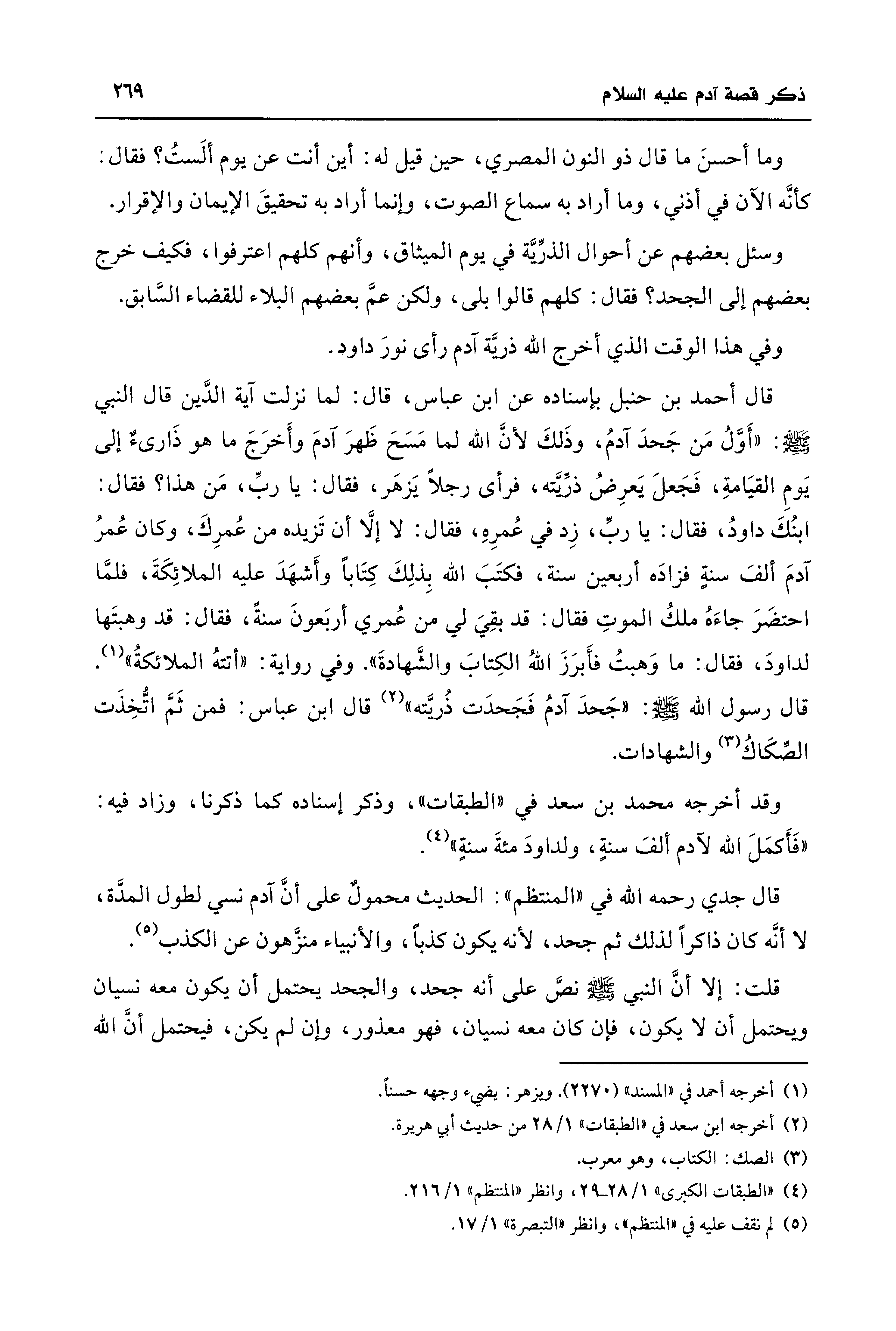قال أحمد بن حنبل بإسناده عن ابن عباس، قال: لما نزلت آية الدَّين قال النبي - صلى الله عليه وسلم -: "أَوَّلُ مَن جَحدَ آدمُ، وذَلكَ لأنَّ الله لما مَسَحَ ظَهرَ آدمَ وأَخرَجَ ما هو ذَارئٌ إلى يَومِ القيَامةِ، فَجَعلَ يَعرِضُ ذرِّيَّته، فرأى رجلًا يَزهَر، فقال: يا ربِّ، مَن هذا؟ فقال: ابنُكَ داودُ، فقال: يا ربِّ، زِد في عُمرِهِ، فقال: لا إلَّا أن تَزيده من عُمرِكَ، وكان عُمرُ آدمَ ألفَ سنةٍ فزادَه أربعين سنة، فكتَبَ الله بِذلِكَ كِتَابًا وأَشهَدَ عليه الملائِكَةَ، فلمَّا احتضَرَ جاءَهُ ملكُ الموتِ فقال: قد بقِيَ لي من عُمري أربَعونَ سنةً، فقال: قد وهبتَها لداودَ، فقال: ما وَهبتُ فأَبرَزَ اللهُ الكِتابَ والشَّهادةَ". وفي رواية: "أتتهُ الملائكةُ" (¬1).