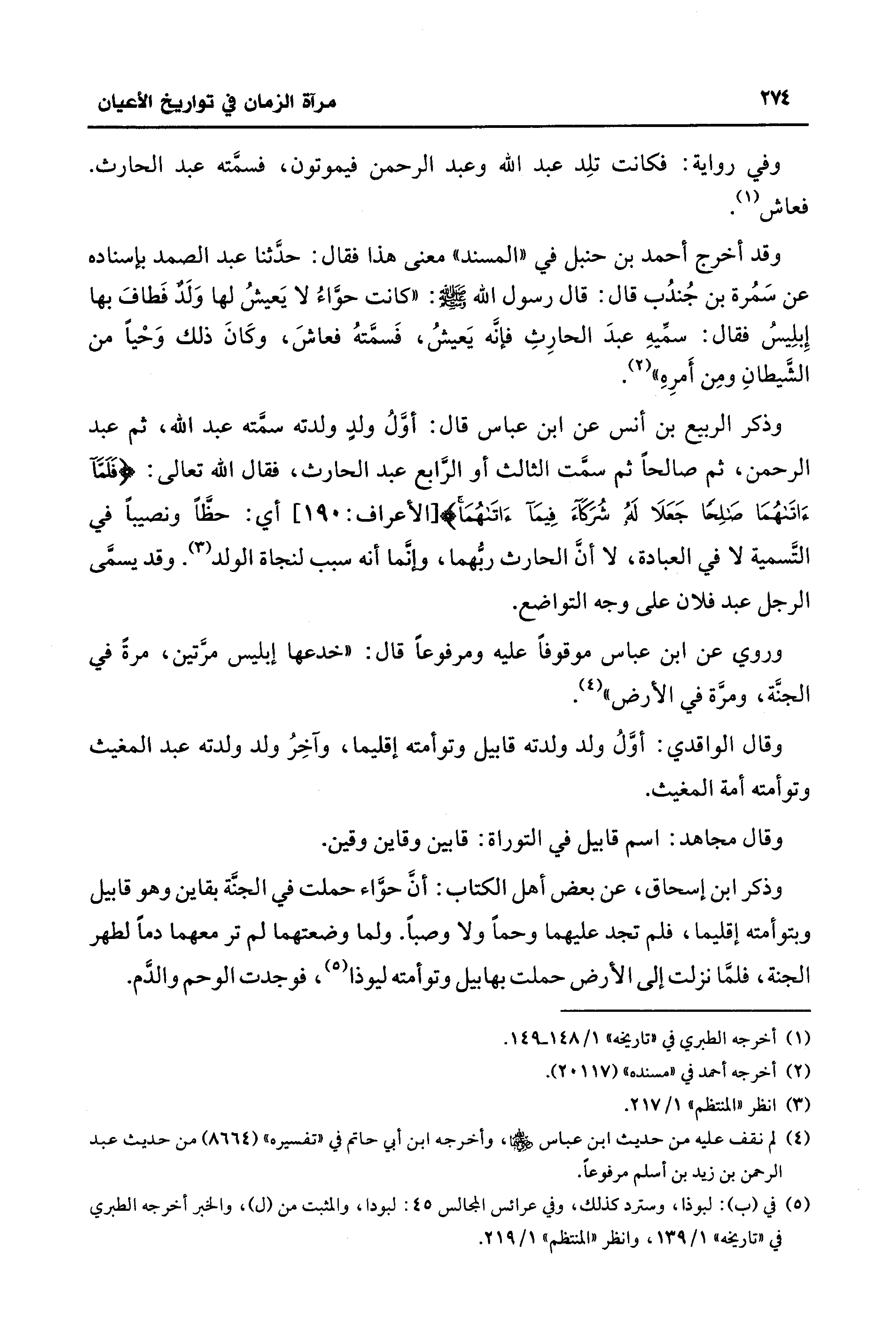 وقد أخرج أحمد بن حنبل في "المسند" معنى هذا فقال: حدَّثنا عبد الصمد بإسناده عن سَمُرة بن جُندُب قال: قال رسول الله - صلى الله عليه وسلم -: "كانت حوَّاءُ لا يَعيشُ لها وَلَدٌ فَطافَ بها إِبلِيسُ فقال: سمِّيهِ عبدَ الحارِثِ فإنَه يَعيشُ، فَسمَّتهُ فعاشَ، وكَانَ ذلك وَحْيًا من الشَّيطانِ ومِن أَمرِهِ" (¬2).