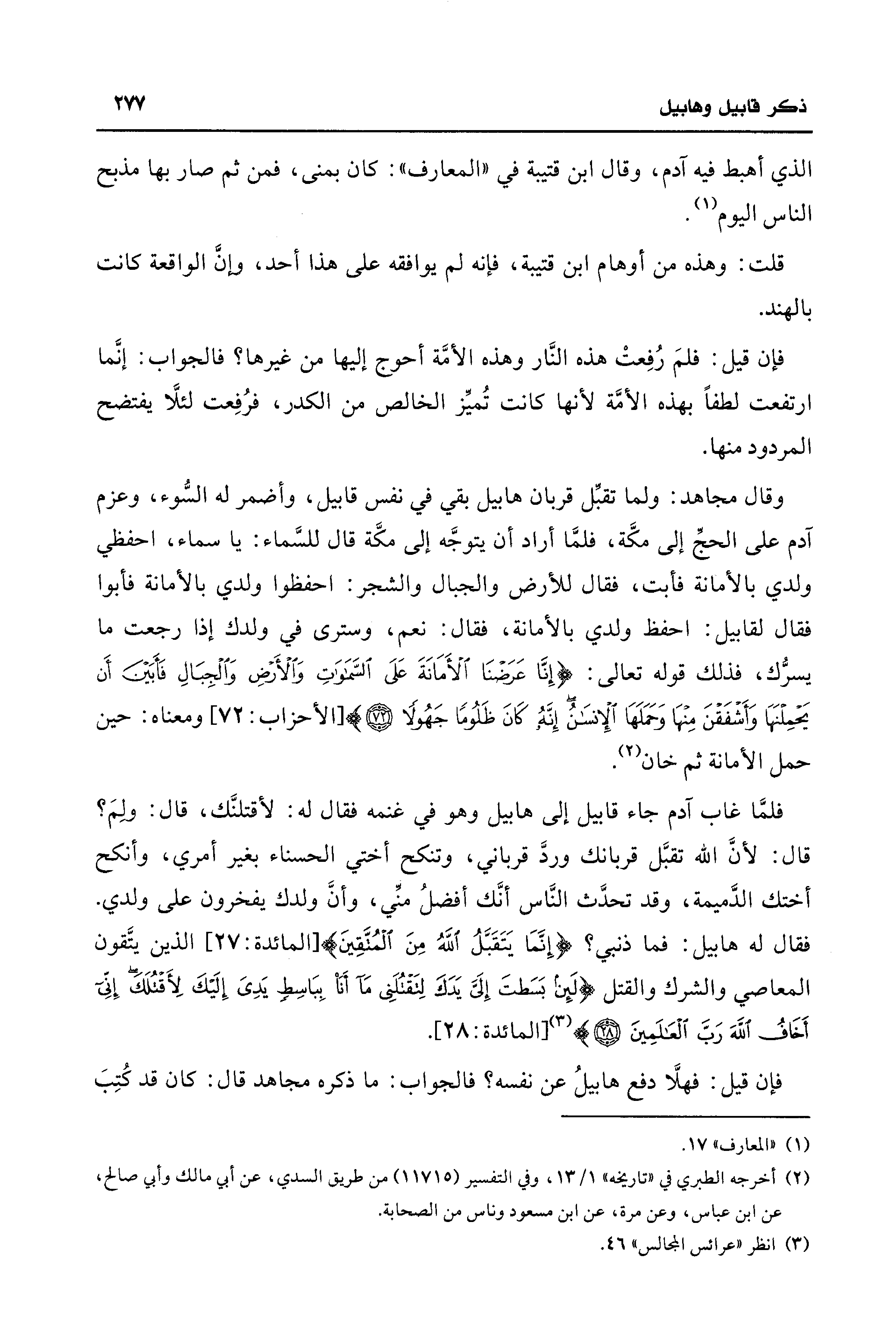 وقال مجاهد: ولما تقبِّل قربان هابيل بقي في نفس قابيل، وأضمر له السُّوء، وعزم آدم على الحجِّ إلى مكَّة، فلمَّا أراد أن يتوجَّه إلى مكَّة قال للسَّماء: يا سماء، احفظي ولدي بالأمانة فأبت، فقال للأرض والجبال والشجر: احفظوا ولدي بالأمانة فأبوا فقال لقابيل: احفظ ولدي بالأمانة، فقال: نعم، وسترى في ولدك إذا رجعت ما يسرُّك، فذلك قوله تعالى: {إِنَّا عَرَضْنَا الْأَمَانَةَ عَلَى السَّمَاوَاتِ وَالْأَرْضِ وَالْجِبَالِ فَأَبَينَ أَنْ يَحْمِلْنَهَا وَأَشْفَقْنَ مِنْهَا وَحَمَلَهَا الْإِنْسَانُ إِنَّهُ كَانَ ظَلُومًا جَهُولًا (72)} [الأحزاب: 72] ومعناه: حين حمل الأمانة ثم خان (¬2).