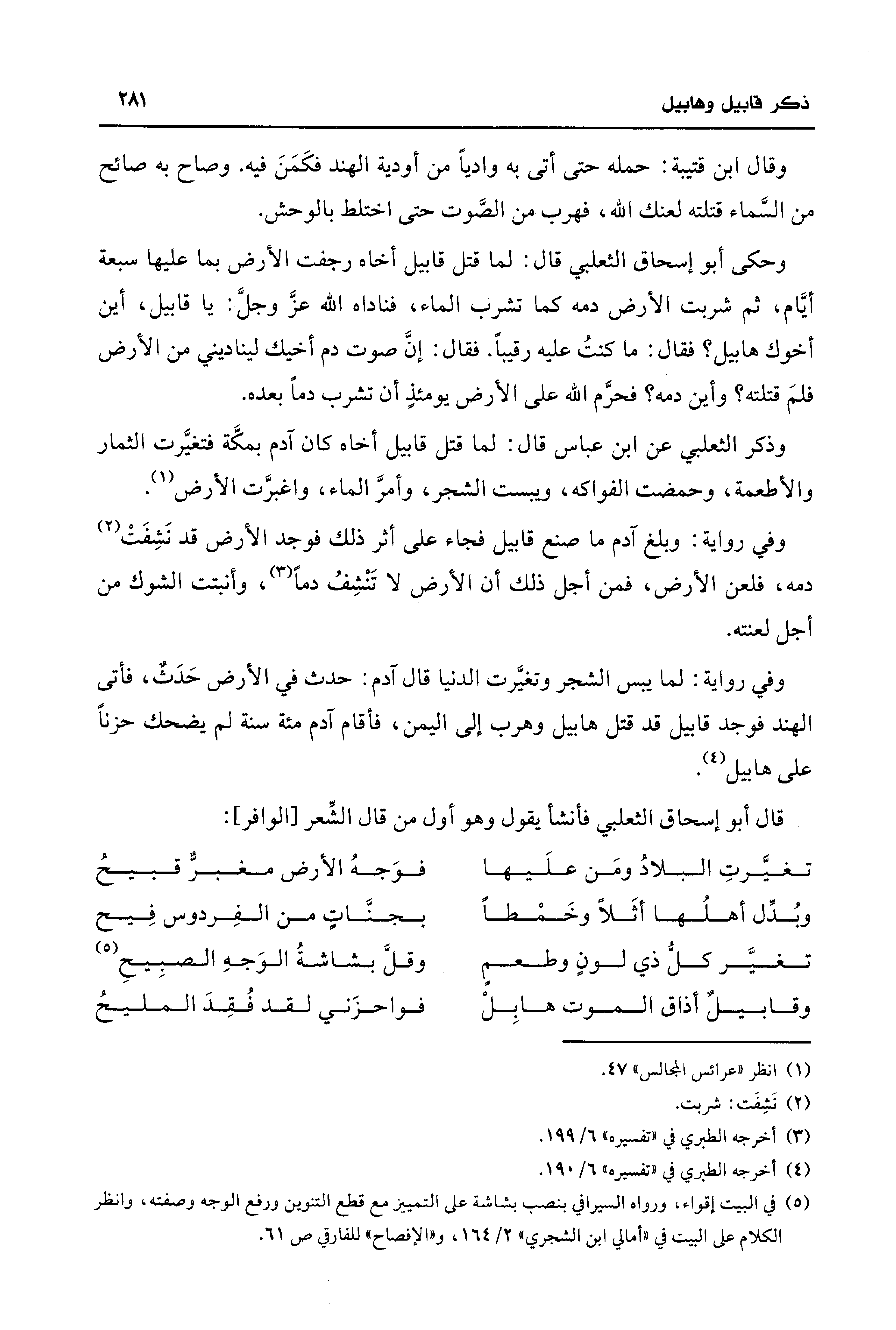 وحكى أبو إسحاق الثعلبي قال: لما قتل قابيل أخاه رجفت الأرض بما عليها سبعة أيَّام، ثم شربت الأرض دمه كما تشرب الماء، فناداه الله عزَّ وجلَّ: يا قابيل، أين أخوك هابيل؟ فقال: ما كنتُ عليه رقيبًا. فقال: إنَّ صوت دم أخيك ليناديني من الأرض فلمَ قتلته؟ وأين دمه؟ فحرَّم الله على الأرض يومئذٍ أن تشرب دمًا بعده.