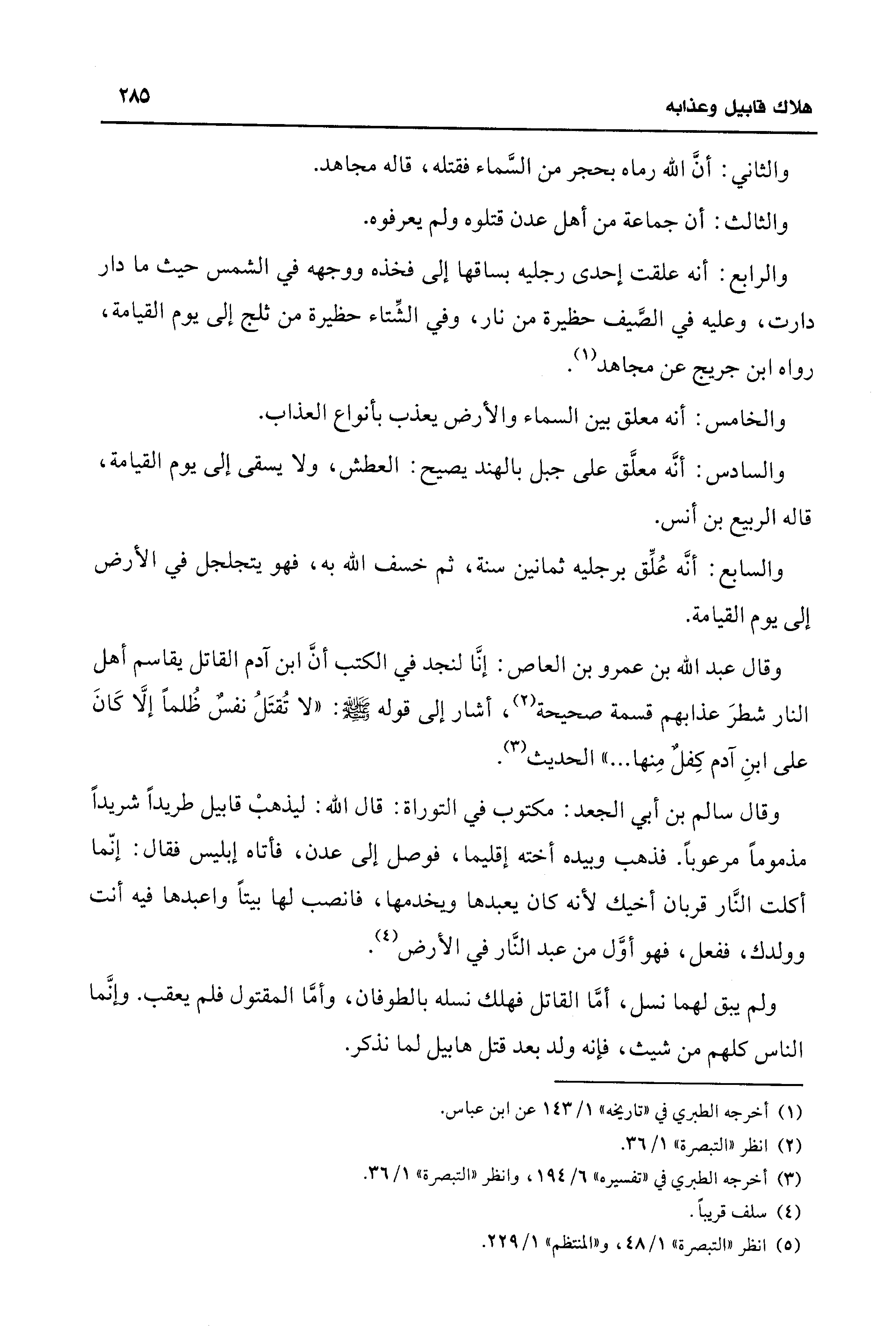 وقال عبد الله بن عمرو بن العاص: إنَّا لنجد في الكتب أنَّ ابن آدم القاتل يقاسم أهل النار شطرَ عذابهم قسمة صحيحة (¬2)، أشار إلى قوله - صلى الله عليه وسلم -: "لا تُقتَلُ نفسٌ ظُلمًا إلَّا كَانَ على ابنِ آدم كِفلٌ مِنها ... " الحديث (¬3).