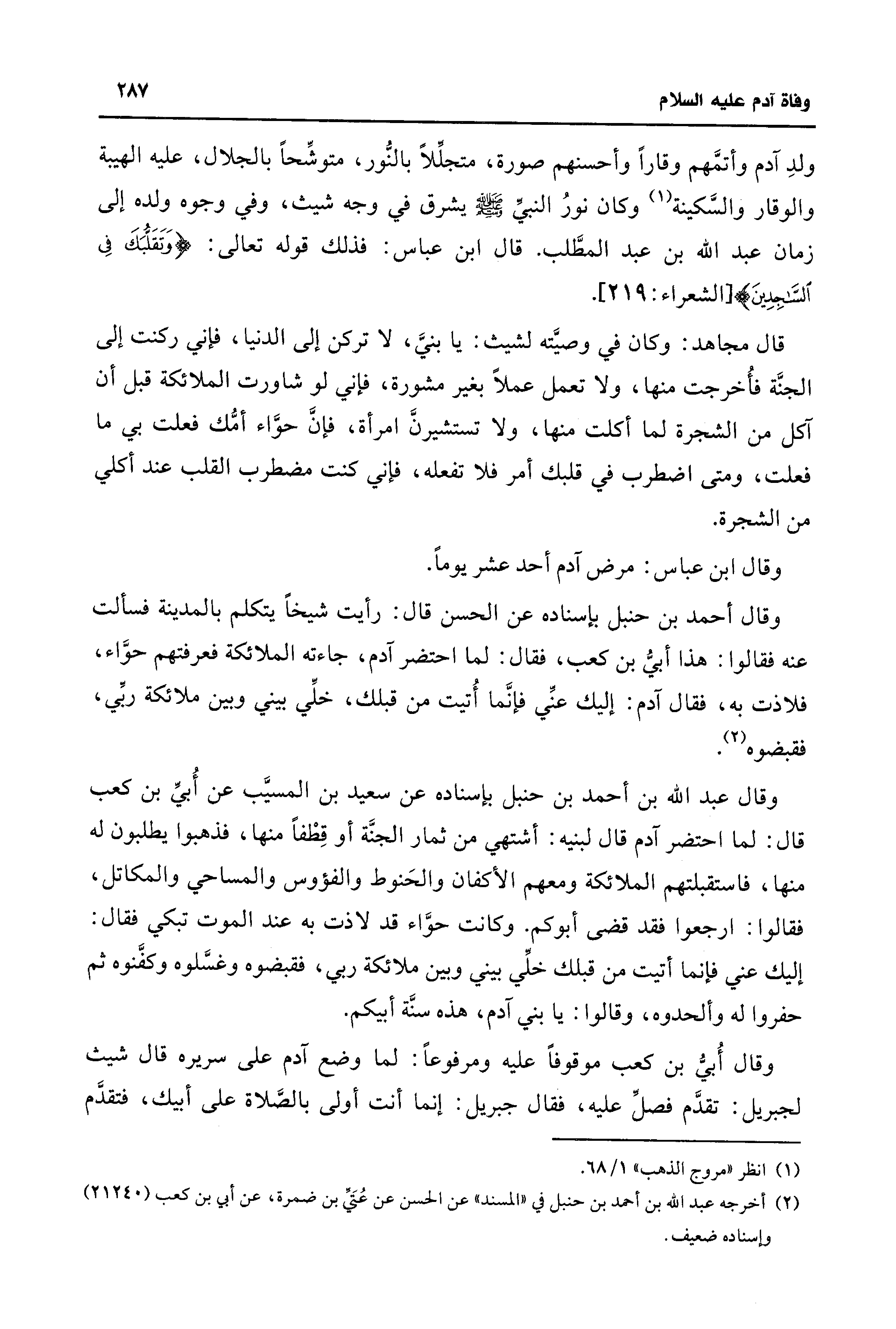 وقال أحمد بن حنبل بإسناده عن الحسن قال: رأيت شيخًا يتكلم بالمدينة فسألت عنه فقالوا: هذا أبيُّ بن كعب، فقال: لما احتضر آدم، جاءته الملائكة فعرفتهم حوَّاء، فلاذت به، فقال آدم: إليك عنِّي فإنَّما أُتيت من قبلك، خلِّي بيني وبين ملائكة ربِّي، فقبضوه (¬2).