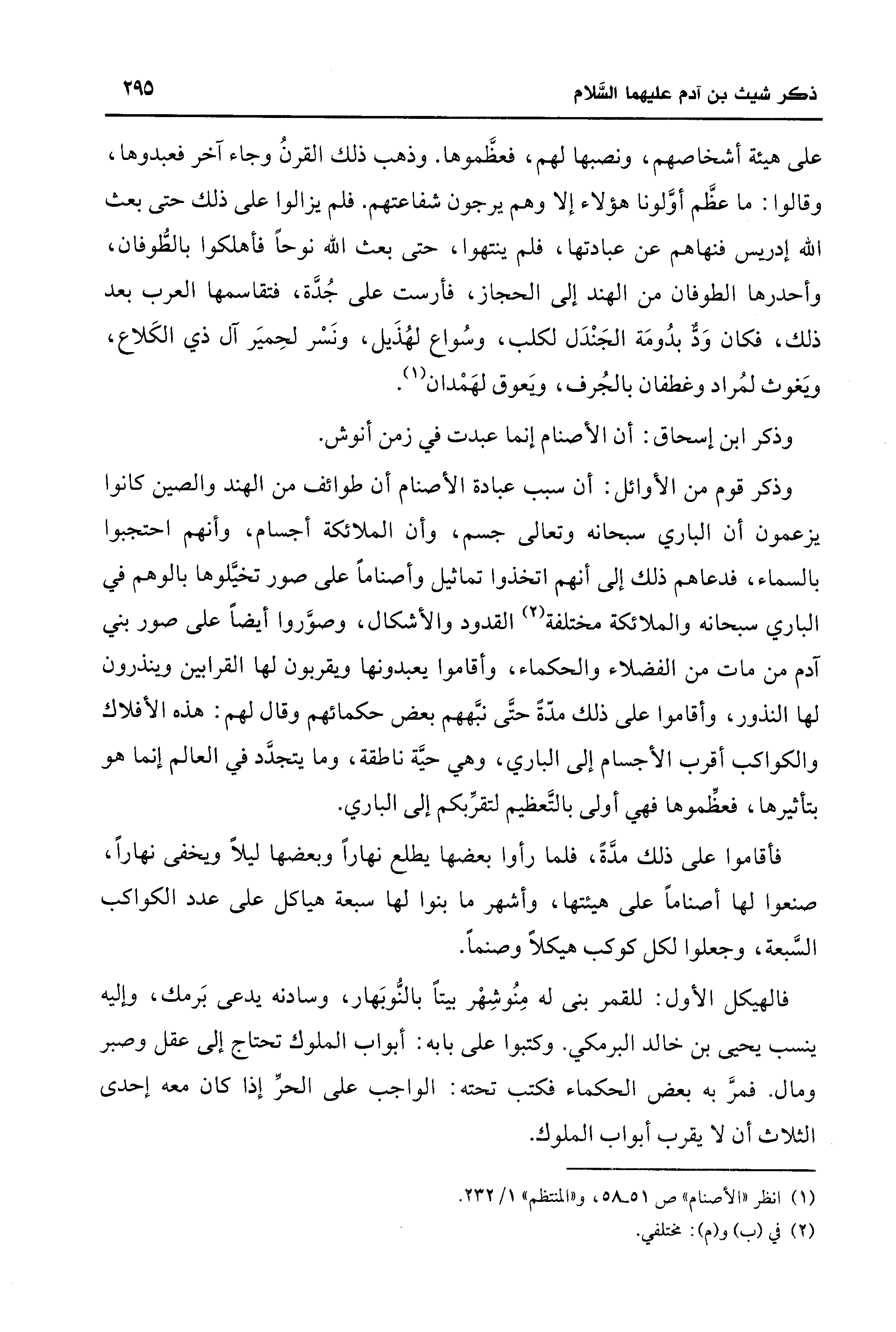 على هيئة أشخاصهم، ونصبها لهم، فعظَّموها. وذهب ذلك القرنُ وجاء آخر فعبدوها، وقالوا: ما عظَّم أوَّلونا هؤلاء إلا وهم يرجون شفاعتهم. فلم يزالوا على ذلك حتى بعث الله إدريس فنهاهم عن عبادتها، فلم ينتهوا، حتى بعث الله نوحًا فأهلكوا بالطُّوفان، وأحدرها الطوفان من الهند إلى الحجاز، فأرست على جُدَّة، فتقاسمها العرب بعد ذلك، فكان وَدٌّ بدُومَة الجَنْدَل لكلب، وسُواع لهُذَيل، ونَسْر لحِميَر آل ذي الكَلاع، ويَغوث لمُراد وغطفان بالجُرف، ويَعوق لهَمْدان (¬1).