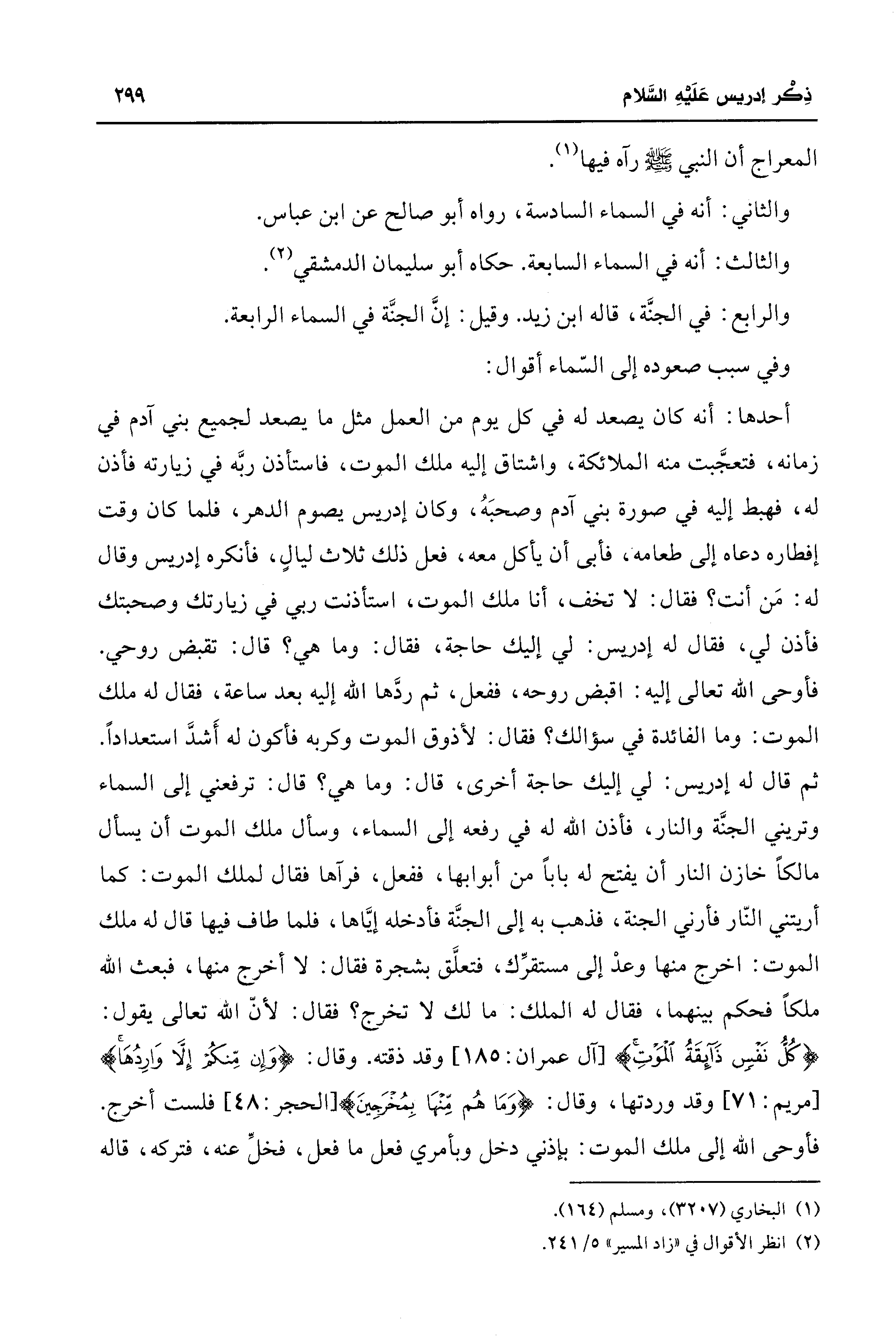 ثم قال له إدريس: لي إليك حاجة أخرى، قال: وما هي؟ قال: ترفعني إلى السماء وتريني الجنَّة والنار، فأذن الله له في رفعه إلى السماء، وسأل ملك الموت أن يسأل مالكًا خازن النار أن يفتح له بابًا من أبوابها، ففعل، فرآها فقال لملك الموت: كما أريتني النّار فأرني الجنة، فذهب به إلى الجنَّة فأدخله إيَّاها، فلما طاف فيها قال له ملك الموت: اخرج منها وعدْ إلى مستقرِّك، فتعلَّق بشجرة فقال: لا أخرج منها، فبعث الله ملكًا فحكم بينهما، فقال له الملك: ما لك لا تخرج؟ فقال: لأنّ الله تعالى يقول: {كُلُّ نَفْسٍ ذَائِقَةُ الْمَوْتِ} [آل عمران: 185] وقد ذقته. وقال: {وَإِنْ مِنْكُمْ إلا وَارِدُهَا} [مريم: 71] وقد وردتها، وقال: {وَمَا هُمْ مِنْهَا بِمُخْرَجِينَ (48)} [الحجر: 48] فلست أخرج. فأوحى الله إلى ملك الموت: بإذني دخل وبأمري فعل ما فعل، فخلِّ عنه، فتركه، قاله