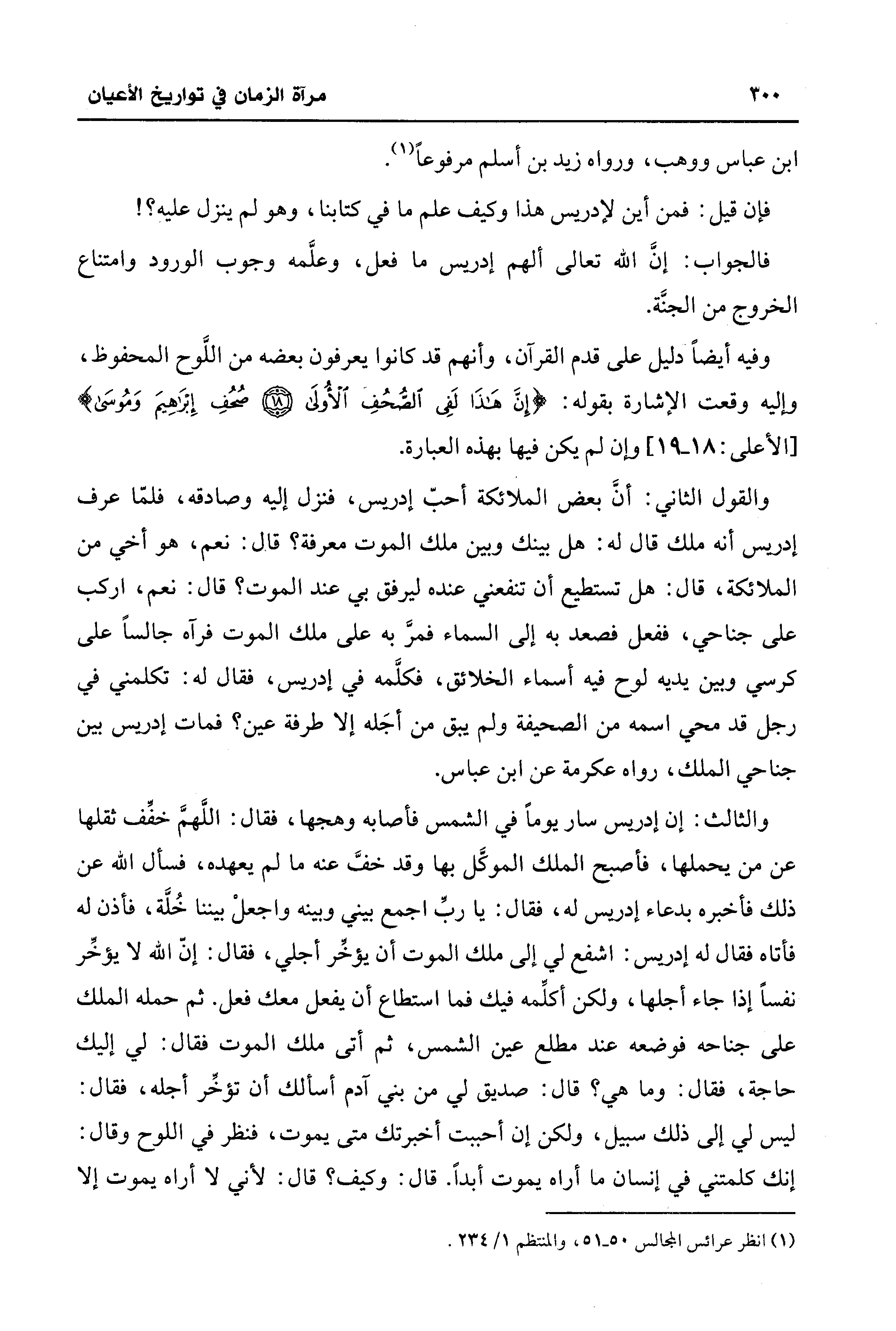 والثالث: إن إدريس سار يومًا في الشمس فأصابه وهجها، فقال: اللَّهم خفف ثقلها عن من يحملها، فأصبح الملك الموكَّل بها وقد خفَّ عنه ما لم يعهده، فسأل الله عن ذلك فأخبره بدعاء إدريس له، فقال: يا رث اجمع بيني وبينه واجعلْ بيننا خُلَّة، فأذن له فأتاه فقال له إدريس: اشفع لي إلى ملك الموت أن يؤخر أجلي، فقال: إنّ الله لا يؤخّر نفسًا إذا جاء أجلها، ولكن أكلِّمه فيك فما استطاع أن يفعل معك فعل. ثم حمله الملك على جناحه فوضعه عند مطلع عين الشمس، ثم أتى ملك الموت فقال: لي إليك حاجة، فقال. وما هي؟ قال: صديق لي من بني آدم أسالك أن تؤخّر أجله، فقال: ليس لي إلى ذلك سبيل، ولكن إن أحببت أخبرتك متى يموت، فنظر في اللوح وقال: إنك كلمتني في إنسان ما أراه يموت أبدًا. قال: وكيف؟ قال: لأني لا أراه يموت إلا
