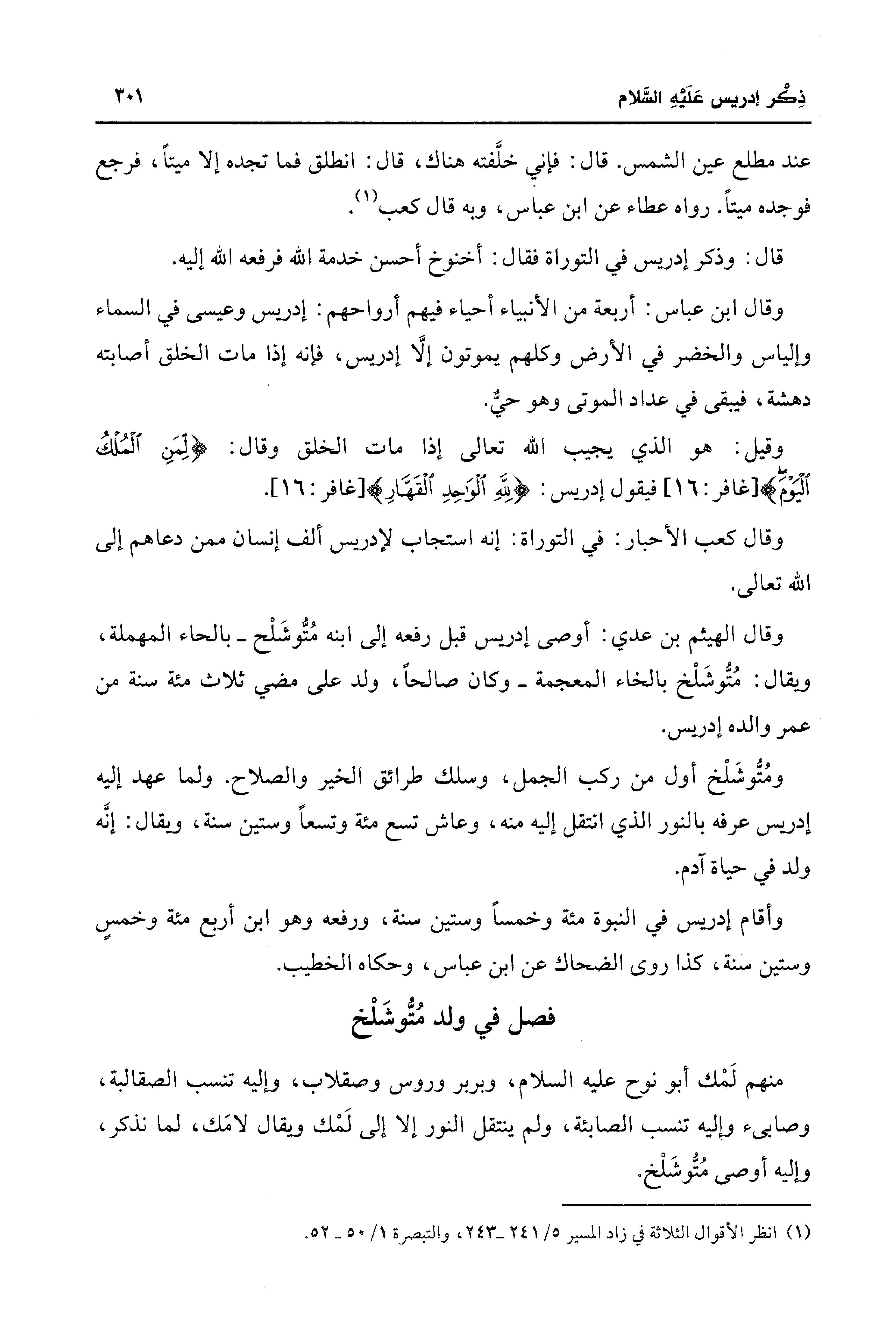 وأقام إدريس في النبوة مئة وخمسًا وستين سنة، ورفعه وهو ابن أربع مئة وخمسٍ وستين سنة، كذا روى الضحاك عن ابن عباس، وحكاه الخطيب.