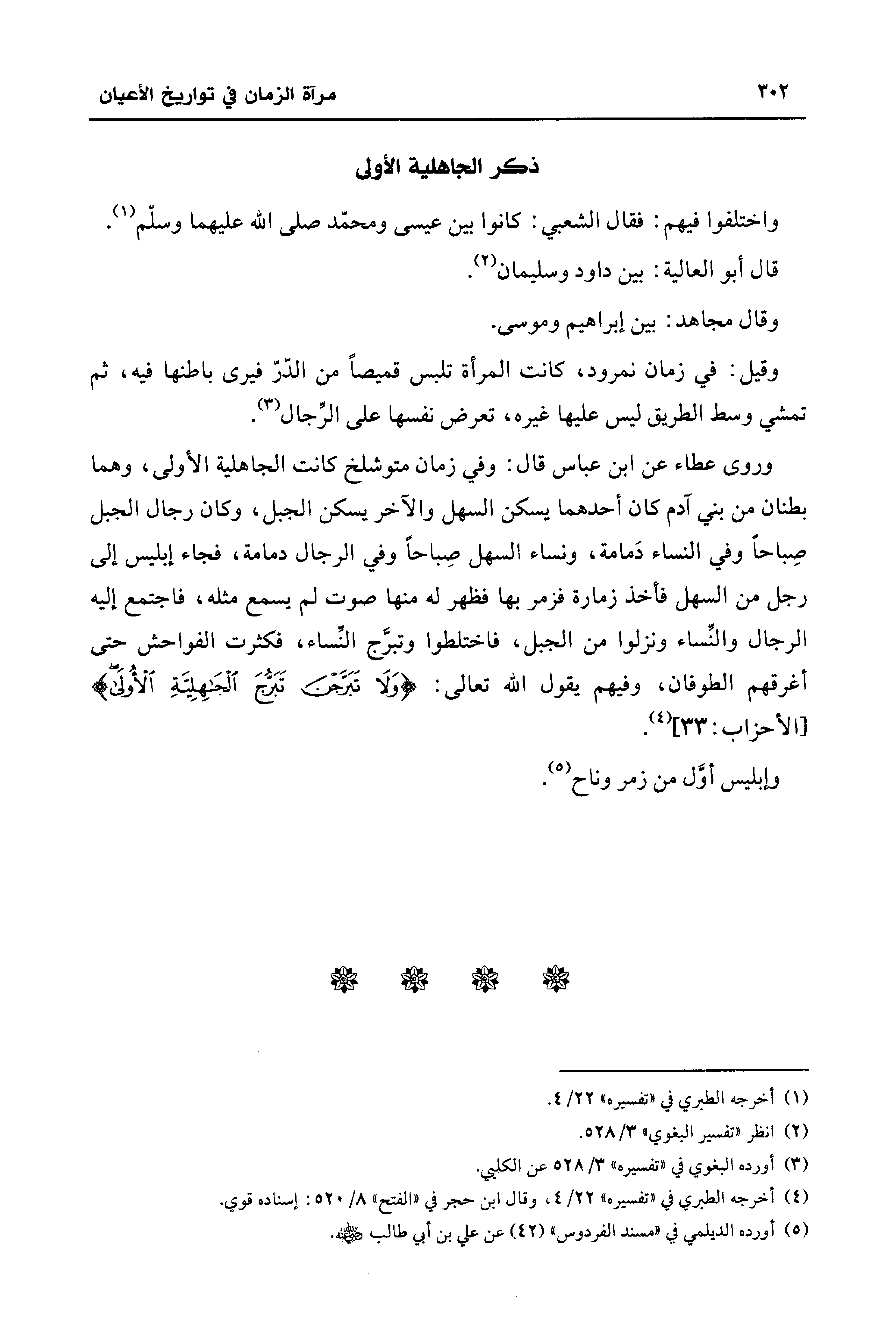 وروى عطاء عن ابن عباس قال: وفي زمان متوشلخ كانت الجاهلية الأولى، وهما بطنان من بني آدم كان أحدهما يسكن السهل والآخر يسكن الجبل، وكان رجال الجبل صِباحًا وفي النساء دَمامة، ونساء السهل صِباحًا وفي الرجال دمامة، فجاء إبليس إلى رجل من السهل فأخذ زمارة فزمر بها فظهر له منها صوت لم يسمع مثله، فاجتمع إليه الرجال والنِّساء ونزلوا من الجبل، فاختلطوا وتبرَّج النِّساء، فكثرت الفواحش حتى أغرقهم الطوفان، وفيهم يقول الله تعالى: {وَلَا تَبَرَّجْنَ تَبَرُّجَ الْجَاهِلِيَّةِ الْأُولَى} [الأحزاب: 33] (¬4).