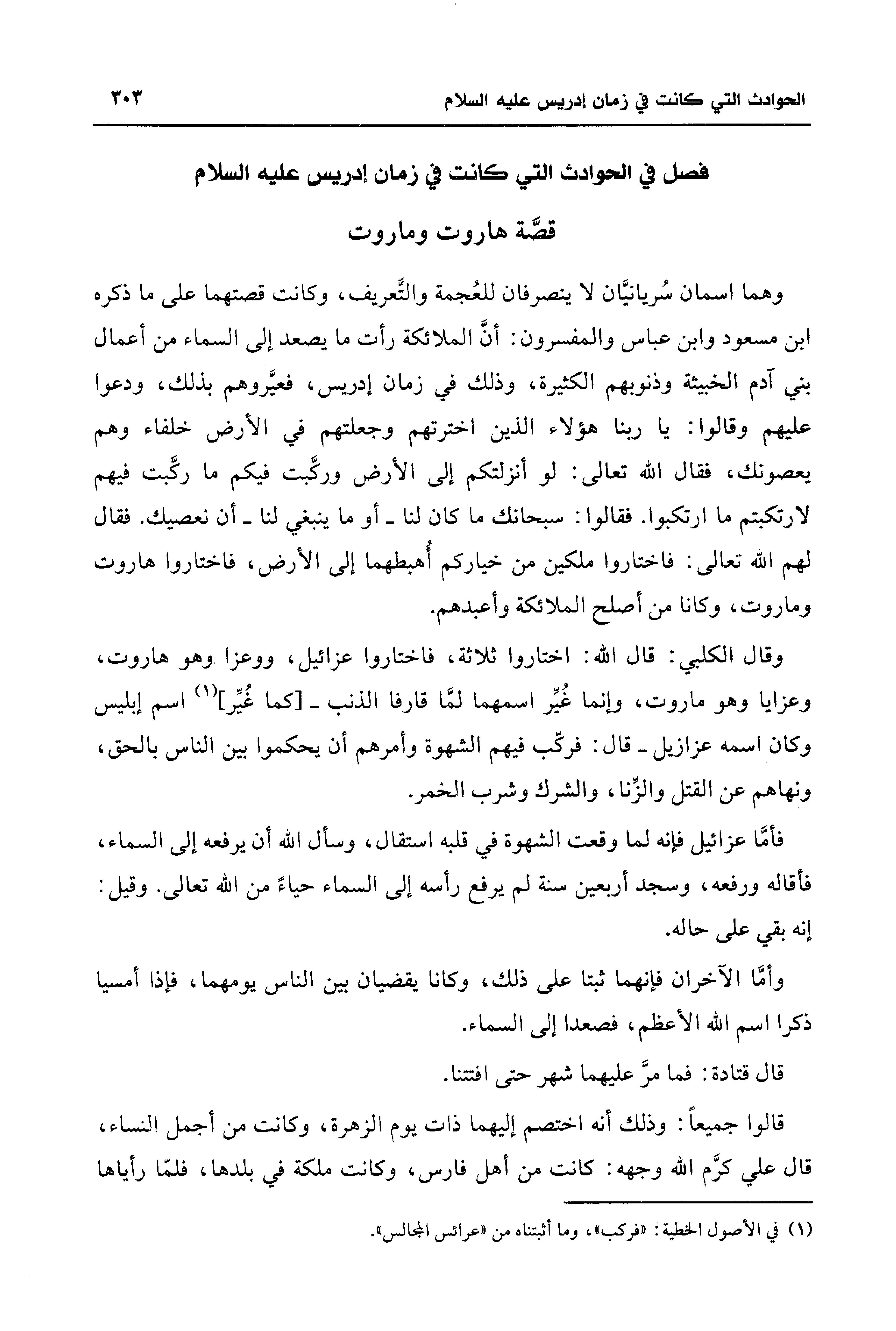 وقال الكلبي: قال الله: اختاروا ثلاثة، فاختاروا عزائيل، ووعزا وهو هاروت، وعزايا وهو ماروت، وإنما غُيِّر اسمهما لمَّا قارفا الذنب-[كما غُيِّر] (¬1) اسم إبليس وكان اسمه عزازيل- قال: فركّب فيهم الشهوة وأمرهم أن يحكموا بين الناس بالحق، ونهاهم عن القتل والزنا، والشرك وشرب الخمر.