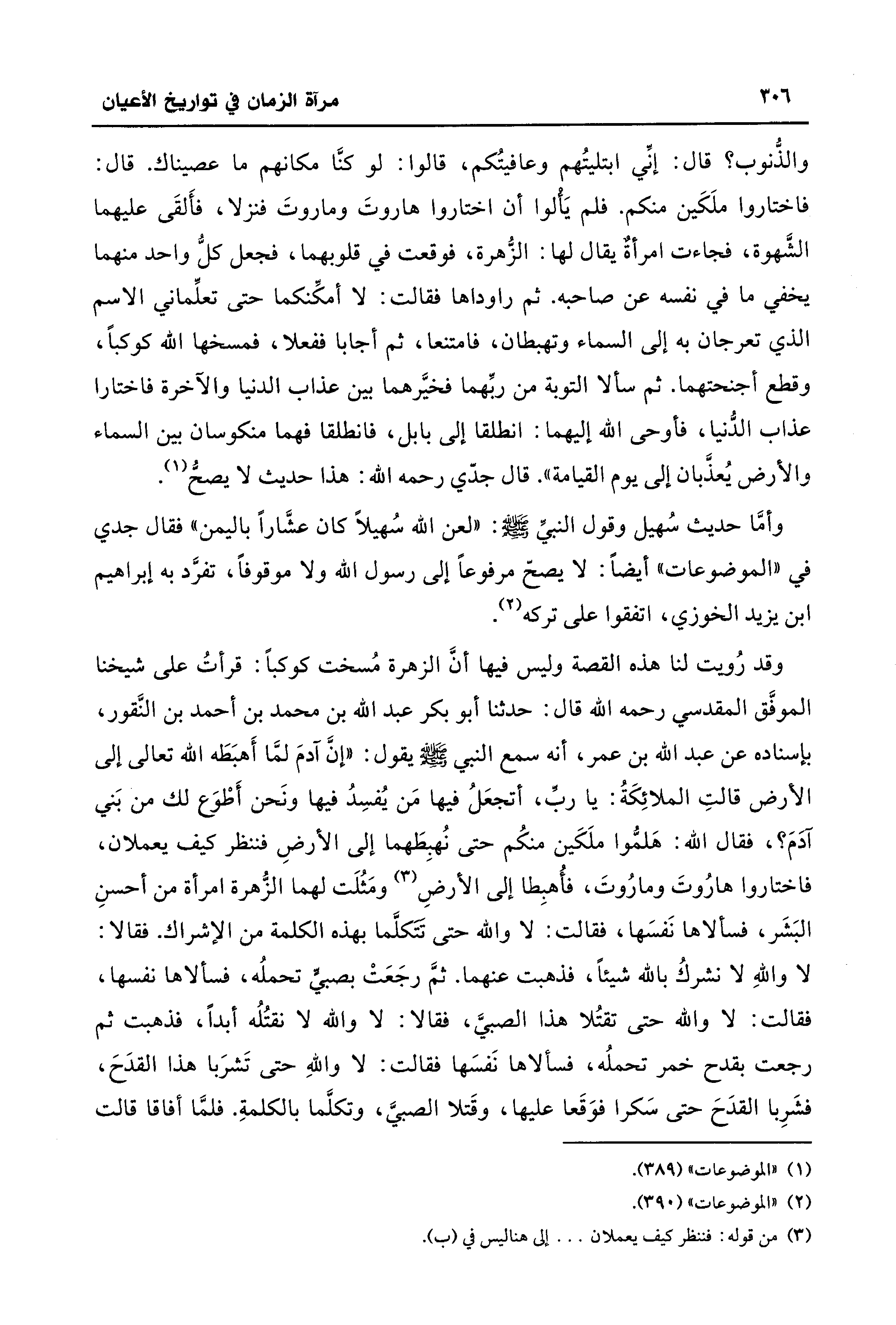 وقد رُويت لنا هذه القصة وليس فيها أنَّ الزهرة مُسخت كوكبًا: قرأتُ على شيخنا الموفَّق المقدسي رحمه الله قال: حدثنا أبو بكر عبد الله بن محمد بن أحمد بن النَّقور، بإسناده عن عبد الله بن عمر، أنه سمع النبي - صلى الله عليه وسلم - يقول: "إنَّ آدمَ لمَّا أَهبَطَه الله تعالى إلى الأرض قالتِ الملائِكَةُ: يا ربّ، أتجعَلُ فيها مَن يُفسِدُ فيها ونَحن أَطْوَع لك من بَني آدَمَ؟ ، فقال الله: هَلمُّوا ملَكَين منكُم حتى نُهبِطَهما إلى الأرضِ فننظر كيف يعملان، فاختاروا هارُوتَ ومارُوتَ، فأُهبِطا إلى الأرضِ (¬3) ومَثُلَت لهما الزهرة امرأة من أحسنِ البَشَر، فسألاها نَفسَها، فقالت: لا والله حتى تتَكلَّما بهذه الكلمة من الإشراك. فقالا: لا واللهِ لا نشركُ بالله شيئًا، فذهبت عنهما. ثم رجَعَتْ بصبي تحملُه، فسألاها نفسها، فقالت: لا والله حتى تقتُلا هذا الصبيَّ، فقالا: لا والله لا نقتُلُه أبدًا، فذهبت ثم رجعت بقدح خمر تحملُه، فسألاها نَفسَها فقالت: لا واللهِ حتى تَشرَبا هذا القدَحَ، فشَرِبا القدَحَ حتى سَكرا فوَقَعا عليها، وقَتلا الصبيَّ، وتكلَّما بالكلمةِ. فلمَّا أفاقا قالت