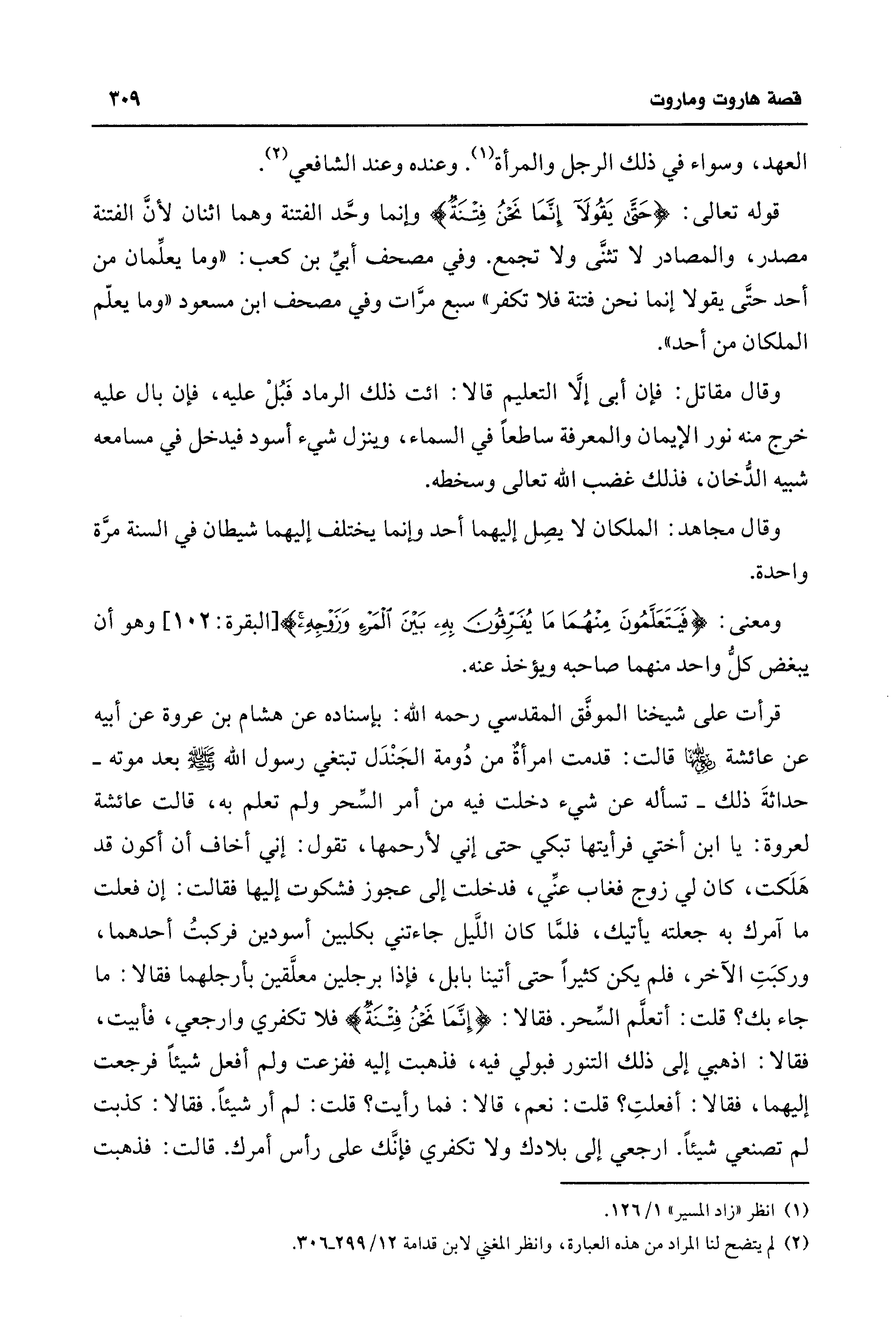 قرأت على شيخنا الموفق المقدسي رحمه الله: بإسناده عن هشام بن عروة عن أبيه عن عائشة - رضي الله عنها - قالت: قدمت امرأةٌ من دُومة الجَنْدَل تبتغي رسول الله - صلى الله عليه وسلم - بعد موته -حداثةَ ذلك- تسأله عن شيء دخلت فيه من أمر السحر ولم تعلم به، قالت عائشة لعروة: يا ابن أختي فرأيتها تبكي حتى إني لأرحمها، تقول: إني أخاف أن أكون قد هَلَكت، كان لي زوج فغاب عنِّي، فدخلت إلى عجوز فشكوت إليها فقالت: إن فعلت ما آمرك به جعلته يأتيك، فلما كان اللَّيل جاءتني بكلبين أسودين فركبتُ أحدهما، وركبَتِ الآخر، فلم يكن كثيرًا حتى أتينا بابل، فإذا برجلين معلَّقين بأرجلهما فقالا: ما جاء بك؟ قلت: أتعلَّم السِّحر. فقالا: {إِنَّمَا نَحْنُ فِتْنَةٌ} فلا تكفري وارجعي، فأبيت، فقالا: اذهبي إلى ذلك التنور فبولي فيه، فذهبت إليه ففزعت ولم أفعل شيئًا فرجعت إليهما، فقالا: أفعلتِ؟ قلت: نعم، قالا: فما رأيت؟ قلت: لم أر شيئًا. فقالا: كذبت لم تصنعي شيئًا. ارجعي إلى بلادك ولا تكفري فإنَّك على رأس أمرك. قالت: فذهبت