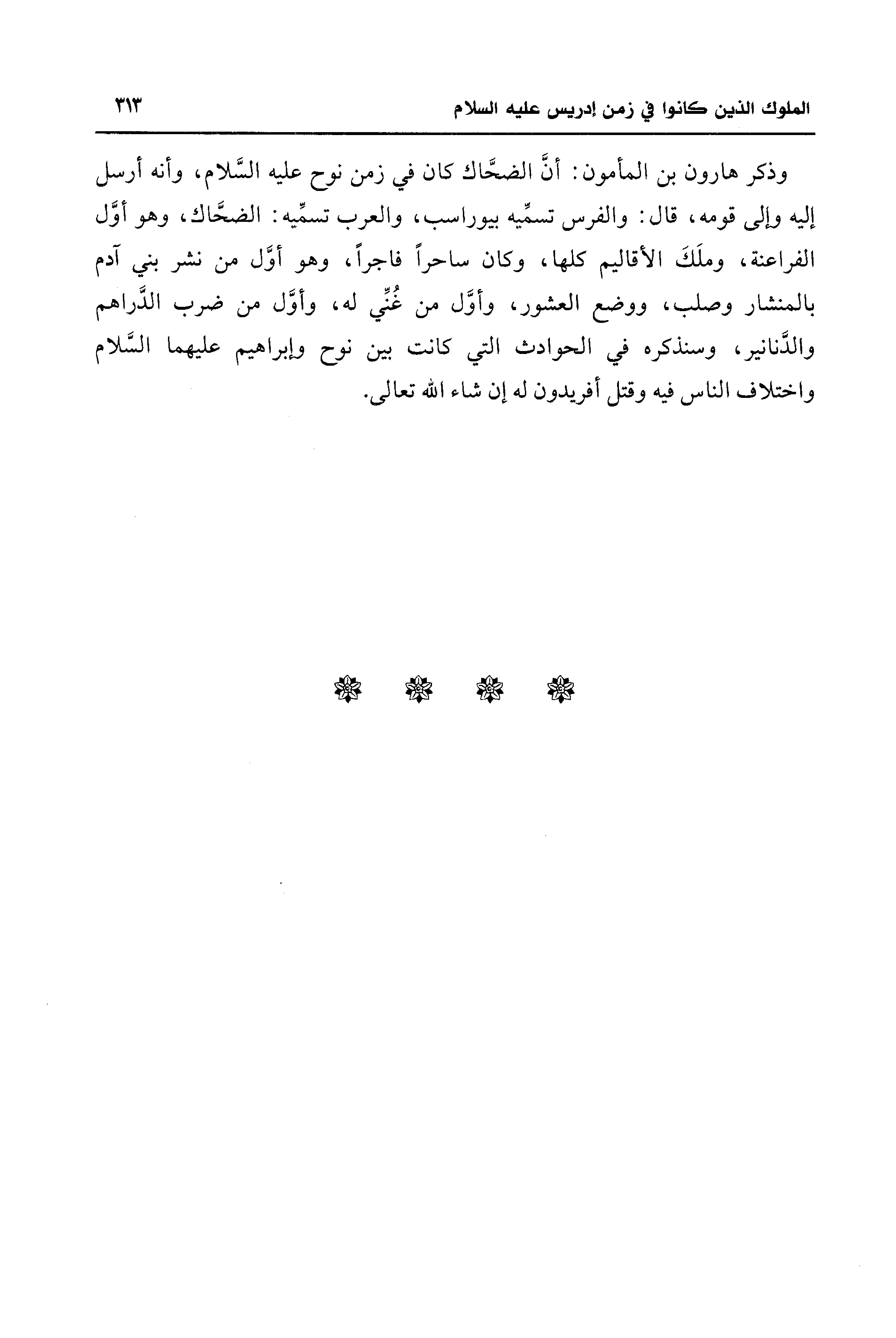 وذكر هارون بن المأمون: أنَّ الضحَّاك كان في زمن نوح عليه السَّلام، وأنه أرسل إليه وإلى قومه، قال: والفرس تسمِّيه بيوراسب، والعرب تسمِّيه: الضحَّاك، وهو أوَّل الفراعنة، وملَكَ الأقاليم كلها، وكان ساحرًا فاجرًا، وهو أوَّل من نشر بني آدم بالمنشار وصلب، ووضع العشور، وأوَّل من غُنِّي له، وأوَّل من ضرب الدَّراهم والدَّنانير، وسنذكره في الحوادث التي كانت بين نوح وإبراهيم عليهما السَّلام واختلاف الناس فيه وقتل أفريدون له إن شاء الله تعالى.
