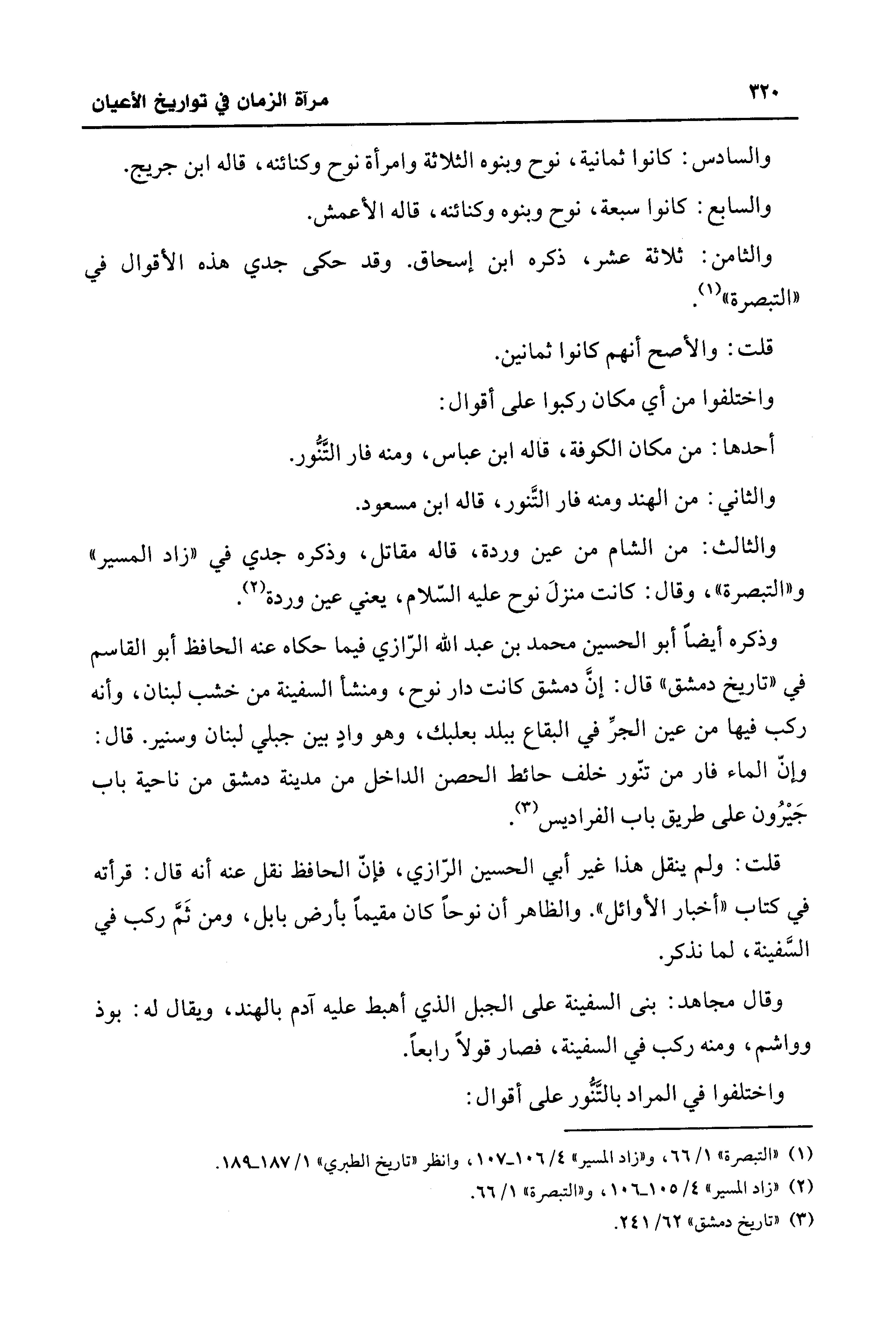 وذكره أيضًا أبو الحسين محمد بن عبد الله الرّازي فيما حكاه عنه الحافظ أبو القاسم في "تاريخ دمشق" قال: إنَّ دمشق كانت دار نوح، ومنشأ السفينة من خشب لبنان، وأنه ركب فيها من عين الجر في البقاع ببلد بعلبك، وهو واد بين جبلي لبنان وسنير. قال: وإنّ الماء فار من تنّور خلف حائط الحصن الداخل من مدينة دمشق من ناحية باب جَيرُون على طريق باب الفراديس (¬3).