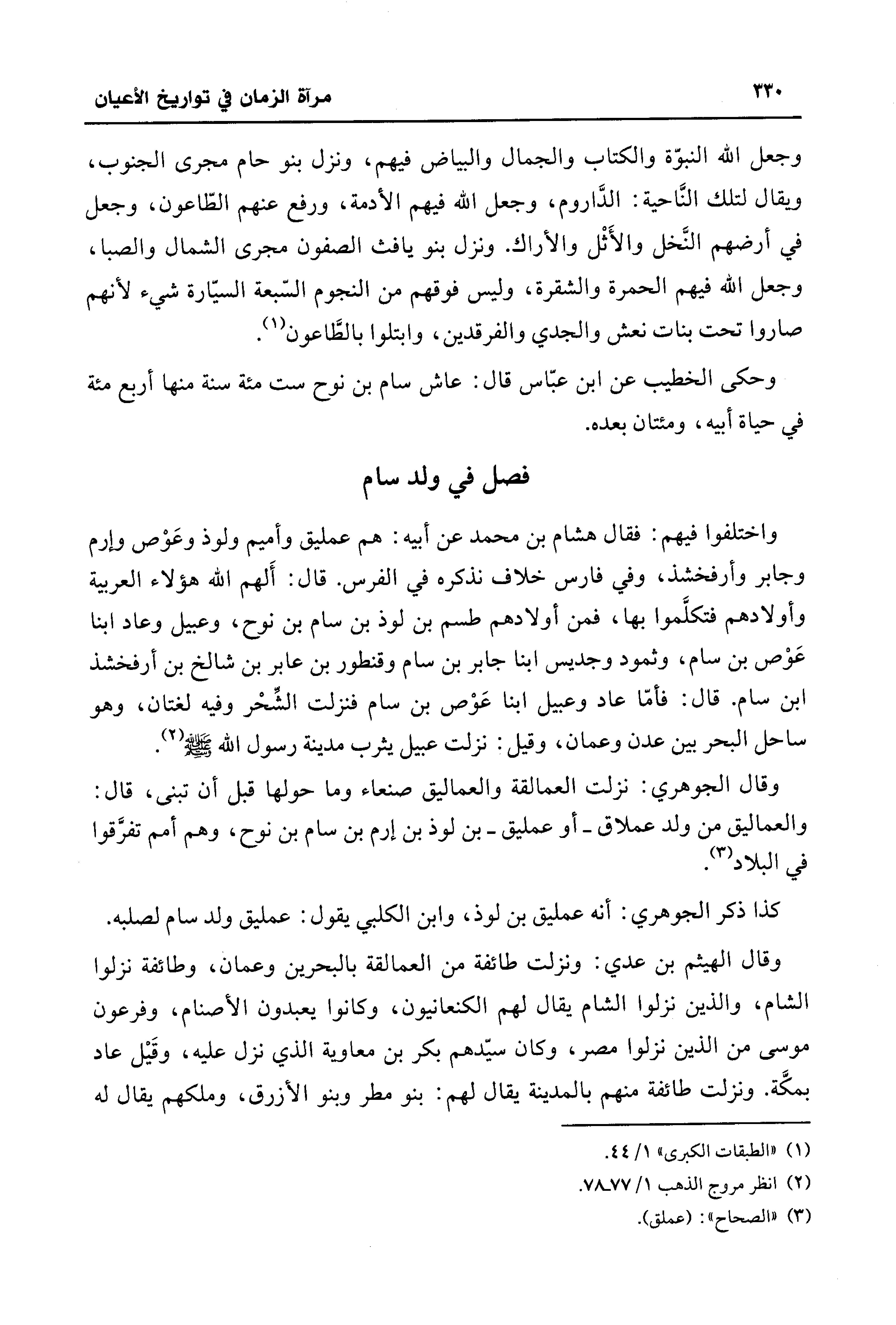 واختلفوا فيهم: فقال هشام بن محمد عن أبيه: هم عمليق وأميم ولوذ وعَوْص وإرم وجابر وأرفخشذ، وفي فارس خلاف نذكره في الفرس. قال: أَلهم الله هؤلاء العربية وأولادهم فتكلَّموا بها، فمن أولادهم طسم بن لوذ بن سام بن نوح، وعبيل وعاد ابنا عَوْص بن سام، وثمود وجديس ابنا جابر بن سام وقنطور بن عابر بن شالخ بن أرفخشذ بن سام. قال: فأمّا عاد وعبيل ابنا عَوْص بن سام فنزلت الشِّحْر وفيه لغتان، وهو ساحل البحر بين عدن وعمان، وقيل: نزلت عبيل يثرب مدينة رسول الله - صلى الله عليه وسلم - (¬2).